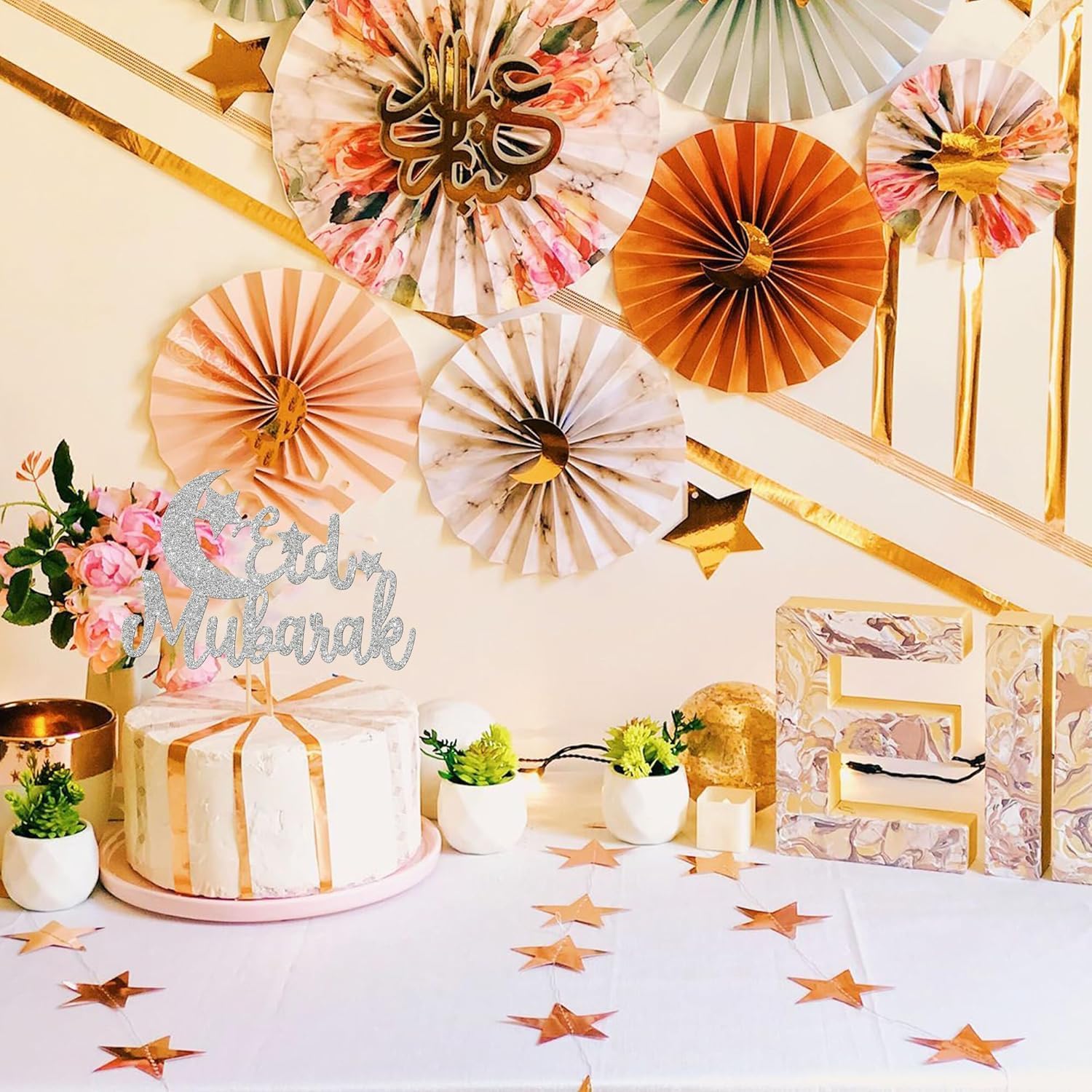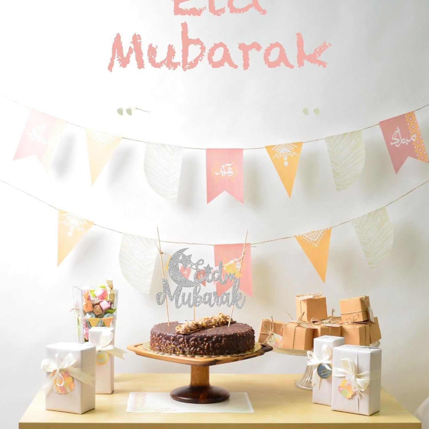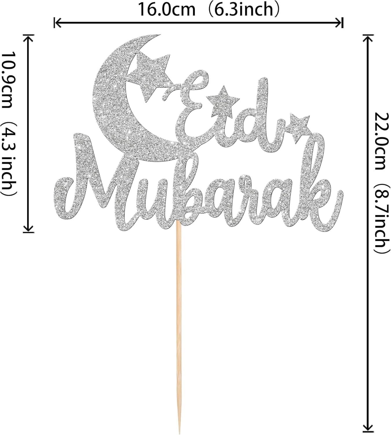 Decorazione per torta Eid: unica e dal design accattivante, realizzata in cartone scintillante e bastoncini di carta per alimenti che possono essere inseriti in modo sicuro nella torta, adatti per decorazioni per feste per le celebrazioni dell'Eid. DESIGN UNICO: topper per torta Eid Mubarak, la decorazione squisita rende la tua torta accattivante. Facile da usare: le decorazioni per torta vengono assemblate in anticipo, inserite nella torta e regolate all'altezza appropriata per ottenere risultati migliori. Torta Eid: adatta per decorare torte, muffin, piatti di frutta, dessert, ecc., Può rendere la torta più deliziosa, un must per la decorazione della tavola di una festa musulmana del Ramadan! Occasioni applicabili: questo cake topper è perfetto per feste a tema Eid, feste a tema Ramadan e decorazioni per torte per feste musulmane islamiche.