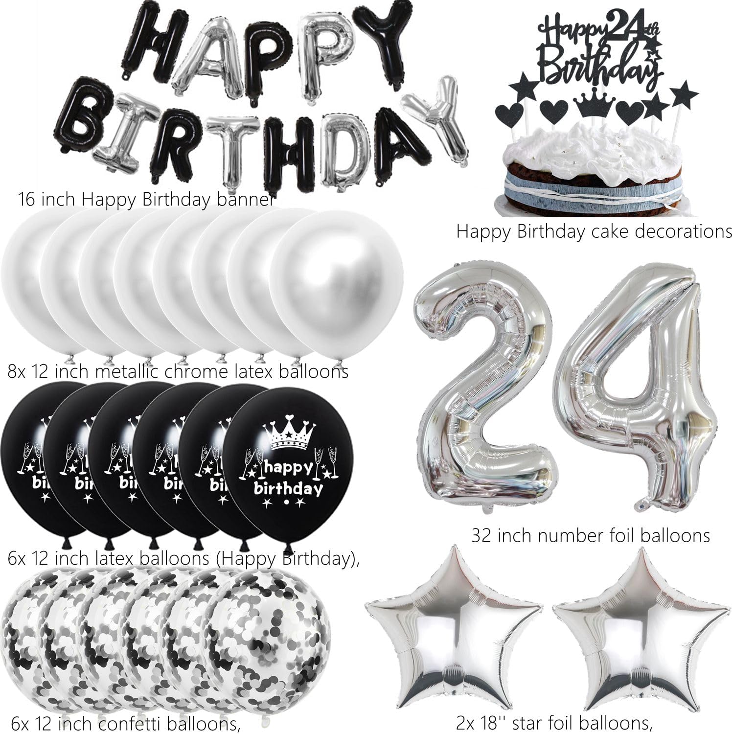🌻Decorazione nera per il 24° compleanno: palloncini in plastica numero 24 da 32 pollici, 1 set di topper per torta Happy 24th Birthday, 1 set di banner Happy Birthday, 6 palloncini in lattice da 12 pollici (Happy Birthday), 8 palloncini in lattice cromato metallizzato da 12 pollici, 6 palloncini coriandoli da 12 pollici, 2 palloncini a stella foil da 18, 1 palloncino a nastro. 🎉Materiale Premium - La nostra ghirlanda per il 24° compleanno è realizzata in cartone spesso di alta qualità ed è durevole. E i palloncini per il 24esimo compleanno per ragazzi e ragazze sono realizzati in un foglio di alluminio di alta qualità e lattice resistente, sono robusti e riutilizzabili. Supportati da aria o elio, rimangono gonfiati a lungo e possono essere utilizzati tranquillamente vicino ai bambini. 🌻Topper per torta nero per il 24° compleanno: questi toppers per torta sono realizzati con materiali ecocompatibili per uso alimentare, durevoli e resistenti, non facili da deformare o rompere. Adatto per decorare torte, cupcake, muffin, gelatine, pane, frutta, ecc. 🎉Ottimo per tutte le occasioni: perfetto per l'arredamento del 24esimo compleanno. Ornamenti utilizzati per la decorazione della festa di 24 anni, per celebrare i momenti importanti della tua vita con la tua famiglia e i tuoi amici. Puoi anche appenderli al soffitto, al muro o ai rami del giardino per decorare anche il tavolo dei dolci. 🌻Garanzia di soddisfazione al 100%: se hai qualche problema con il tuo prodotto, contattaci per un risarcimento.