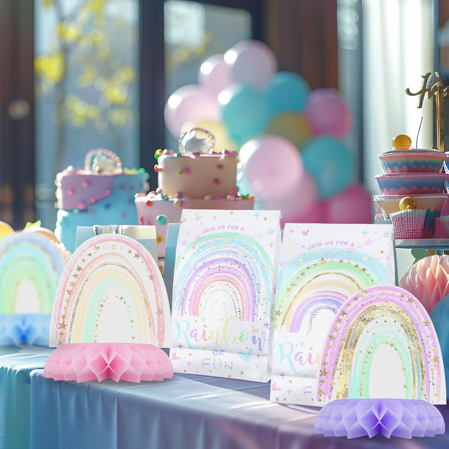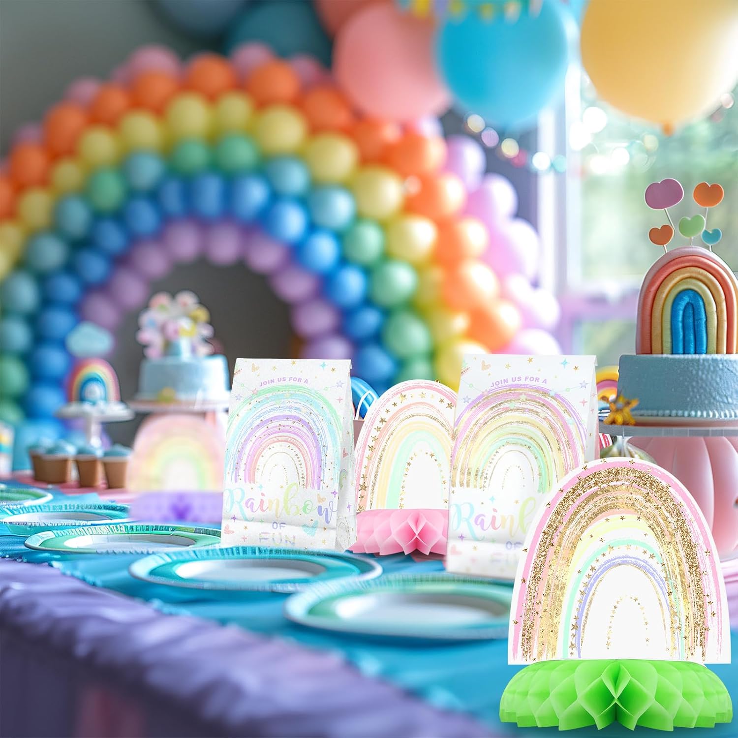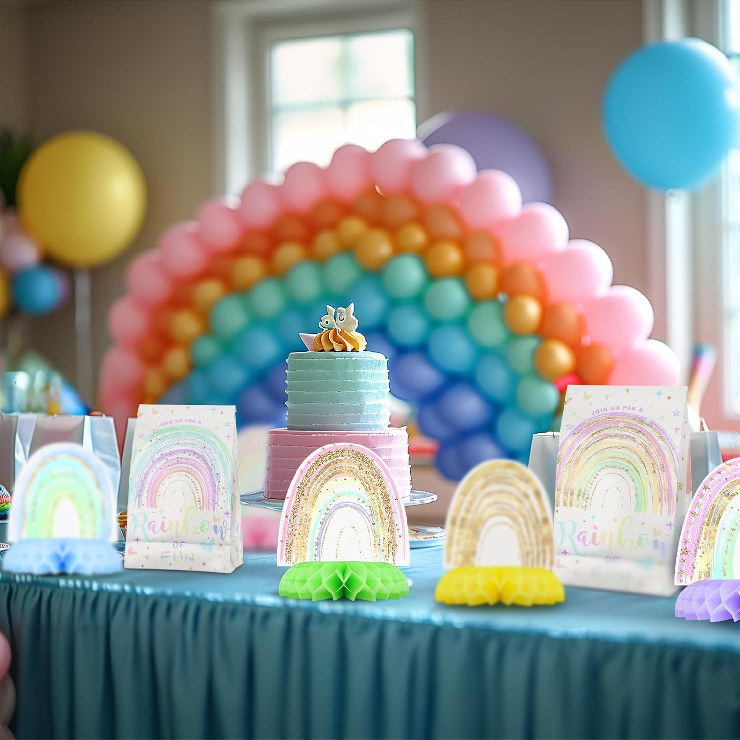 Affascinanti decorazioni per feste arcobaleno: eleva la tua festa con queste affascinanti decorazioni da tavola arcobaleno! Ideali per compleanni dei bambini o baby shower, questi disegni colorati aggiungeranno un tocco speciale e creeranno ricordi duraturi. Set all-inclusive: questo set completo comprende 9 topper da tavola arcobaleno. Si abbina perfettamente ad altre decorazioni a tema arcobaleno per una celebrazione memorabile! Materiali di alta qualità: realizzati in cartoncino resistente su entrambi i lati e robuste sfere a nido d'ape, questi centrotavola arcobaleno sono costruiti per durare. Possono essere riutilizzati per varie celebrazioni! Montaggio facile e veloce: assembla l'arredamento della tua festa in pochi minuti con questi topper arcobaleno facili da usare. Basta attaccare il nido d'ape al biglietto, aprire il supporto e posizionarlo dove vuoi. L'allestimento della festa non è mai stato così facile! Decorazione multiuso per feste arcobaleno: perfetta per festival, tavoli creativi, oggetti di scena fotografici, compleanni, feste per bambini, riunioni di famiglia ed eventi a tema arcobaleno. Questi deliziosi centrotavola arcobaleno a nido d'ape portano un'atmosfera stravagante e incantevole in ogni occasione