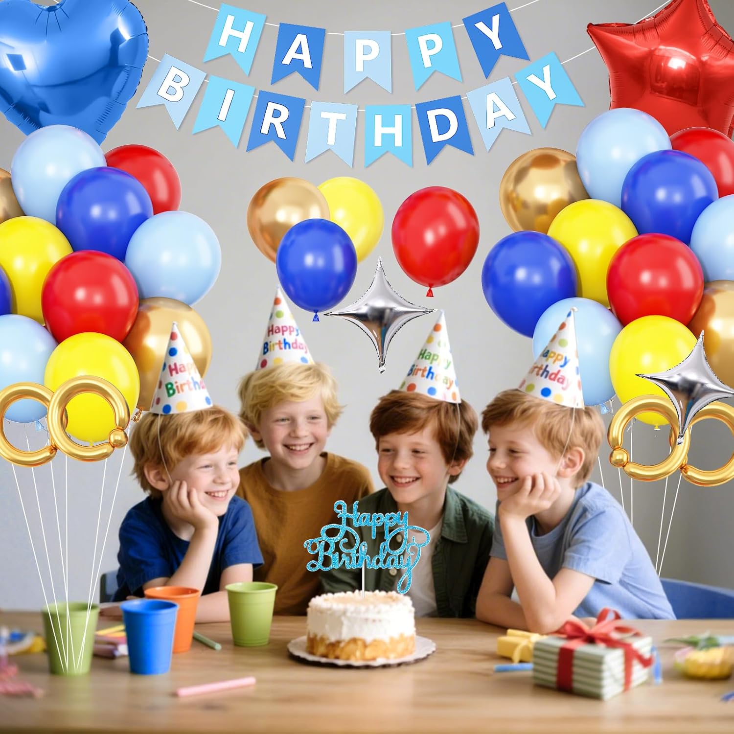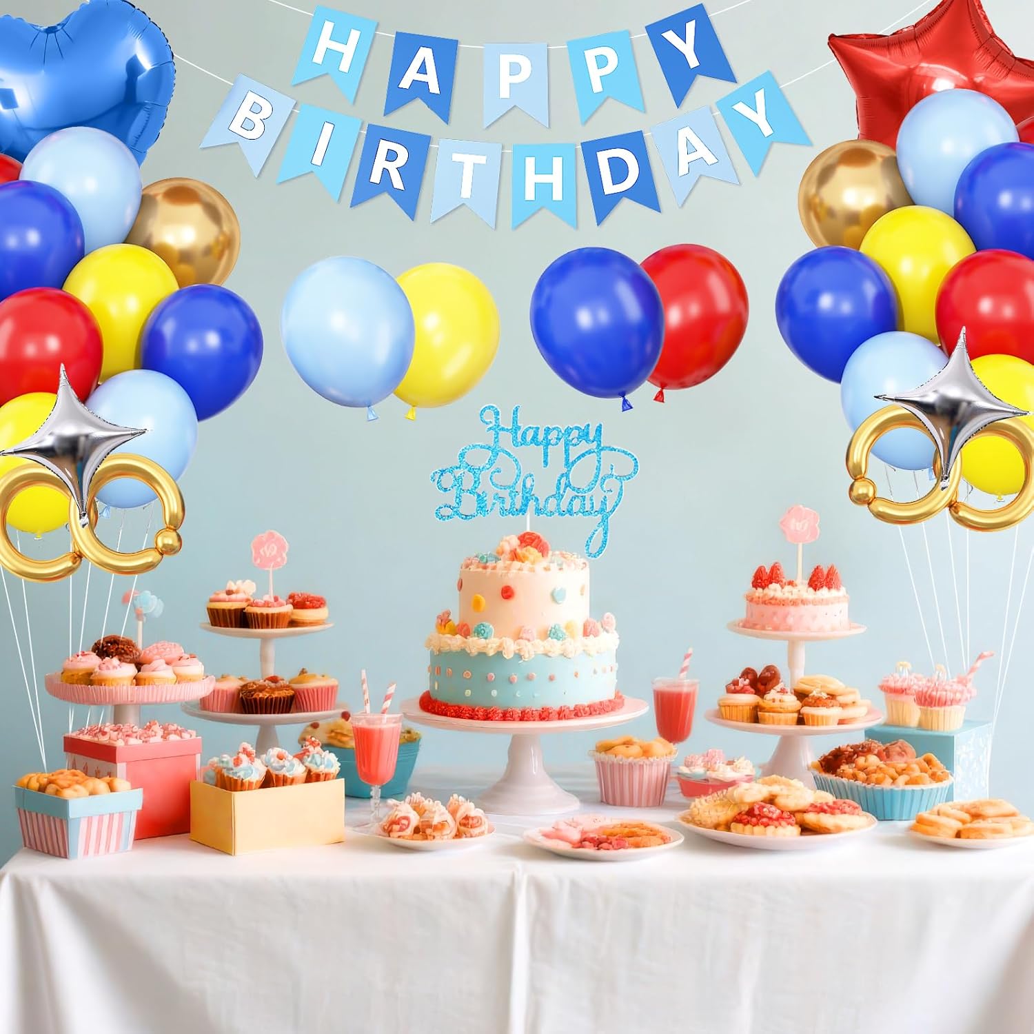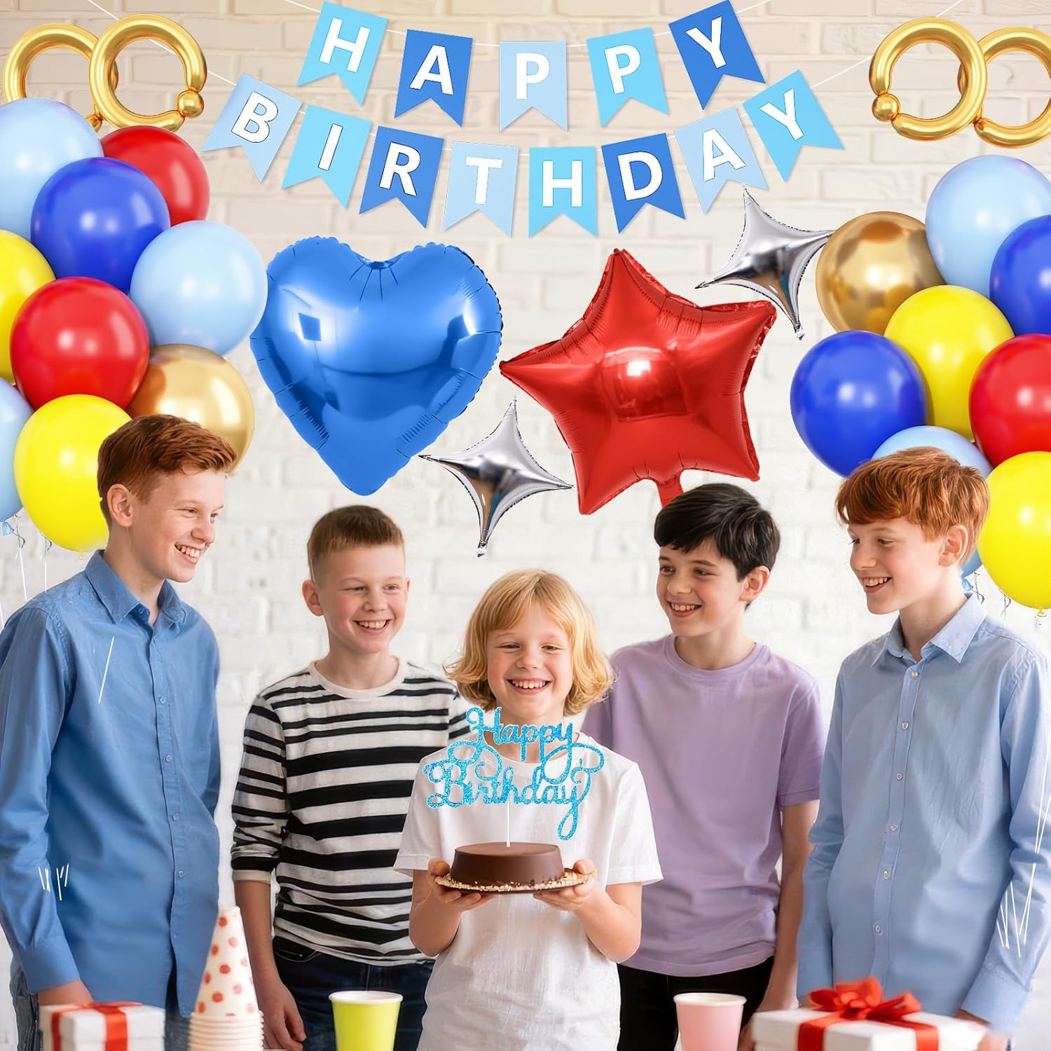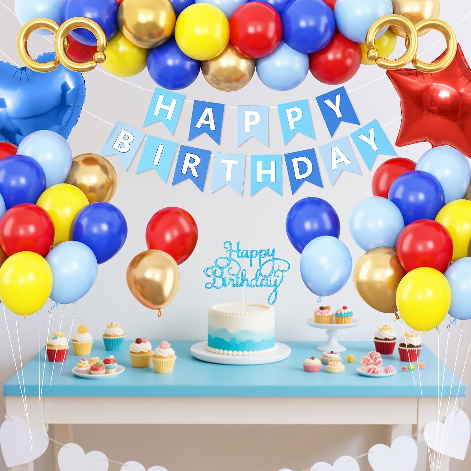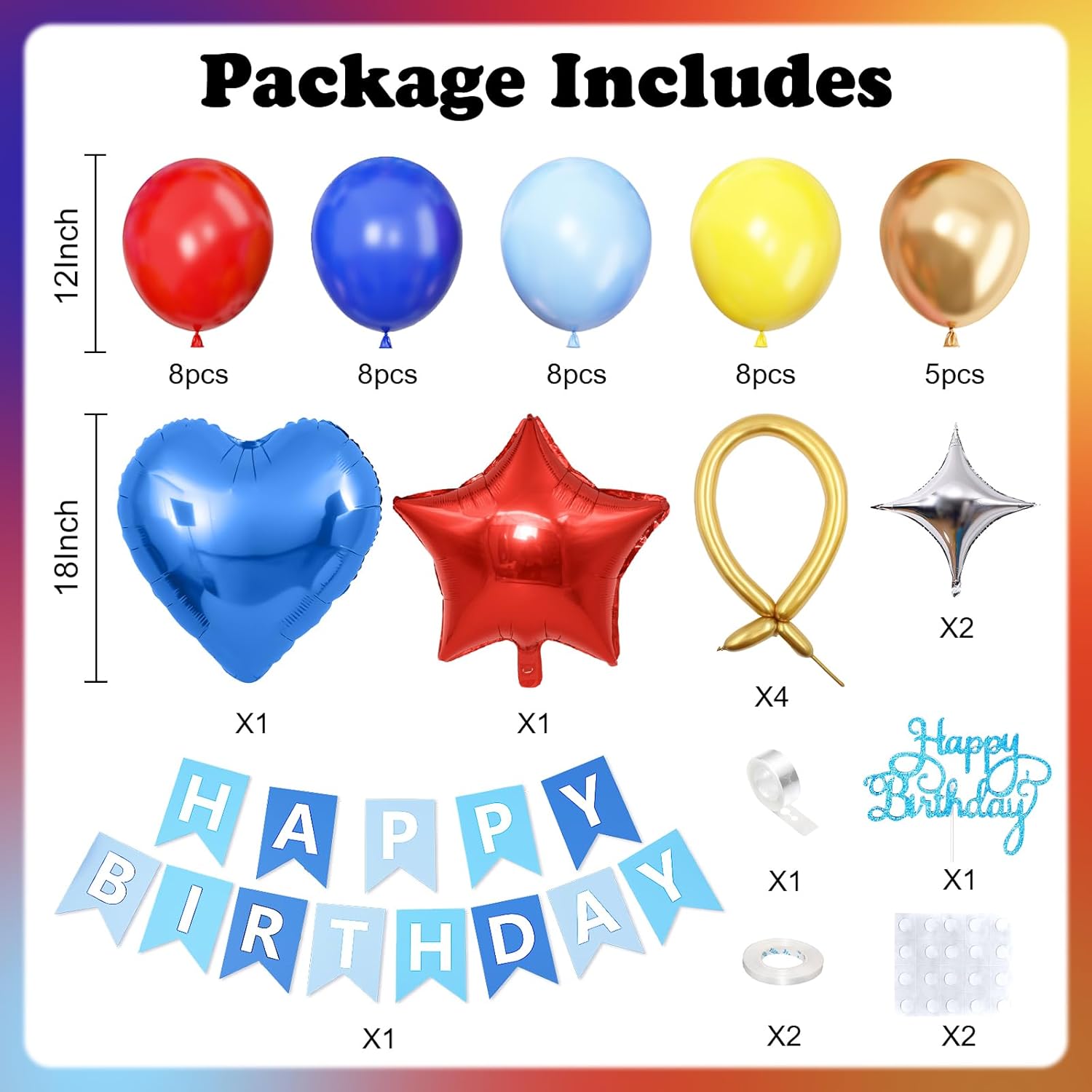La decorazione di compleanno rossa, blu e oro include: 37 palloncini in lattice da 12" (8 palloncini rossi, 8 palloncini blu navy, 8 palloncini gialli, 8 palloncini blu, 5 palloncini dorati metallizzati), 4 palloncini lunghi dorati, 1 palloncino stella rossa da 18", 1 palloncino foil a cuore blu da 18", 2 palloncini foil argento da 10", 1 decorazione per torta di compleanno, 1 decorazione per torta di compleanno, 1 striscione di compleanno per PC, 2 nastri (10 m), 1 striscia ad arco per palloncini, 2 cerchi adesivi. Materiale premium: le decorazioni di compleanno in rosso, blu e giallo oro sono durevoli e resistenti allo scoppio. Per ridurre il rischio di scoppio, è meglio gonfiare i palloncini fino a circa l'85% della loro dimensione normale. I palloncini in alluminio sono dotati di una cannuccia per un facile gonfiaggio e sgonfiaggio. Mentre lo striscione di compleanno e il cake topper hanno una finitura premium, garantendo che durino per tutto l'evento. Versatili e facili da configurare: queste decorazioni per feste di compleanno sono semplici da montare. Gonfia i palloncini, appendi lo striscione Happy Birthday e disponi le decorazioni di compleanno con cuore, stella e altri palloncini per creare un'affascinante decorazione di compleanno. Non sono necessari strumenti o competenze speciali: un ottimo modo per preparare decorazioni di compleanno per feste di ragazze, ragazzi, donne e uomini. Design unico ed elegante: con una varietà di palloncini in lattice, palloncini in alluminio, striscioni di compleanno luminosi, decorazioni per torte di compleanno, questa decorazione di compleanno dona alla festa un'atmosfera giocosa ma elegante. Una scelta ponderata per decorazioni di compleanno che aggiungono gioia e personalità al grande giorno. Servizio soddisfacente: ci impegniamo a fornirti un buon servizio. Se hai dubbi sull'utilizzo delle decorazioni con palloncini compleanno, cercheremo di risolverli