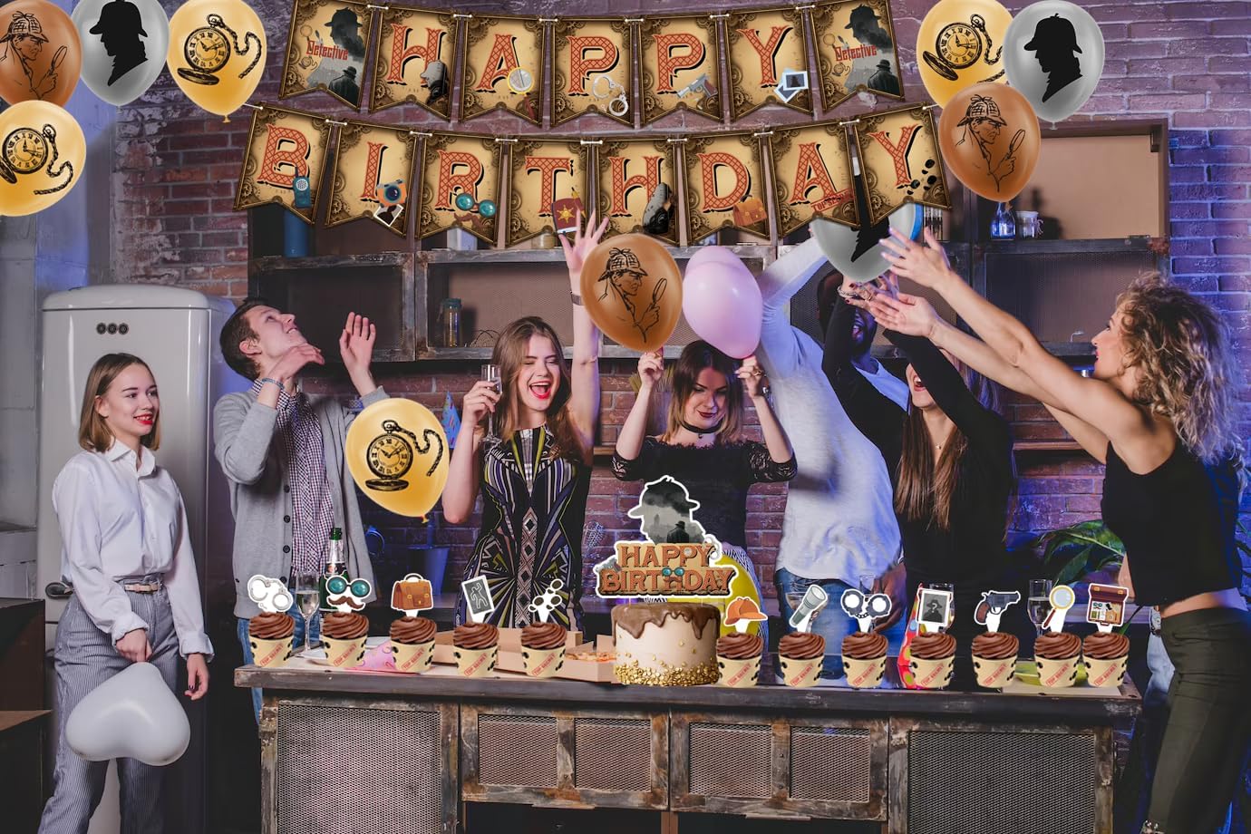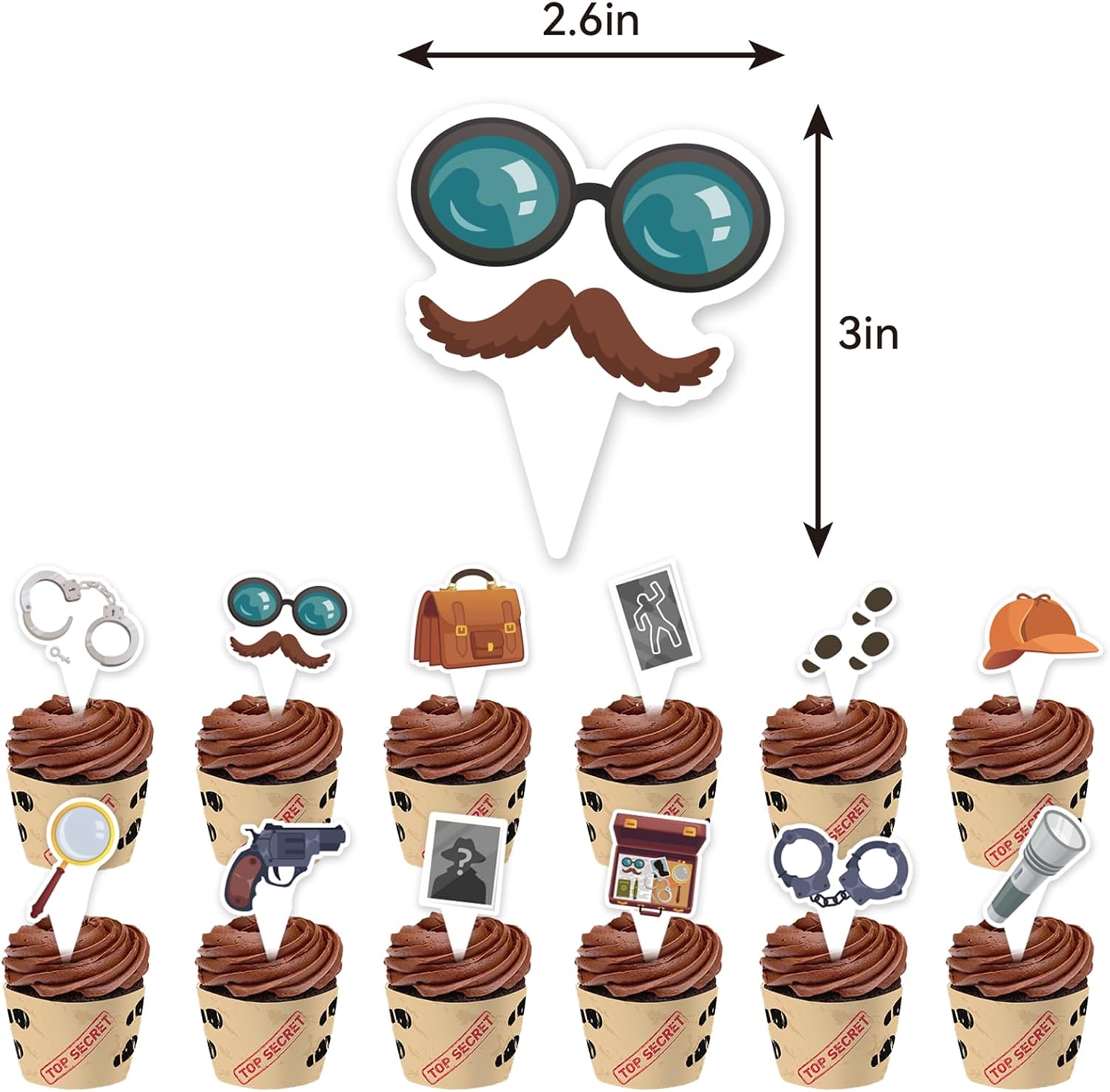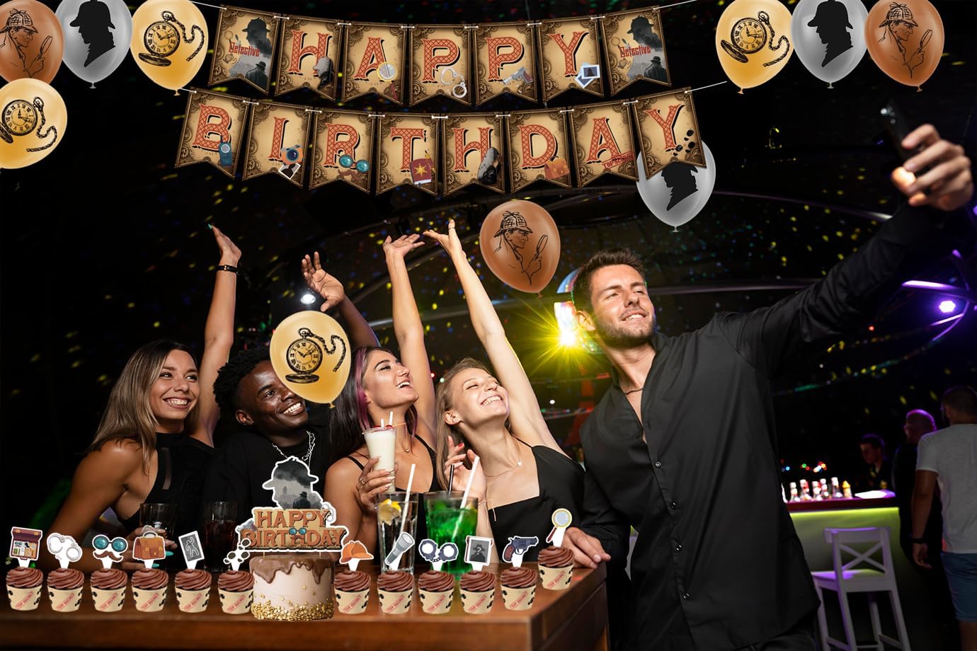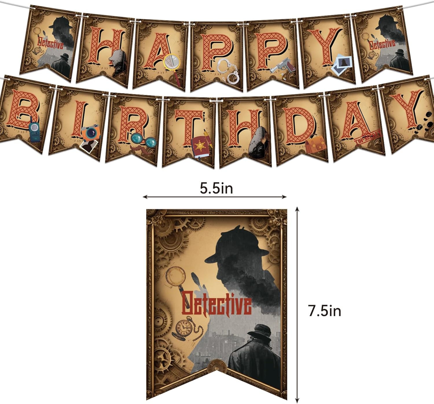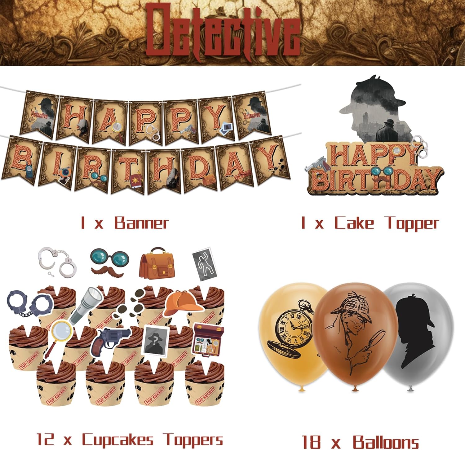Include: 1 striscione rilevatore di buon compleanno, 1 decorazione per torta di buon compleanno, 12 decorazioni per cupcake, 18 palloncini detective. Quantità sufficiente per soddisfare le tue esigenze di decorazione. Design unico: la nostra festa a tema detective è progettata con molti elementi classici da detective, come lenti d'ingrandimento, foto, manette, foto, impronte, macchine fotografiche, occhiali e modelli di barba finta, penne, quaderni, talkie, torce elettriche, cappelli da detective, orologi da tasca, oggetti segreti da detective e parole top secret, che aggiungono una forte atmosfera di festa alla nostra festa a tema detective e attireranno rapidamente l'attenzione. Materiale personale: la bandiera del detective e i toppers per torta sono fatti di cartone resistente, i palloncini del detective sono fatti di lattice, tutti i materiali sono ecologici, robusti e riutilizzabili, leggeri, facili da trasportare e riporre. Facile da montare: gli striscioni detective sono preassemblati e non richiedono il montaggio manuale. Basta rimuoverli dalla confezione e appenderli al soffitto, alle pareti, alle finestre, alle porte, ai rami e ad altri luoghi che desideri decorare. Occasioni: perfette per feste di compleanno di detective, feste a tema detective del 1920, feste a tema retrò, feste a tema detective, Halloween, feste con spettacoli teatrali, decorazioni per la casa, giochi di ruolo e altre attività al chiuso o all'aperto.
