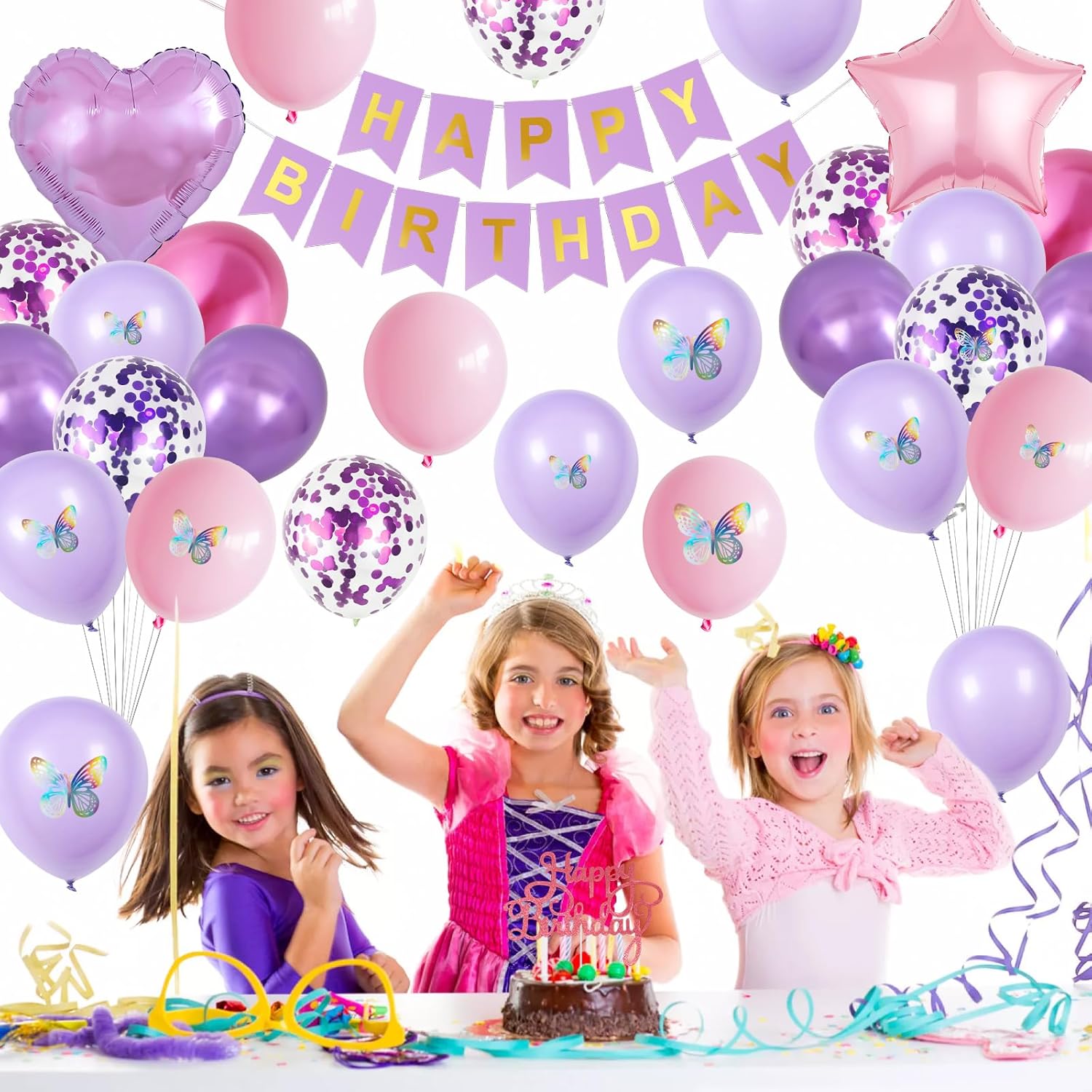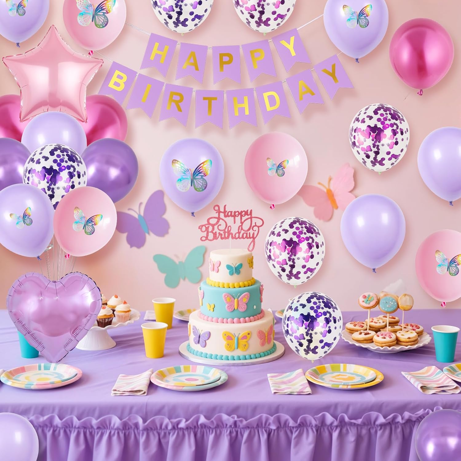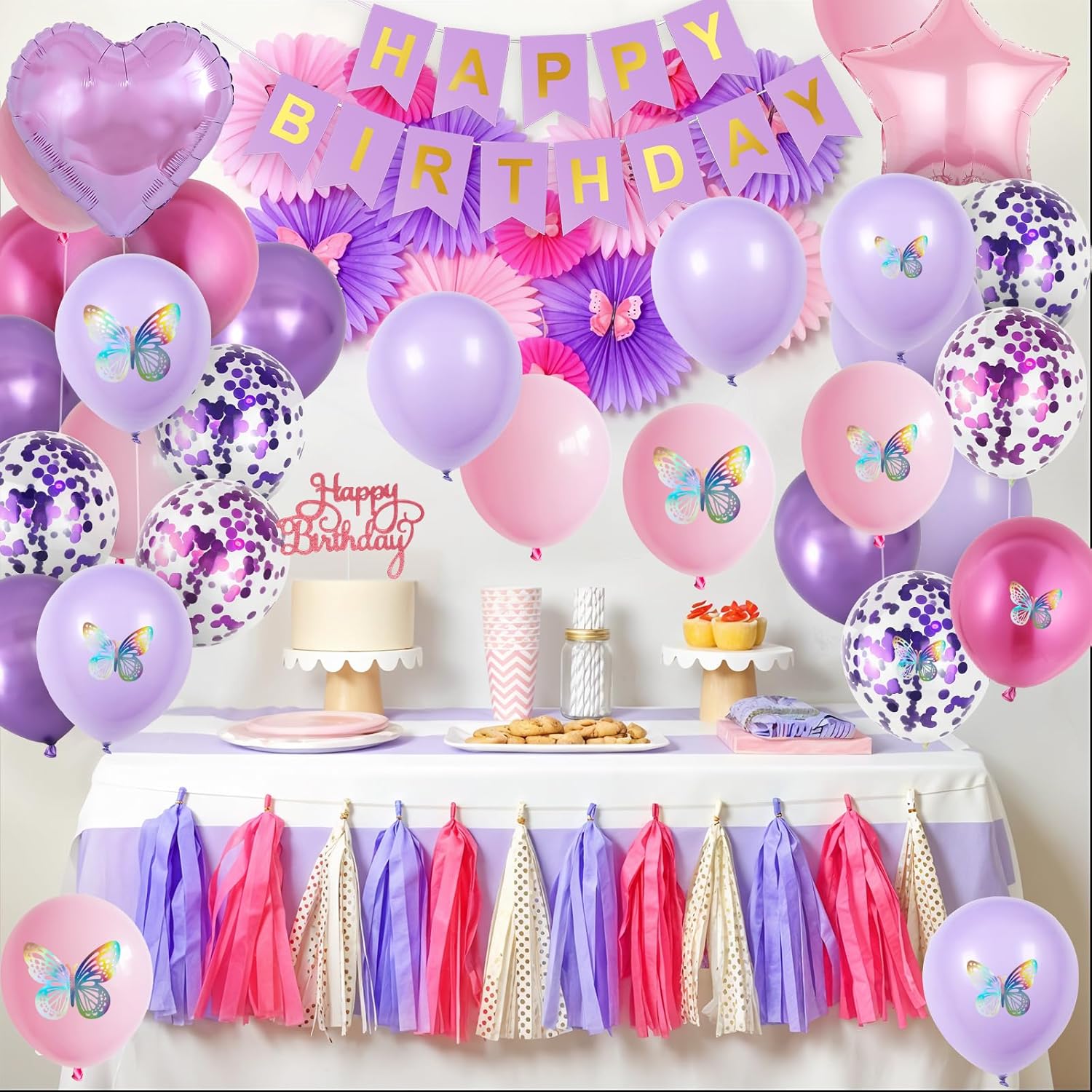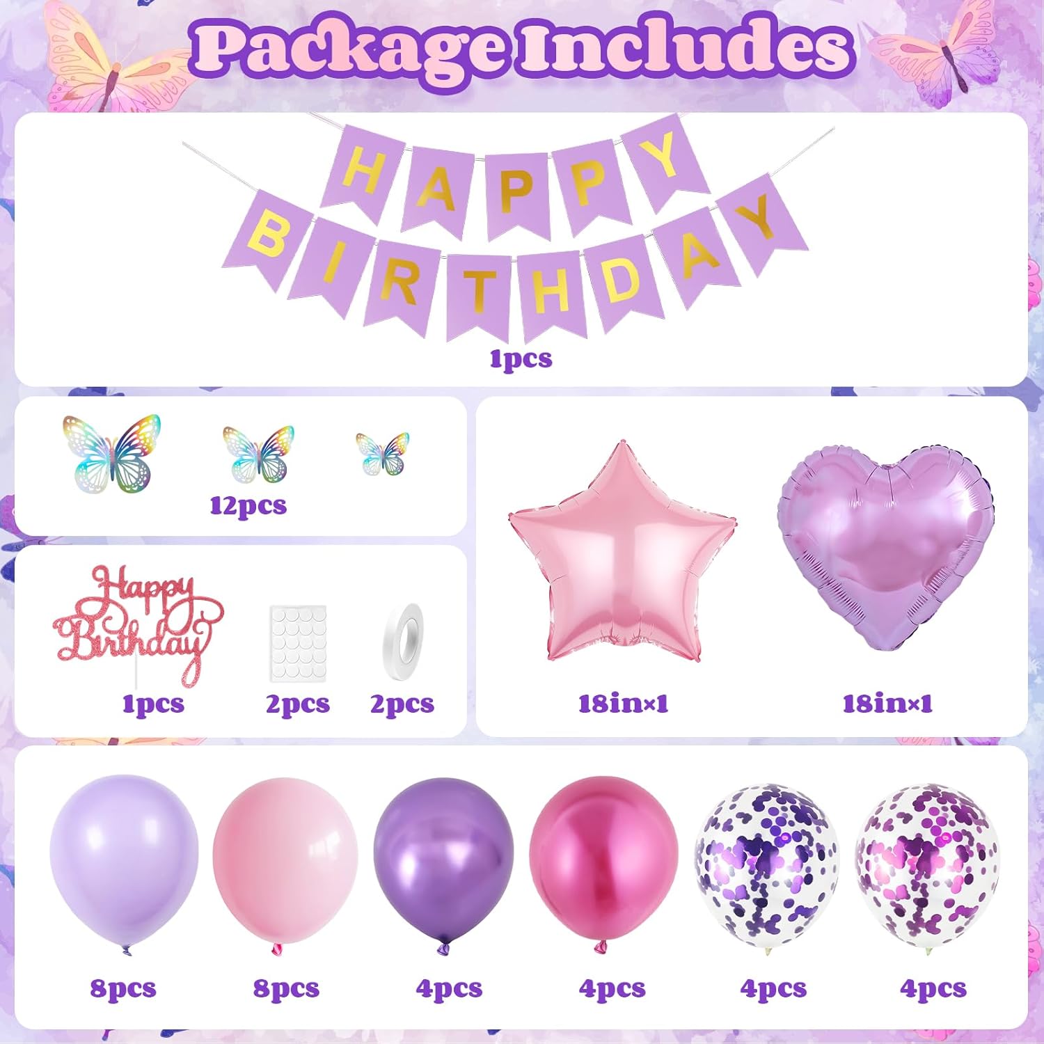 Le decorazioni di compleanno rosa viola includono: 32 palloncini in lattice da 12 cm (8 palloncini rosa, 8 palloncini viola, 4 palloncini rosa metallizzati, 4 palloncini viola metallizzati, 4 palloncini rosa coriandoli, 4 palloncini viola coriandoli), 1 palloncino viola a forma di cuore da 45 cm, 1 palloncino in lamina a stella rosa da 45 cm, 1 topper per torta di compleanno, 1 striscione di compleanno in oro viola, 1 set di farfalle 3D Decorazione (12 pezzi s), 2 nastri (10 m), 2 punti di colla Decorazione di compleanno in materiale di alta qualità: il set di decorazioni di compleanno rosa e viola è di lunga durata, resistente allo scoppio. Per ridurre la possibilità di scoppio, è meglio gonfiare i palloncini fino a circa l'85% della loro dimensione intera. I palloncini in lamina sono dotati di una cannuccia per gonfiare e sgonfiare facilmente. Mentre lo striscione di compleanno e il topper per torta vantano una finitura di alta qualità, garantendo che durino durante l'evento Versatile e facile da installare: queste decorazioni per feste di compleanno per ragazze sono semplici da montare. Gonfia i palloncini rosa e viola, appendi lo striscione "Happy Birthday" e disponi le decorazioni di compleanno a farfalla insieme al cuore, alla stella e ai palloncini numerici per creare un'affascinante decorazione di compleanno principessa. Non sono necessari strumenti o abilità speciali: un ottimo modo per preparare decorazioni di compleanno per feste di ragazze Design unico ed elegante: con un delicato mix di toni rosa e viola, accenti lucidi e palloncini con coriandoli, questo set di palloncini di compleanno per ragazze porta un'atmosfera giocosa ma elegante alla festa. Le farfalle 3D aggiunte lo rendono ancora più accattivante: una scelta premurosa per le decorazioni di compleanno delle ragazze che aggiungono gioia e personalità al grande giorno. SERVIZIO SODDISFAZIONE: ci impegniamo a fornire un buon servizio. Se hai dubbi sull'uso delle decorazioni per palloncini di compleanno, cercheremo di risolverli.