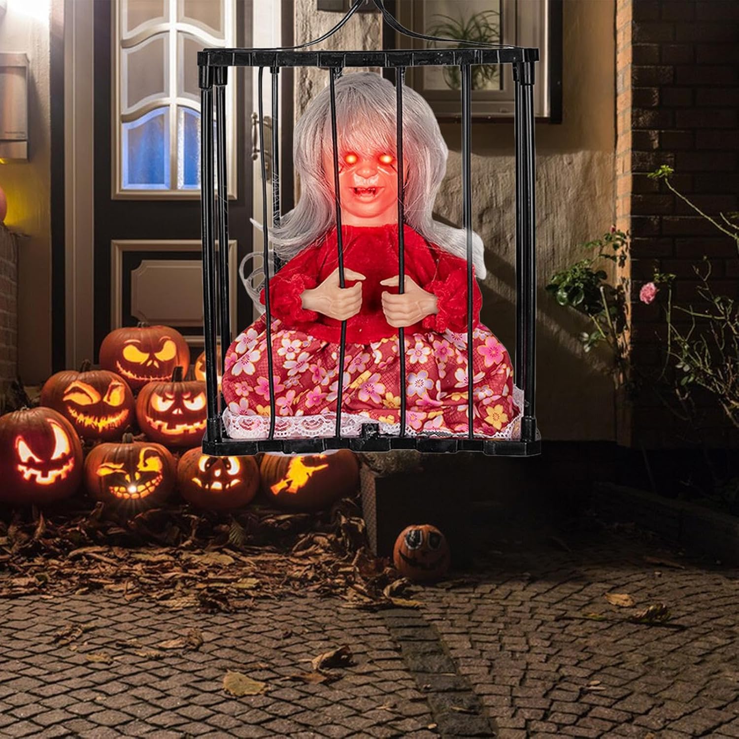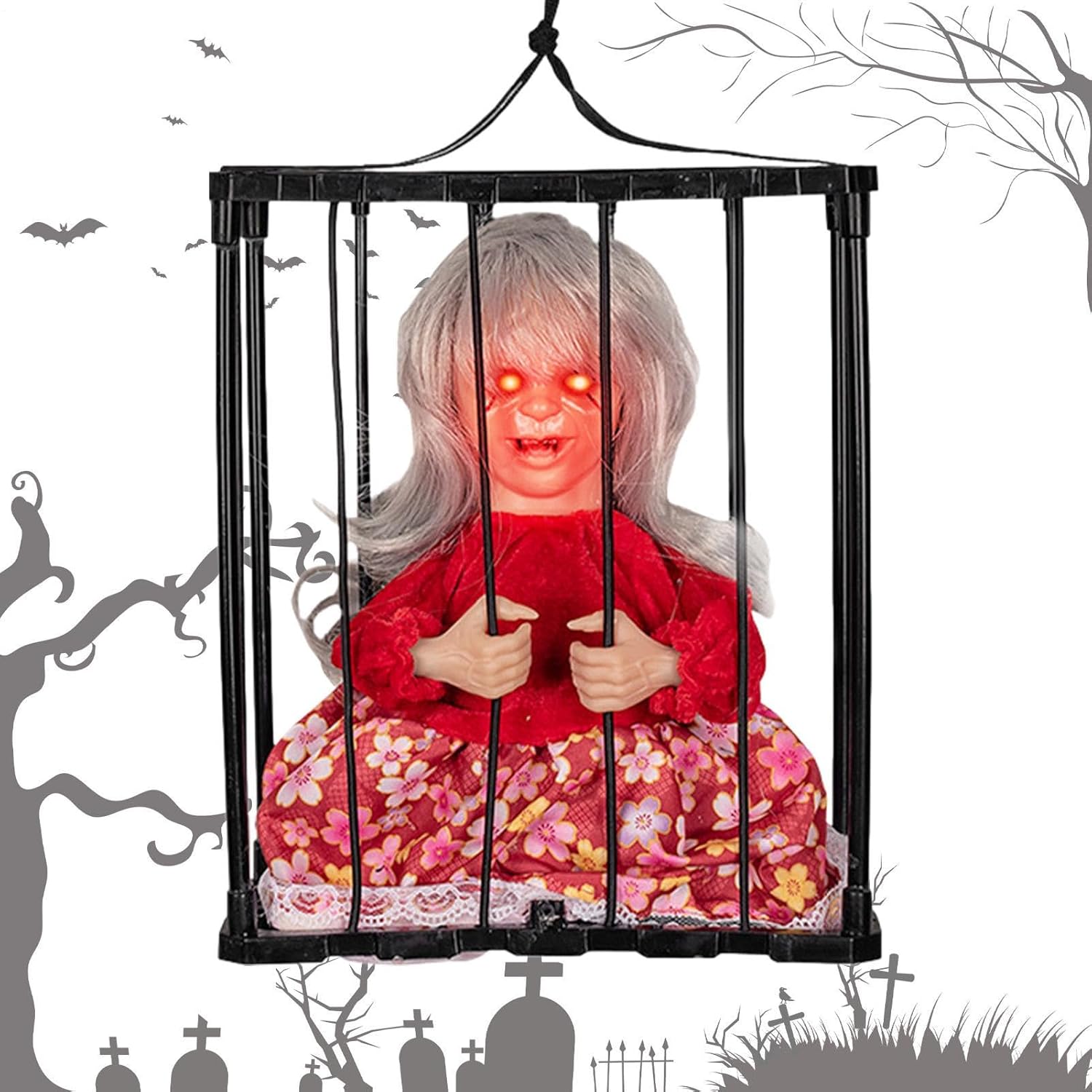 Momento clou inquietante: migliora le tue decorazioni di Halloween con la nostra gabbia della prigione di Halloween. Assisti al grido spaventoso del prigioniero "Portami fuori!" e guarda i tuoi ospiti turbarsi e immergersi in un'atmosfera spettrale. Ampia applicabilità: questa gabbia per prigionieri di Halloween è l'ultima aggiunta spettrale alle decorazioni della tua casa stregata. La gabbia dall'aspetto realistico può contenere qualsiasi creatura spaventosa ed è perfetta per spaventare gli ospiti, i dolcetti o gli scherzetti e i vicini. Con sensore di movimento e luce: gli occhi rossi tremolanti e gli effetti urlanti creano un'atmosfera spettrale. Attiva il sensore semplicemente ruotando l'interruttore. Con sensori di movimento e luce, può rilevare chiunque si avvicini da una distanza compresa tra 0 e 23,5 pollici. Materiale eccellente: realizzata con materiali ABS + tessuto di alta qualità, la gabbia per prigionieri di Halloween è costruita per durare e resistere all'usura. Garantisce uno spettacolo spettrale per il tuo arredamento di Halloween. Regalo decorativo: dai un tocco spettrale al tuo arredamento di Halloween con questa terrificante gabbia da prigione, un regalo perfetto per la famiglia e gli amici. Usalo per scioccare i tuoi ospiti, spaventare i tuoi vicini o creare un'atmosfera spettrale.