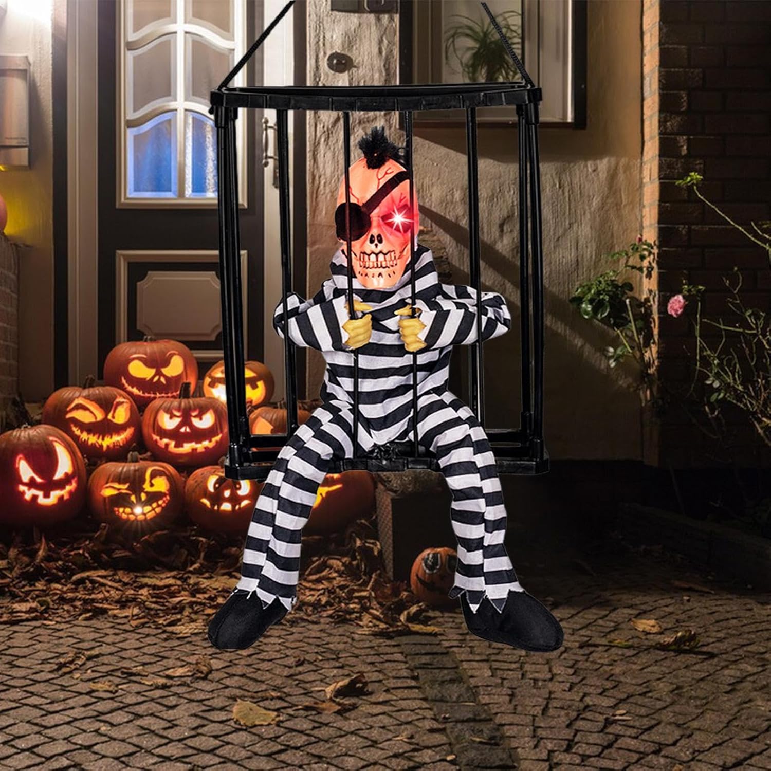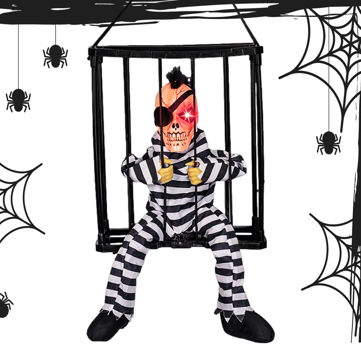 Crea un'atmosfera spettrale di Halloween: questo spaventoso prigioniero in gabbia urlerà "Fammi uscire!" mentre cerca disperatamente di scappare, facendo sobbalzare i tuoi ospiti dalla paura e dalle risate. Ampia applicazione: crea un arredamento di Halloween perfettamente inquietante con la nostra realistica gabbia per prigionieri di Halloween. Perfetto per case infestate, feste a tema Halloween e serate dolcetto o scherzetto. Con sensore di luce: occhi rossi scintillanti ed effetti di urlo terrificanti, i sensori di movimento e di luce della gabbia della prigione di Halloween la fanno tremare e afferrare le sbarre quando attivati premendo l'interruttore. Rileva chiunque si avvicini entro 23,5 pollici! Materiale: realizzata con materiale ABS+tessuto, la gabbia per prigionieri di Halloween è caratterizzata da durabilità e resistenza all'usura. Un processo di installazione semplice e veloce con istruzioni e accessori garantisce un tocco spettrale al tuo allestimento di Halloween. Regalo perfetto: migliora il tuo arredamento di Halloween con questa gabbia per prigionieri, un regalo indispensabile per la famiglia e gli amici. Perfetta per scherzi spaventosi, ambienti inquietanti o semplicemente per spaventare gli ospiti, questa gabbia aggiunge un tocco di orrore in più alle tue celebrazioni di Halloween.