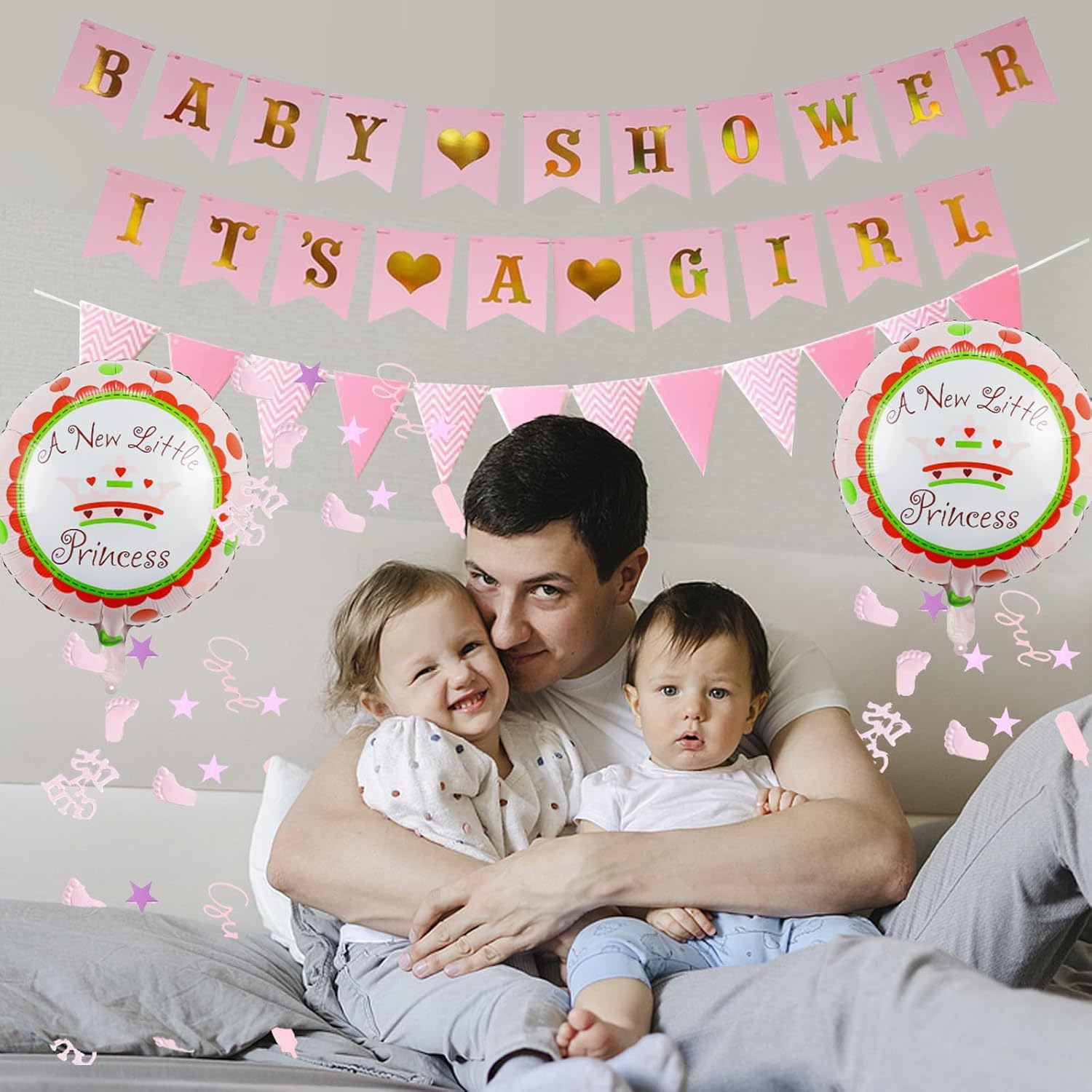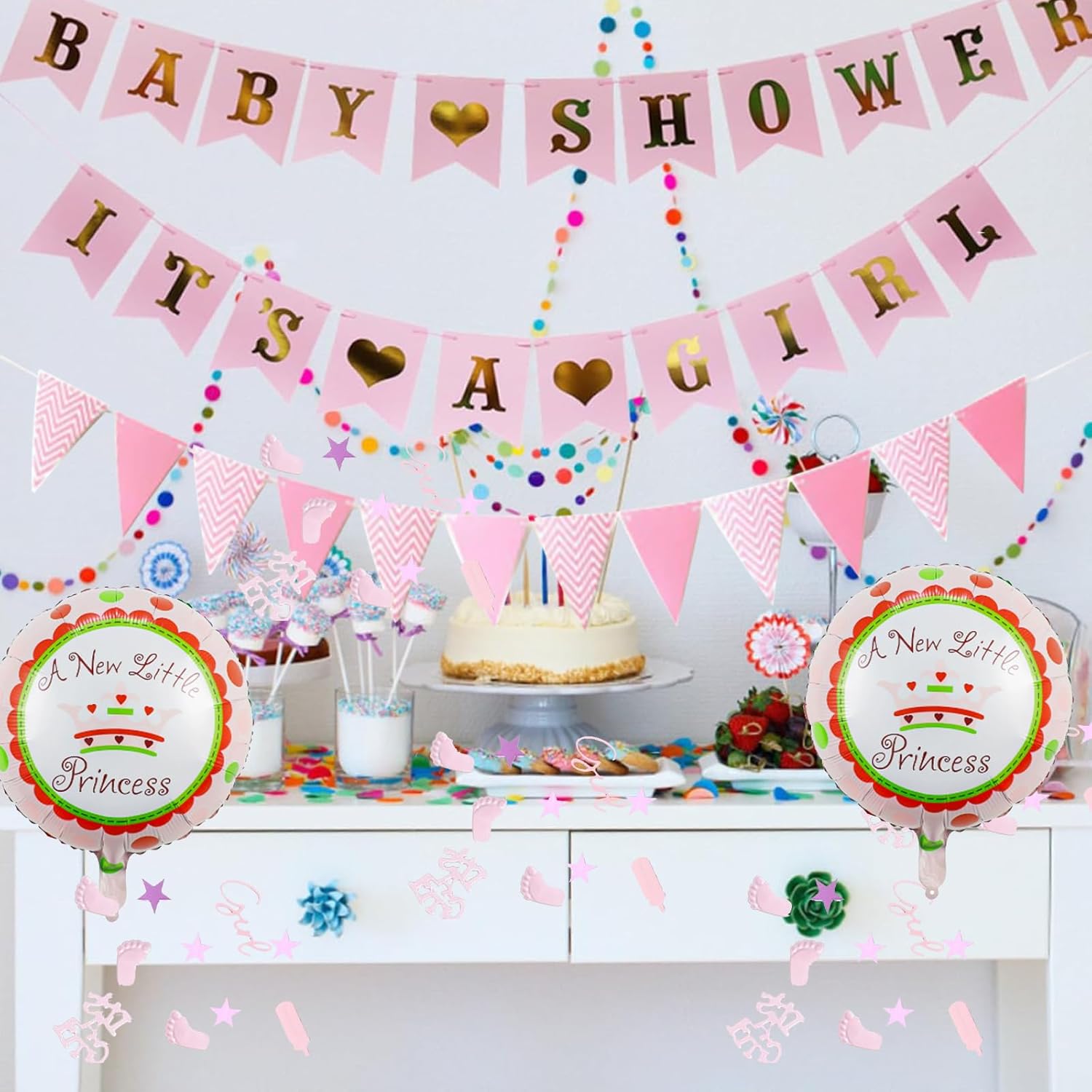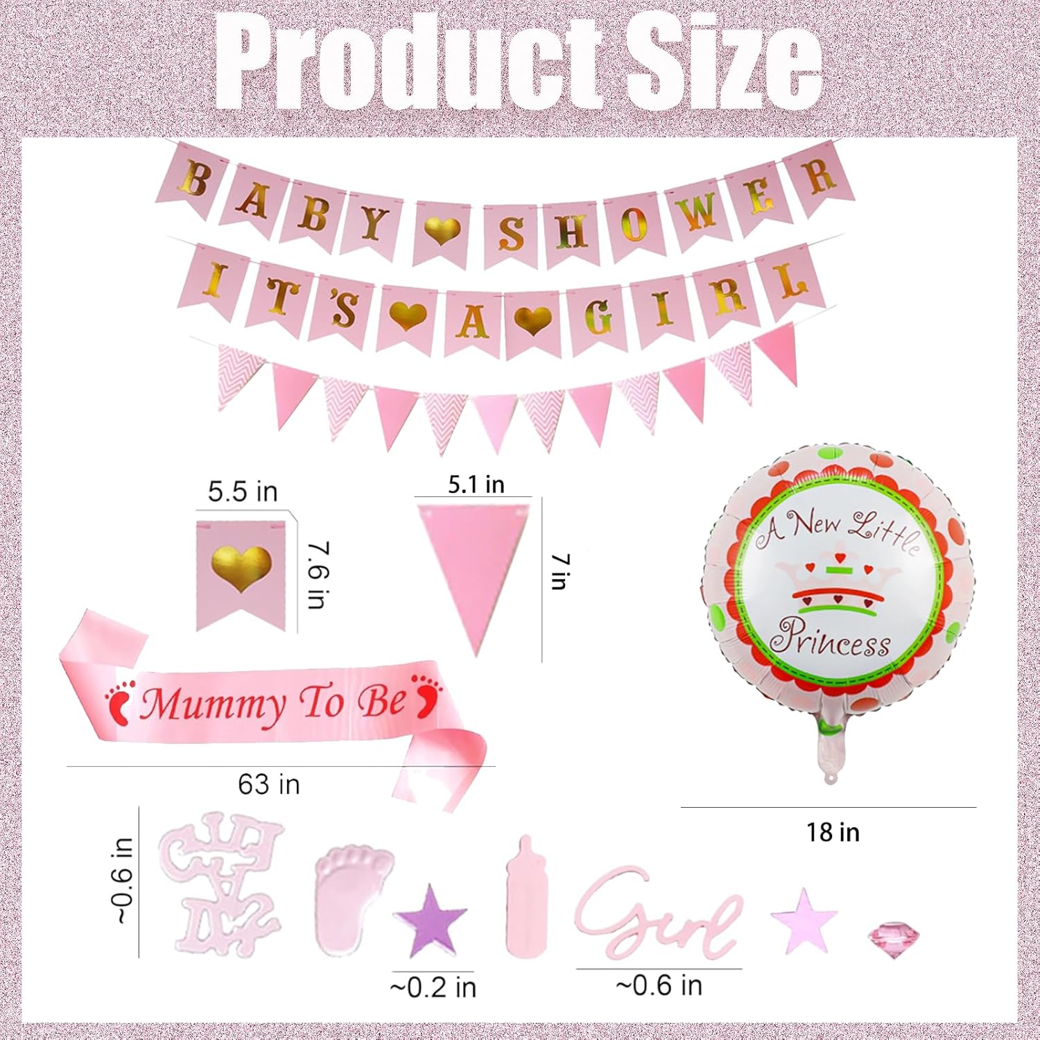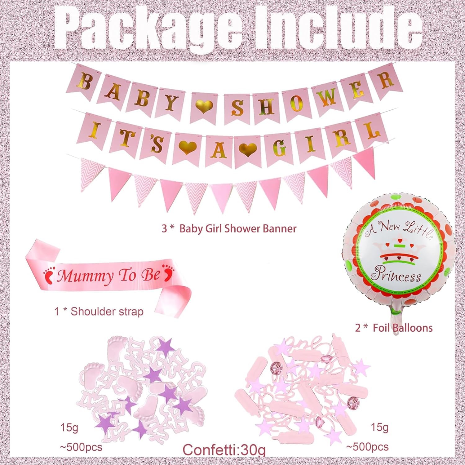 La confezione include: 3 striscioni, 1 tracolla per la mamma per essere, stella a forma di piede da 15 g, coriandoli in acrilico glitterato da 15 g, palloncini rosa "A Little Princess" con tutto il necessario Set completo di decorazioni per baby shower rosa: crea una celebrazione magica con le nostre decorazioni per baby shower, tra cui striscioni, palloncini e una tracolla per futura mamma. Perfetto per decorazioni di benvenuto per bambine e temi rosa baby shower. 【Qualità premium e bel design】: i nostri palloncini e coriandoli per baby shower sono realizzati in lattice resistente e acrilico, garantendo un look festoso e duraturo. I palloncini rosa baby aggiungono un tocco dolce a qualsiasi festa. 【Installazione facile e veloce】: decora senza sforzo il tuo locale: basta gonfiare le decorazioni rosa per baby shower, appendere lo striscione per baby shower e spargere i coriandoli scintillanti a stella per un'atmosfera deliziosa. Regalo perfetto per la futura mamma: ideale per giochi di baby shower, sesso rivelatore, foto di maternità o decorazione per la cameretta dei bambini. Questo set all-in-one include tutto il necessario per una festa di una bambina, rendendolo un regalo premuroso e pratico per qualsiasi baby shower.