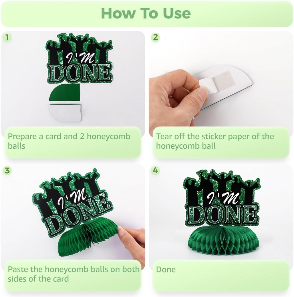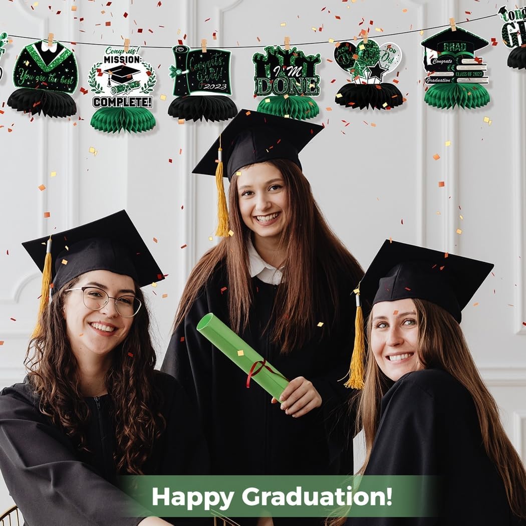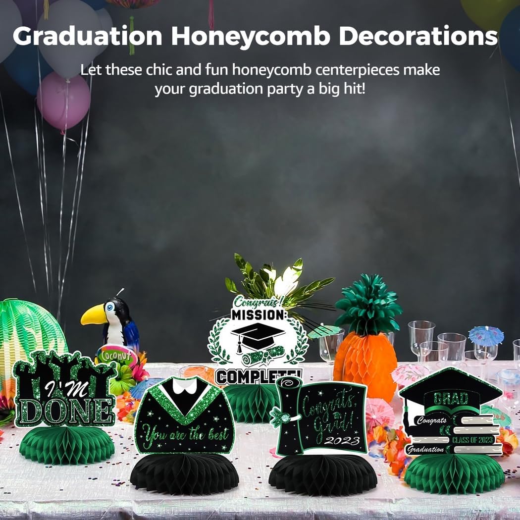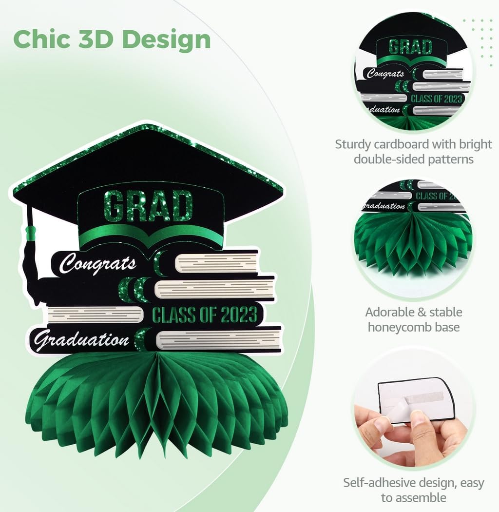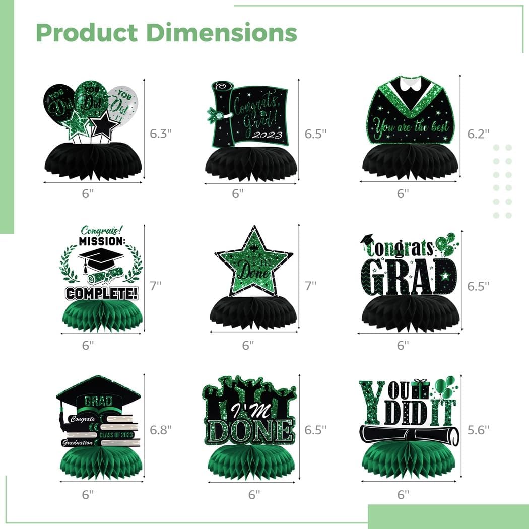 Vari disegni di laurea: set di nove diversi toppers a nido d'ape, con cappelli, vestiti, palloncini e frasi motivazionali; per un'atmosfera festosa durante la laurea Crea una festa indimenticabile: questi centrotavola affascinanti e colorati renderanno la tua festa di laurea più allegra e lasceranno ricordi indelebili per i tuoi ospiti Installazione senza problemi: il retro autoadesivo consente un facile assemblaggio, senza attrezzi o passaggi complicati richiesti; Prepara le tue decorazioni in pochi minuti Durevole: realizzato in cartone con stampa digitale resistente allo sbiadimento; questi centrotavola rimangono vibranti e attraenti per tutto l'evento COMPATTO E AFFASCINANTE: Ogni decorazione misura 6-7 pollici di altezza e 6 pollici di larghezza; una grande dimensione per una decorazione della tavola attenzione ma discreta