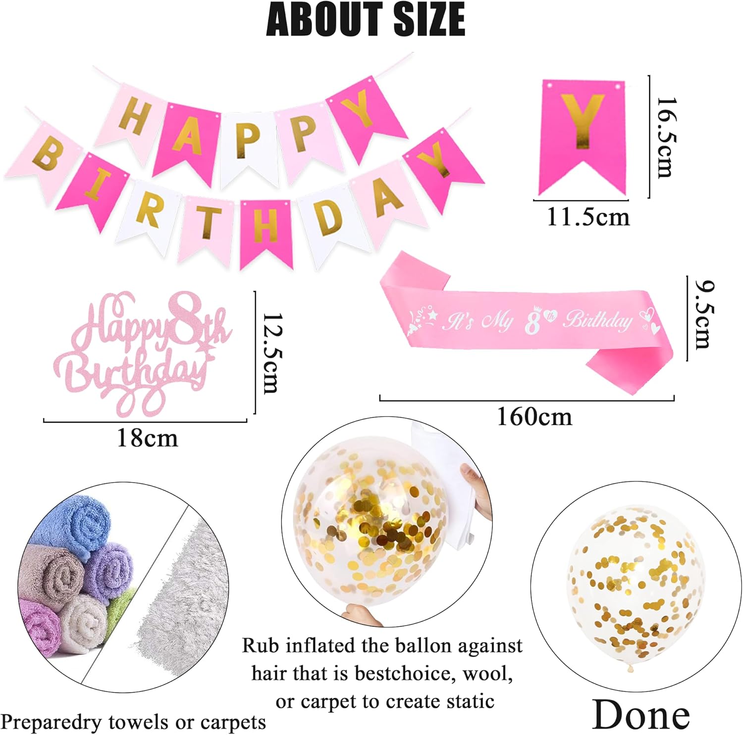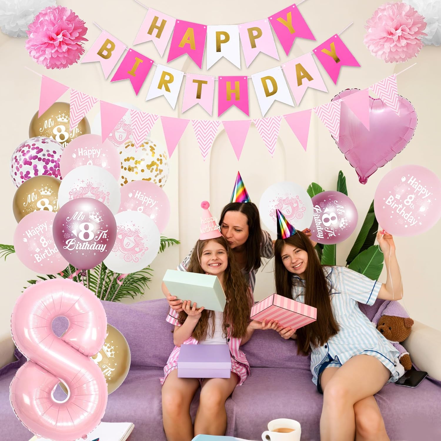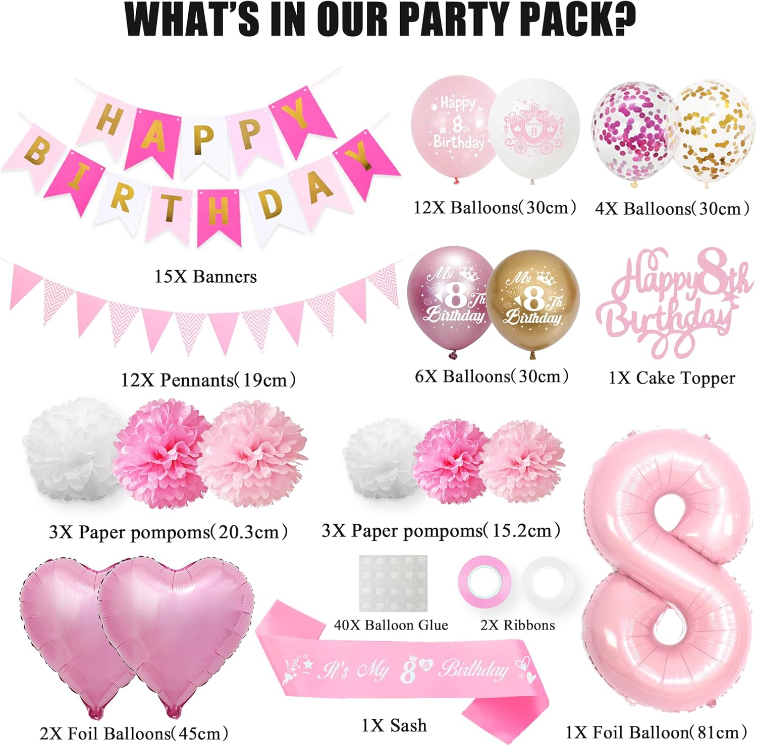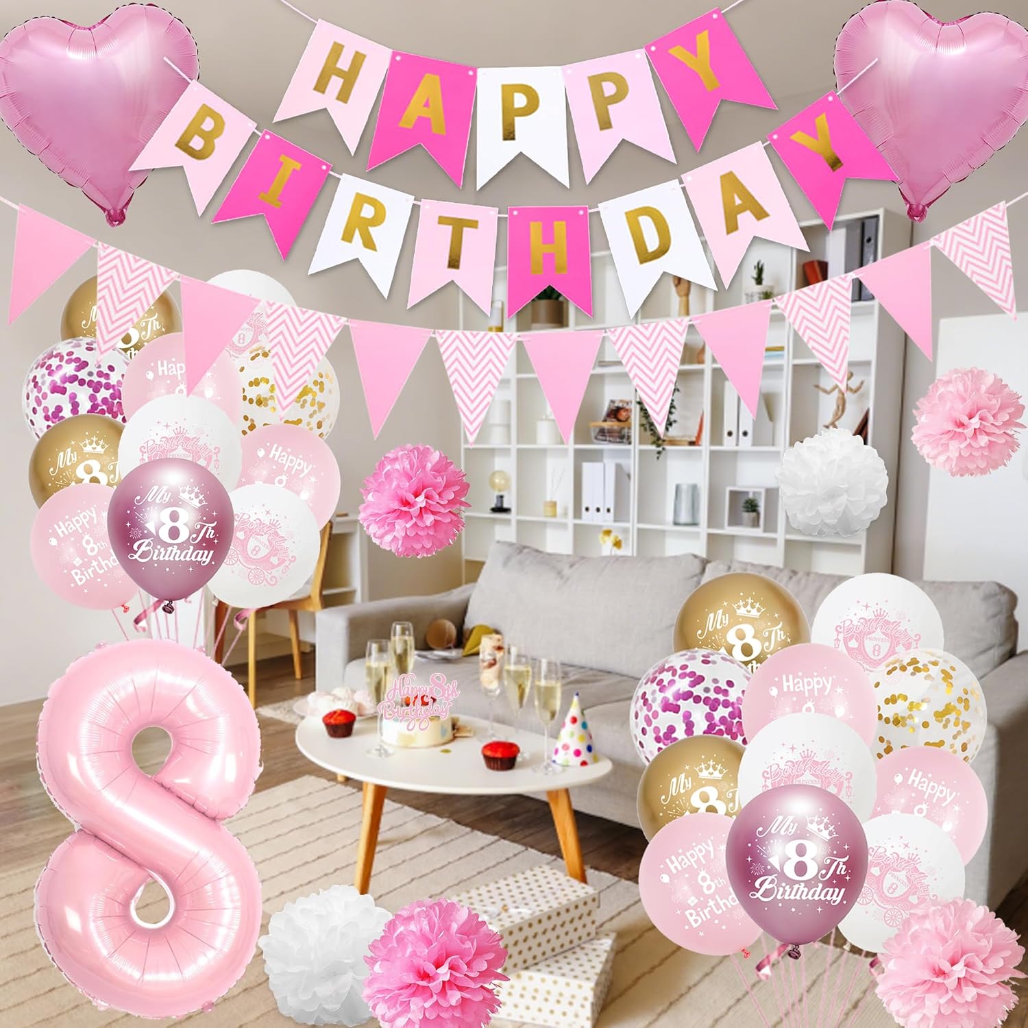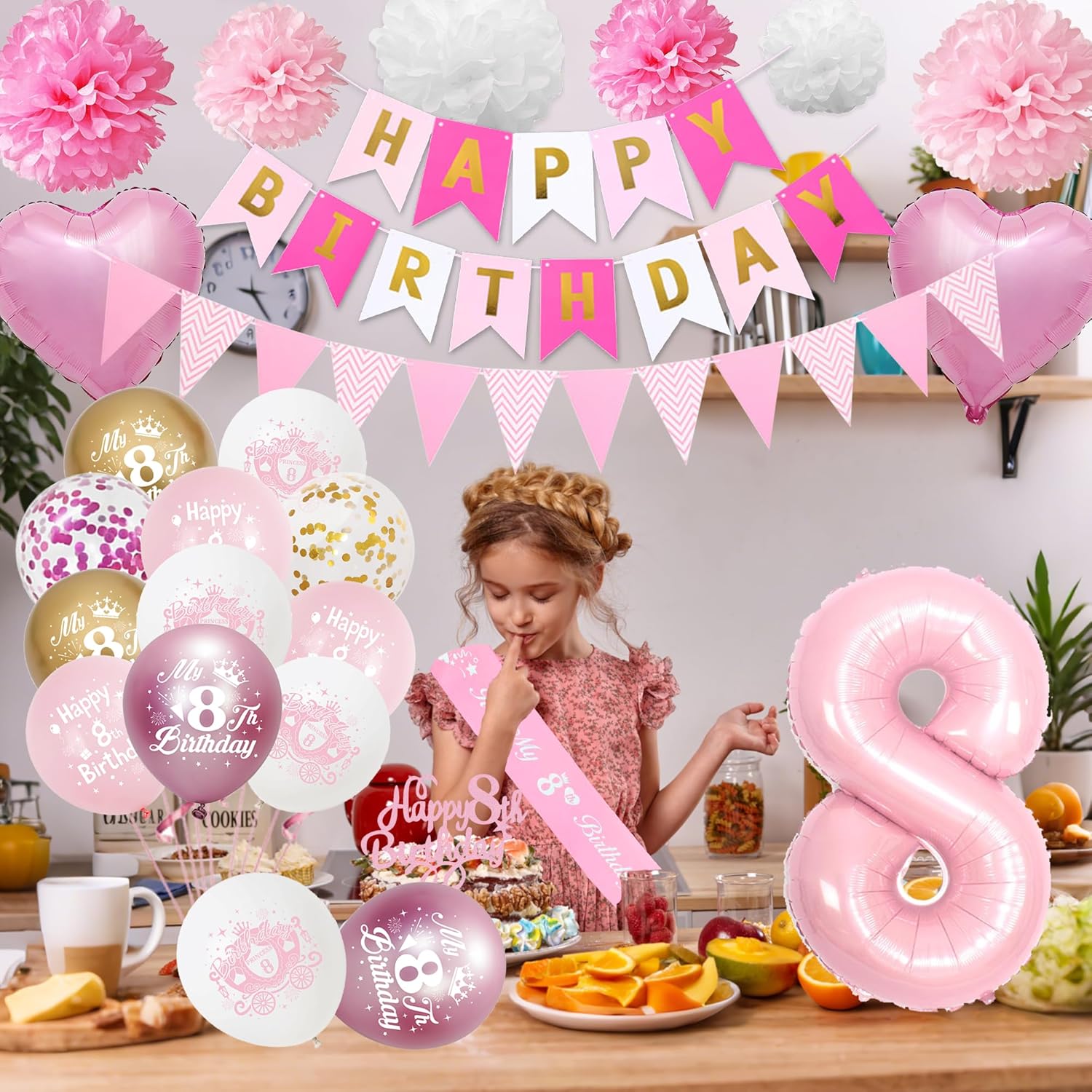 DECORAZIONI DI COMPLEANNO ROSA E ORO: 3 pon pon di carta velina da 8", 3 pon pon di carta velina da 6", 22 palloncini in lattice, 1 decorazione per torta, 2 nastri, 15 striscioni, 12 gagliardetti, 2 palloncini foil a cuore da 18", 1 palloncino con numeri da 32", 1 SS. Cenere Materiali di alta qualità: le decorazioni per l'ottavo compleanno per ragazze sono realizzate con materiali atossici di alta qualità per garantire che i palloncini non siano facili da rompere, sicuri e sani, garantendo tranquillità per le feste di compleanno dei bambini Design: i palloncini rosa per l'ottavo compleanno utilizzano una combinazione di oro e rosa, migliorando immediatamente l'atmosfera della festa e diventando un'ottima decorazione di compleanno, regalando alla tua ragazza un'esperienza di festa speciale Facile da installare: Accessori decorativi rosa per l'ottavo compleanno Decorazioni per la festa dell'ottavo compleanno: Le decorazioni oro e rosa sono belle e alla moda, creando una fantastica atmosfera di festa e impressionerà i tuoi parenti e amici. Flessibile e applicabile, aggiunge divertimento illimitato