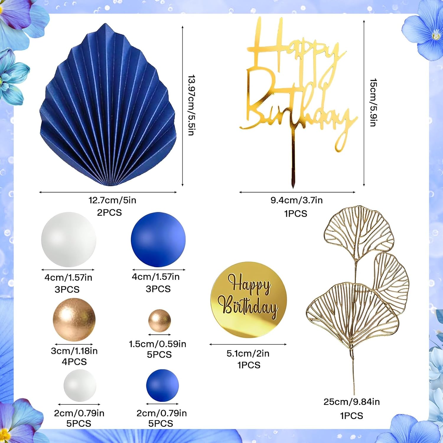 【Set di decorazioni per torta】 La decorazione della torta di compleanno comprende 1 pannello dorato "Buon Compleanno", 1 pannello rotondo dorato "Buon Compleanno", 1 etichetta in foglia d'oro, 2 carte blu smerlate, 8 palline blu (2 misure), 8 palline bianche (2 misure), 9 palline dorate (2 misure). 【Palla decorativa per torta】Decorazione per torta in una combinazione di oro, blu e bianco. Brilla sotto la luce ed è lussuoso quanto mai. Le palline decorative tridimensionali conferiscono alla tua torta un aspetto ricco e stratificato. 【Versatilità】 I toppers per torta di compleanno sono adatti a tutti i tipi di dessert e pasticcini, tra cui le torte da 6-10 pollici sono le più adatte. Sono adatti per feste di compleanno, fidanzamenti, matrimoni, feste in giardino, baby shower, decorazioni per la casa e molto altro. 【Bellissimo design】 Gli accessori per la decorazione della torta di compleanno sono ricchi di varietà e quantità. Le foglie dorate di albicocca sono realizzate in modo squisito e realistico, mentre i ventagli pieghevoli e le palline di diverse dimensioni e colori sono abbinati per rendere la tua torta unica e distintiva. 【Qualità Premium】 I toppers per torta sono sicuri e non tossici, puoi star certo che toccheranno il cibo. Realizzati in materiale di alta qualità, non sono facili da rompere e possono essere riutilizzati.