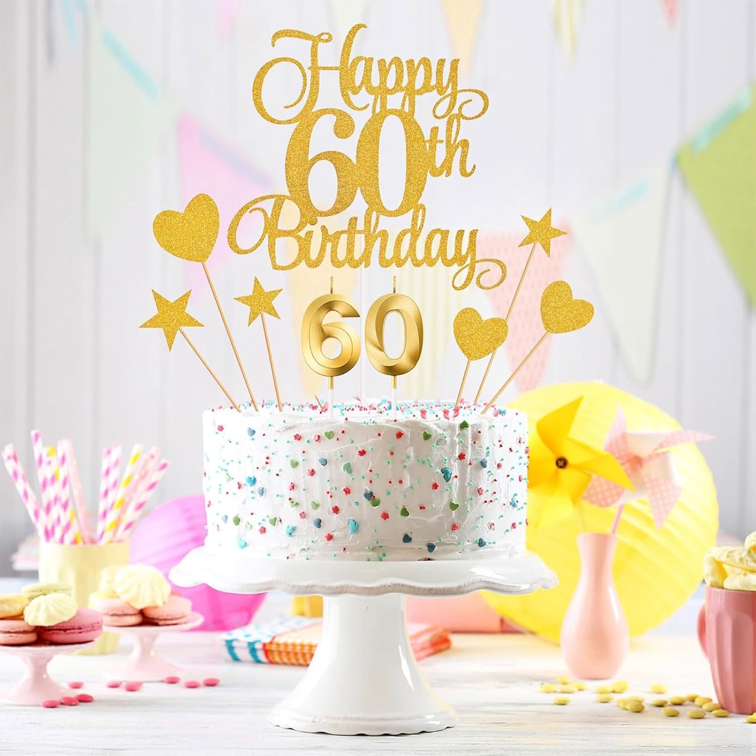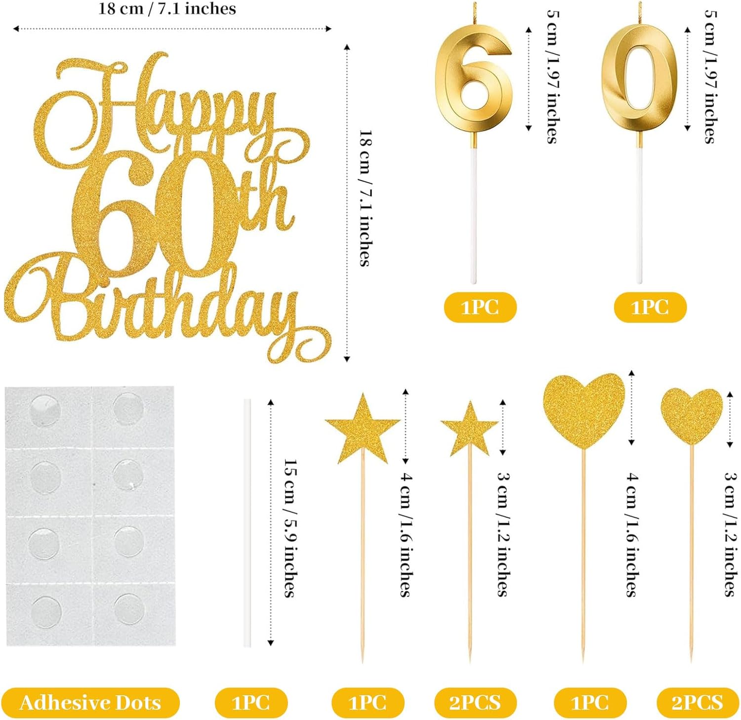 Contenuto del pacchetto: riceverete 1 pezzo di topper per il 60° compleanno, 3 pezzi di topper a forma di stella, 3 pezzi di topper a forma di cuore e 2 candele numeriche. È un'ottima aggiunta alla festa di compleanno e anniversario del 60° Design delicato e aspetto brillante: le candele numeriche hanno un colore classico e un vivace design 3D che risultano carini e vistosi alla luce. I topper di torta per compleanni sono stampati con "Buon 60° compleanno" e hanno una superficie scintillante. Anche i topper a forma di cuore e stella possiedono una superficie glitterata, aggiungendo un tocco romantico alla vostra torta di compleanno Materiale di qualità e sicuro: questi topper di compleanno sono realizzati in cartoncino glitterato spesso, resistente e non facilmente strappabile. Le candele numeriche sono fatte di cera di alta qualità. Il materiale affidabile garantisce che siano inodore e sicure da usare, facili da inserire e offrono una luce brillante, bruciando uniformemente e costantemente per un'esperienza d'uso Occasioni applicabili: i topper per il 60° compleanno sono ideali per decorare vari tipi di torte in molte occasioni, come compleanni, matrimoni, riunioni, feste a tema, celebrazioni pensionistiche, incontri familiari, creando un'atmosfera calda e momenti indimenticabili, sorprendi i tuoi amici e familiari Servizio eccellente: se avete domande su queste decorazioni per torte, vi preghiamo di contattarci quando preferite. Vi risponderemo entro 24 ore e faremo del nostro meglio per risolvere il vostro problema