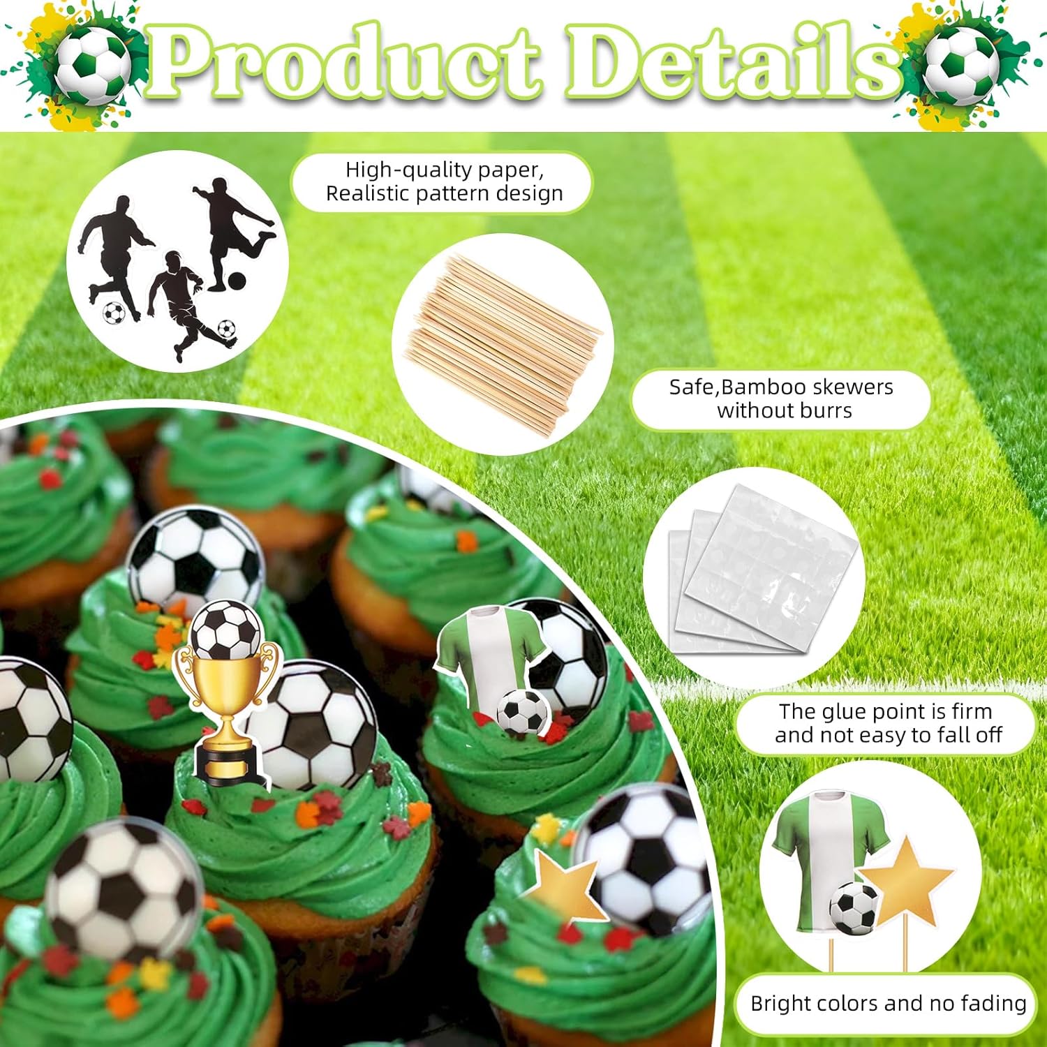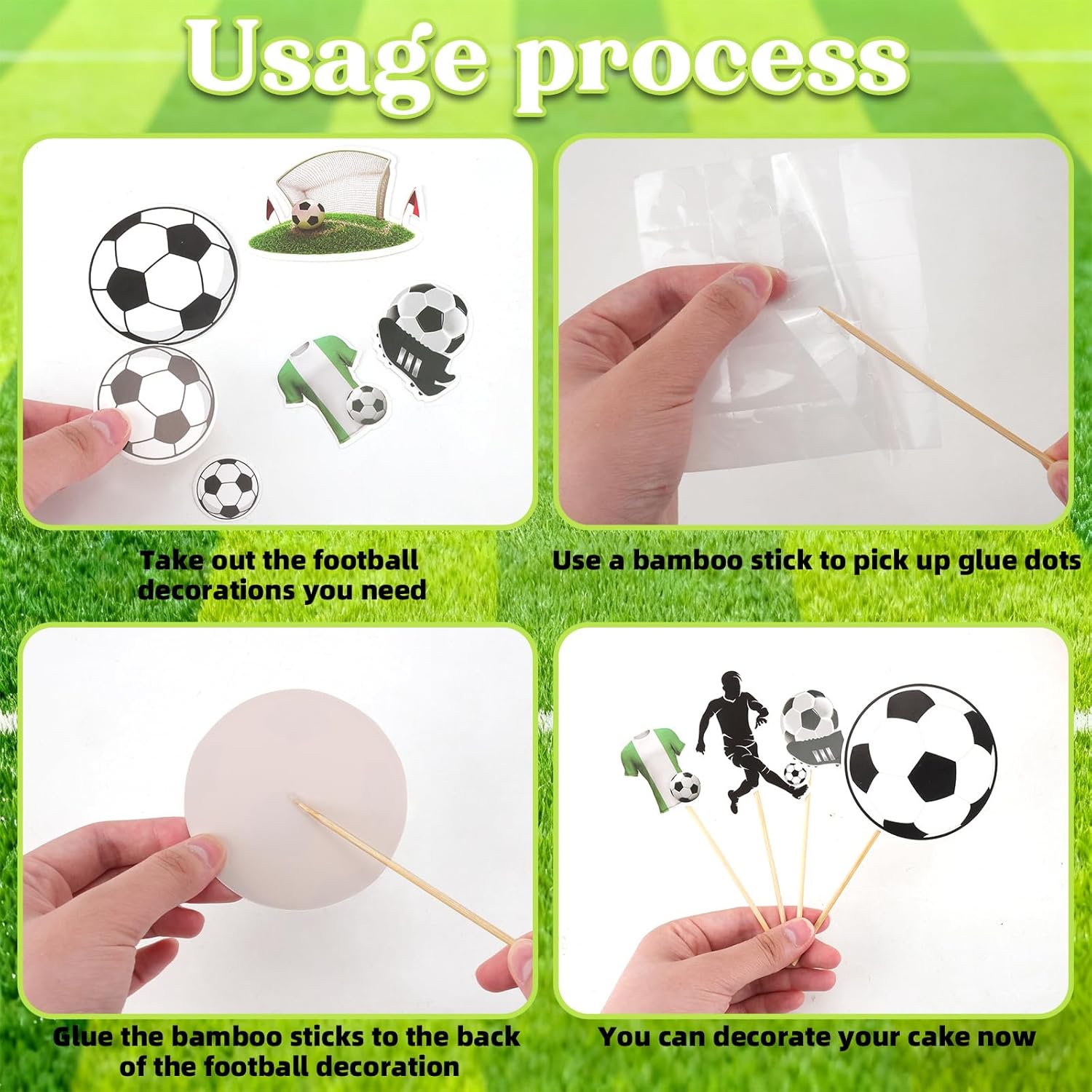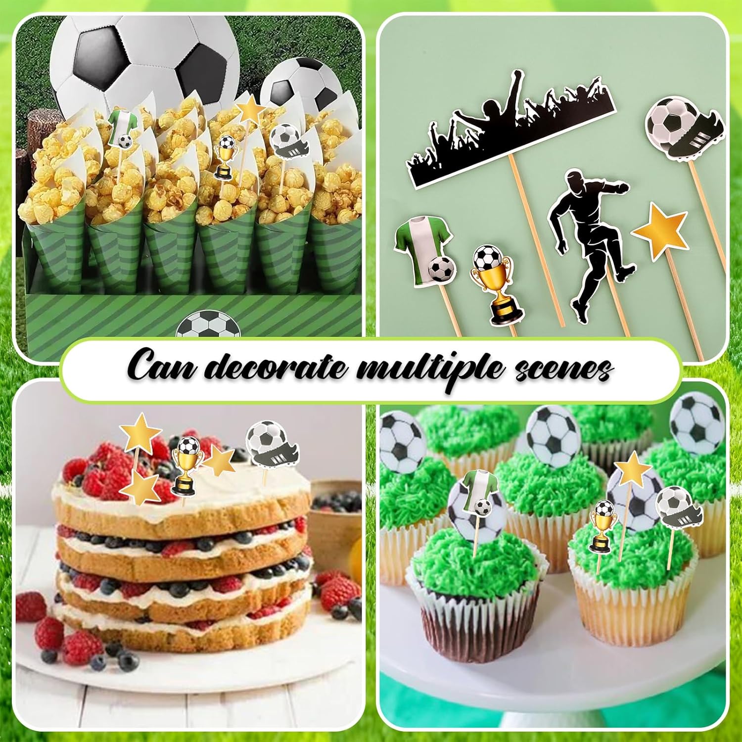 Un'ampia varietà di decorazioni per torte: il set include 55 decorazioni a tema calcistico, tra cui giocatori, porte e palloni. Abbinate a pratici stuzzicadenti e punti adesivi, puoi creare la tua torta a tema calcistico, aggiungendo un'atmosfera sportiva a qualsiasi festa. Materiali sicuri: realizzati con carta di alta qualità e stuzzicadenti per uso alimentare, questi materiali sicuri e affidabili possono essere utilizzati direttamente su torte, cupcake e altre decorazioni alimentari, rendendoli un'ottima scelta per i genitori che organizzano una festa o per i bambini che decorano da soli. Ampia applicazione: le decorazioni per torte a tema calcistico possono essere utilizzate non solo su torte, ma anche su cupcake, dessert, biscotti, ciambelle e altri prodotti alimentari. Adatte per compleanni, feste a tema calcistico, riunioni di club e altro ancora, rendono immediatamente il cibo un'aggiunta divertente e a tema, rendendole un elemento distintivo. Facile da usare: la decorazione delle torte non richiede passaggi o tecniche complicate. Basta attaccare un bastoncino di bambù ai punti adesivi e poi attaccarlo alla carta decorativa per fissare rapidamente e senza intoppi le decorazioni alla torta, rendendo facile creare una torta a tema calcistico bellissima e unica. Torta fai da te unica: il design unico e vivace dell'elemento calcistico può stimolare l'immaginazione dei bambini. Genitori e figli possono creare torte fai da te insieme per creare una torta che appartenga solo a loro, creando ricordi felici e indimenticabili per la festa di compleanno e rendendola più significativa.