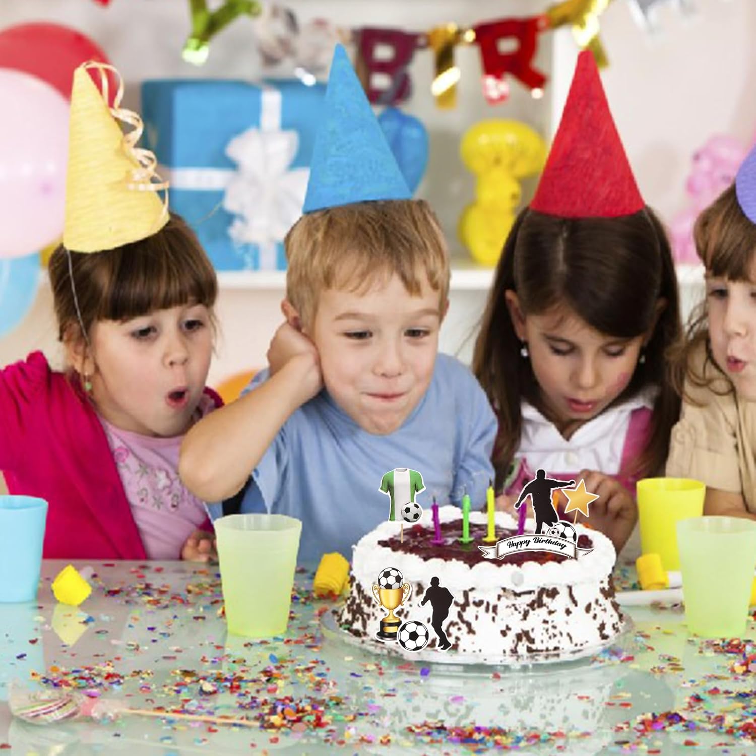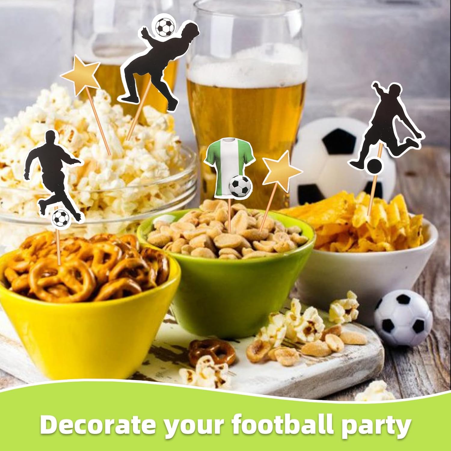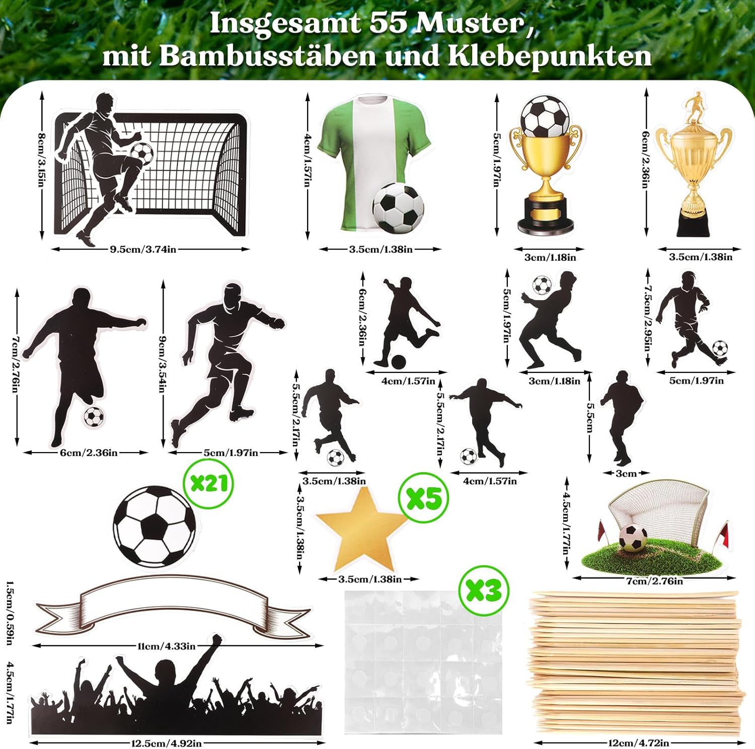 Un'ampia varietà di decorazioni per torte: il set include 55 decorazioni a tema calcistico, tra cui giocatori, porte e palloni. Abbinate a pratici stuzzicadenti e punti adesivi, puoi creare la tua torta a tema calcistico, aggiungendo un'atmosfera sportiva a qualsiasi festa. Materiali sicuri: realizzati con carta di alta qualità e stuzzicadenti per uso alimentare, questi materiali sicuri e affidabili possono essere utilizzati direttamente su torte, cupcake e altre decorazioni alimentari, rendendoli un'ottima scelta per i genitori che organizzano una festa o per i bambini che decorano da soli. Ampia applicazione: le decorazioni per torte a tema calcistico possono essere utilizzate non solo su torte, ma anche su cupcake, dessert, biscotti, ciambelle e altri prodotti alimentari. Adatte per compleanni, feste a tema calcistico, riunioni di club e altro ancora, rendono immediatamente il cibo un'aggiunta divertente e a tema, rendendole un elemento distintivo. Facile da usare: la decorazione delle torte non richiede passaggi o tecniche complicate. Basta attaccare un bastoncino di bambù ai punti adesivi e poi attaccarlo alla carta decorativa per fissare rapidamente e senza intoppi le decorazioni alla torta, rendendo facile creare una torta a tema calcistico bellissima e unica. Torta fai da te unica: il design unico e vivace dell'elemento calcistico può stimolare l'immaginazione dei bambini. Genitori e figli possono creare torte fai da te insieme per creare una torta che appartenga solo a loro, creando ricordi felici e indimenticabili per la festa di compleanno e rendendola più significativa.