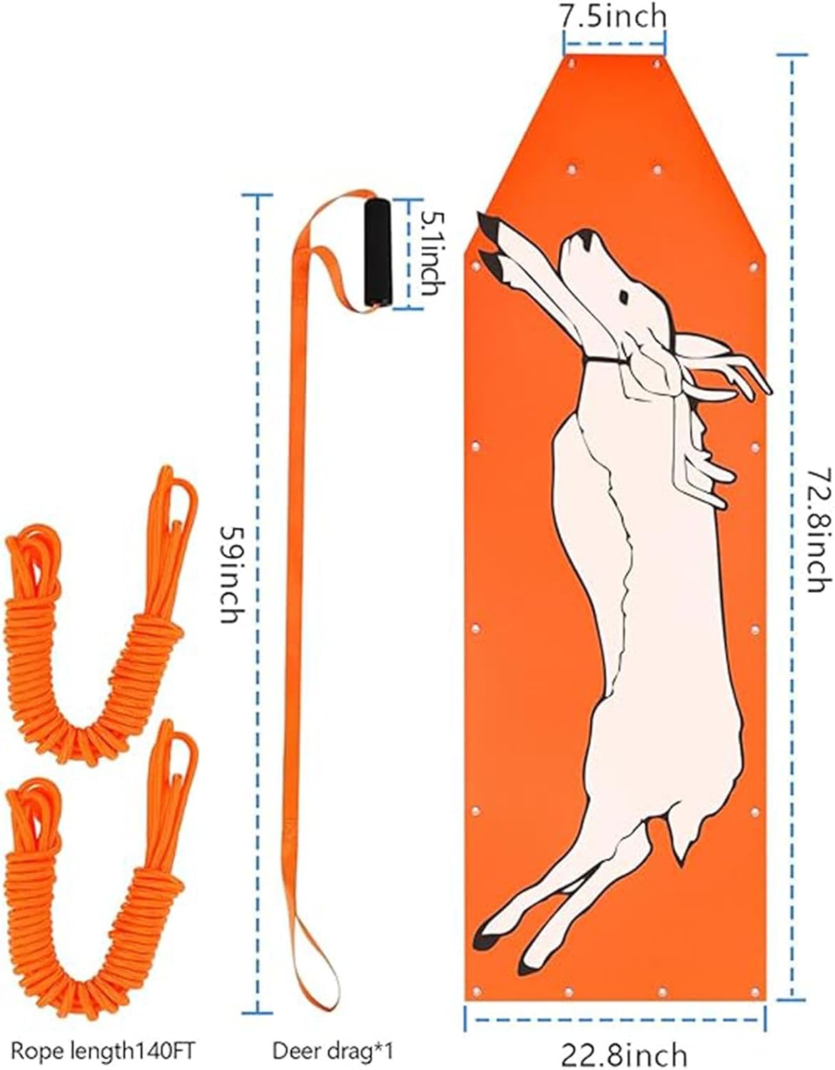 Trasporto senza sforzo: realizzata con una struttura robusta per garantire una caccia più , questa slitta per cervi trasporta facilmente la tua preda, facendoti risparmiare ed energia preziosi Trasporto facile e veloce della selvaggina: massimizza il tuo successo nella caccia con questa slitta per cervi. La consistenza liscia rende la pulizia dopo l'uso un gioco da ragazzi, mentre il design consente un carico e scarico facile e veloce. Questo accessorio semplifica la tua esperienza di caccia, rendendola più efficiente ed efficace Ampia applicazione: ideale per trasportare prede, scivola senza sforzo su , radici di alberi, sabbia, terra, fango, neve e ghiaccio, sebbene non adatto a terreni estremi Comodità e mobilità versatili: progettata con una struttura leggera e portatile, questa slitta per cervi consente un facile trasporto e stoccaggio, rendendola il compagno ideale per le attività all'aperto. Perfetto per trasportare legna da ardere, attrezzatura da campeggio o altri carichi pesanti. Puoi usarlo per tutte le tue avventure all'aria aperta, che si tratti di caccia, pesca o escursionismo Elevata resistenza: grazie al design robusto e rinforzato e alla corda in nylon, la nostra slitta per cervi garantisce la massima resistenza e stabilità. Il robusto materiale composito in PVC spesso 1,2 mm assicura che anche il cervo più grande possa essere facilmente trasportato senza problemi