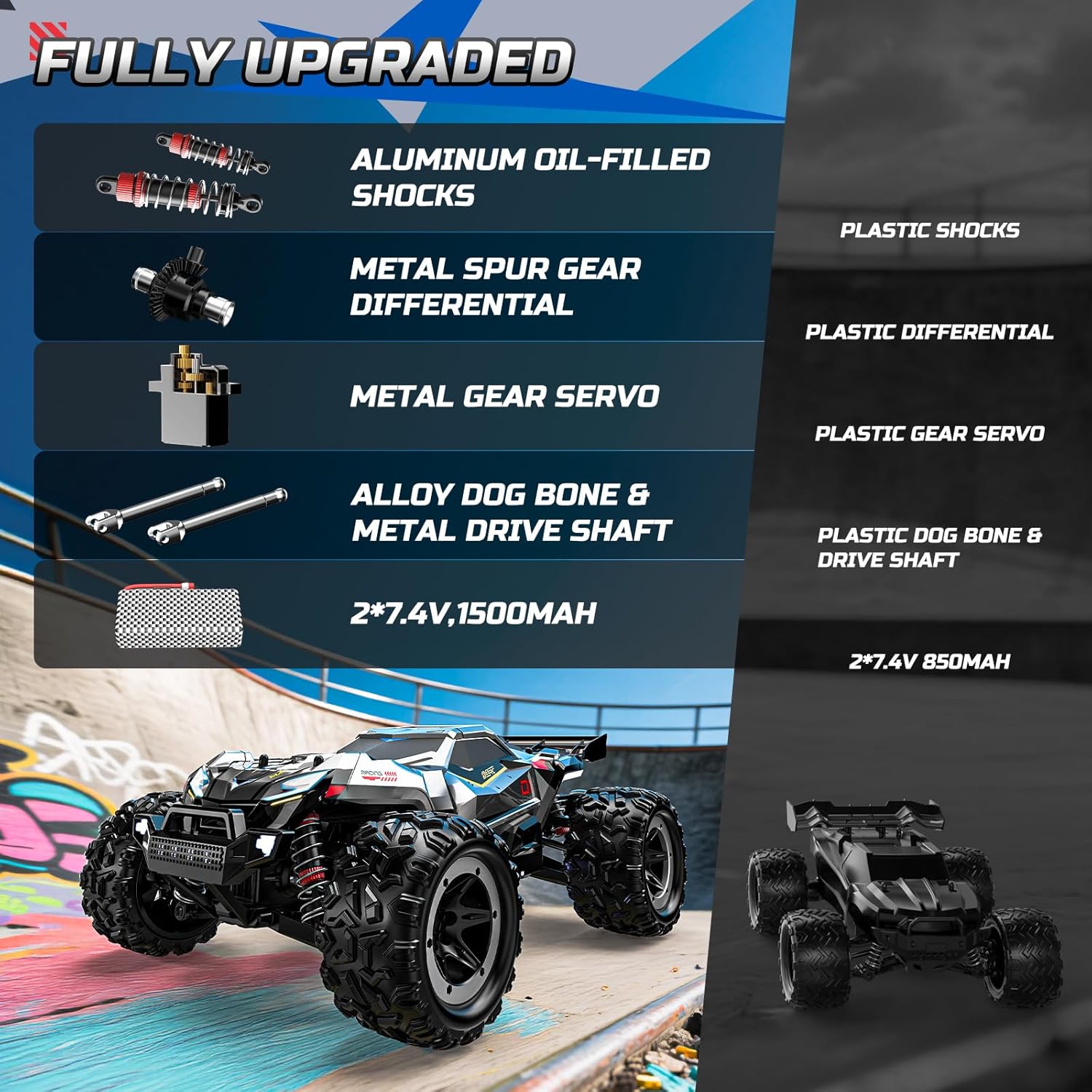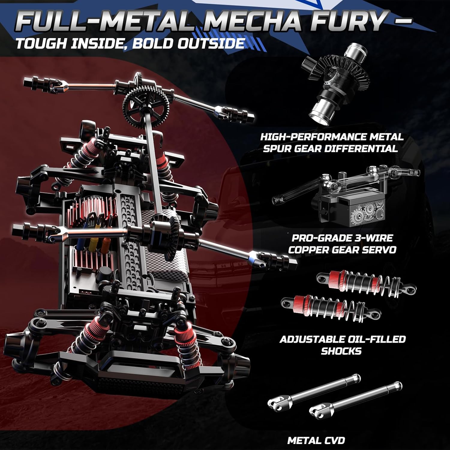 Scatena la velocità estrema di un Mecha - Alimentato da un motore brushless 2840 4000KV 14T di precisione e da un controller elettronico di velocità impermeabile 35A, questa macchina RC in scala 1/18 raggiunge velocità fino a 70 km/h con una batteria LiPo 3S (non inclusa). Vivi accelerazioni degne di una corsa e prestazioni all'avanguardia progettate per gli appassionati esigenti. Progettato per la massima durata - Progettato per resistere alle condizioni più difficili, questo mostro truck RC veloce a 4 ruote motrici è dotato di un differenziale a ingranaggi dritti in metallo, alberi di trasmissione completamente metallici, ammortizzatori a bagno d'olio regolabili e servomotore a ingranaggi in rame a 3 fili di qualità professionale. I paraurti rinforzati e i pneumatici robusti offrono una protezione aggiuntiva, offrendo una maggiore durata del 75% e un'affidabilità a lungo termine su terreni accidentati. Controllo preciso su tutti i terreni - Dotato di un controllo proporzionale a 2,4 GHz, questo monster truck telecomandato offre una direzione e una risposta dell'acceleratore precisi per un'esperienza di guida fluida. L'avanzato sistema 4x4 per fuoristrada assicura una maggiore trazione e stabilità su ghiaia, sabbia, fango, erba e skatepark, fornendo potenti slittamenti e un controllo ottimale ovunque tu sia. Durata prolungata con due batterie: include due batterie ricaricabili da 7,4 V 1500 mAh fino a 50 minuti di autonomia continua, con un'autonomia del 60% superiore rispetto ai concorrenti. Un sistema intelligente di interruzione a bassa tensione protegge la batteria, mentre la sostituzione rapida garantisce un'esperienza di gioco continua senza interruzioni. Un regalo di alta qualità per ogni occasione: ottima scelta per adulti, ragazzi e ragazzi, questo camion radiocomandato brushless ad alte prestazioni è un regalo eccezionale per compleanni, Natale e feste. Con il suo design all'avanguardia e le prestazioni di livello professionale, impressionerà sia i principianti che gli appassionati di radiocomando esperti.