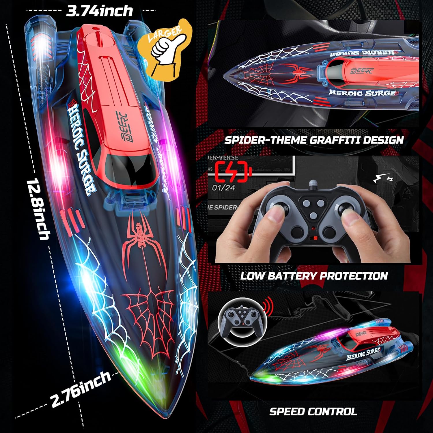 Barca radiocomandata Glowing Spider: più grande, più audace e più luminosa! Con una lunghezza di 12,8 pollici, più grande delle barche radiocomandate standard da 9,8 pollici, questo cruiser a tema ragno è costruito per distinguersi. Con graffiti dinamici e lampadine vivaci e colorate su tutto lo scafo, sarà sicuramente il preferito dai bambini. Perché accontentarsi di una normale barca telecomandata quando puoi dominare l'acqua con stile? Perfetta per le avventure notturne, è la barca definitiva per un divertimento senza fine sull'acqua! Sistema di sicurezza intelligente: progettata con un motore attivato dall'acqua per un funzionamento sicuro e controllato, questa barca giocattolo è ideale per bambini dagli 8 ai 12 anni e principianti. Il sistema di avviso di batteria scarica integrato fornisce avvisi in tempo reale, aiutando a prevenire la perdita di potenza durante il gioco e garantendo prestazioni affidabili. Divertimento senza fine sull'acqua: alimentata da 2 batterie ricaricabili, questa barca radiocomandata offre ben 40 minuti di gioco. Dotata di un'esclusiva modalità Wave Rider, offre un'azione emozionante e cavalca le onde che la distingue dalle altre. Che tu stia navigando in piscina o facendo onde al lago, goditi un'emozione senza sosta senza dover ricaricare frequentemente: l'avventura continua! Costruito per durare a lungo - Realizzato in plastica ABS di prima qualità, questo gommone ha una durata notevole. La sua copertura impermeabile tiene fuori l'acqua come un campione. Questo gommone da corsa è tutto incentrato sulla qualità, costruito per durare a lungo! Pronto per l'azione multigiocatore - Questo giocattolo da piscina non è solo di prima qualità; è anche un gioco da ragazzi da controllare con 3 diversi controlli di velocità. Grazie al suo controller di frequenza a 2,4 GHz, puoi far gareggiare più di 20 gommoni contemporaneamente senza interruzioni del segnale! È la configurazione perfetta per epiche sfide in acqua tra familiari e amici! Il regalo perfetto per tutte le età - Che si tratti di compleanni, vacanze o semplicemente perché, questo sottomarino RC è il regalo perfetto per i bambini. Con il suo design elegante e l'assistenza clienti di prima qualità, è un successo sicuro per chiunque sulla tua lista. Preparati a dare il via al massimo divertimento estivo con questo fantastico regalo giocattolo per esterni!