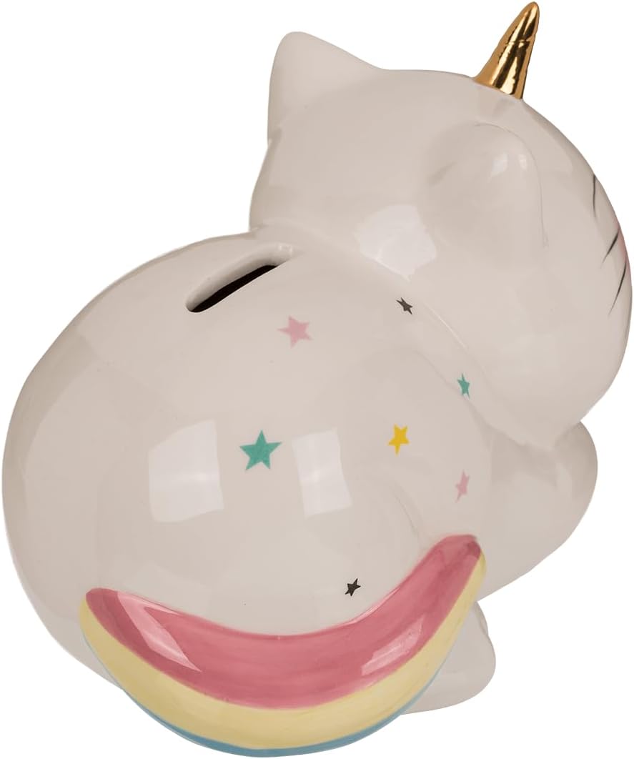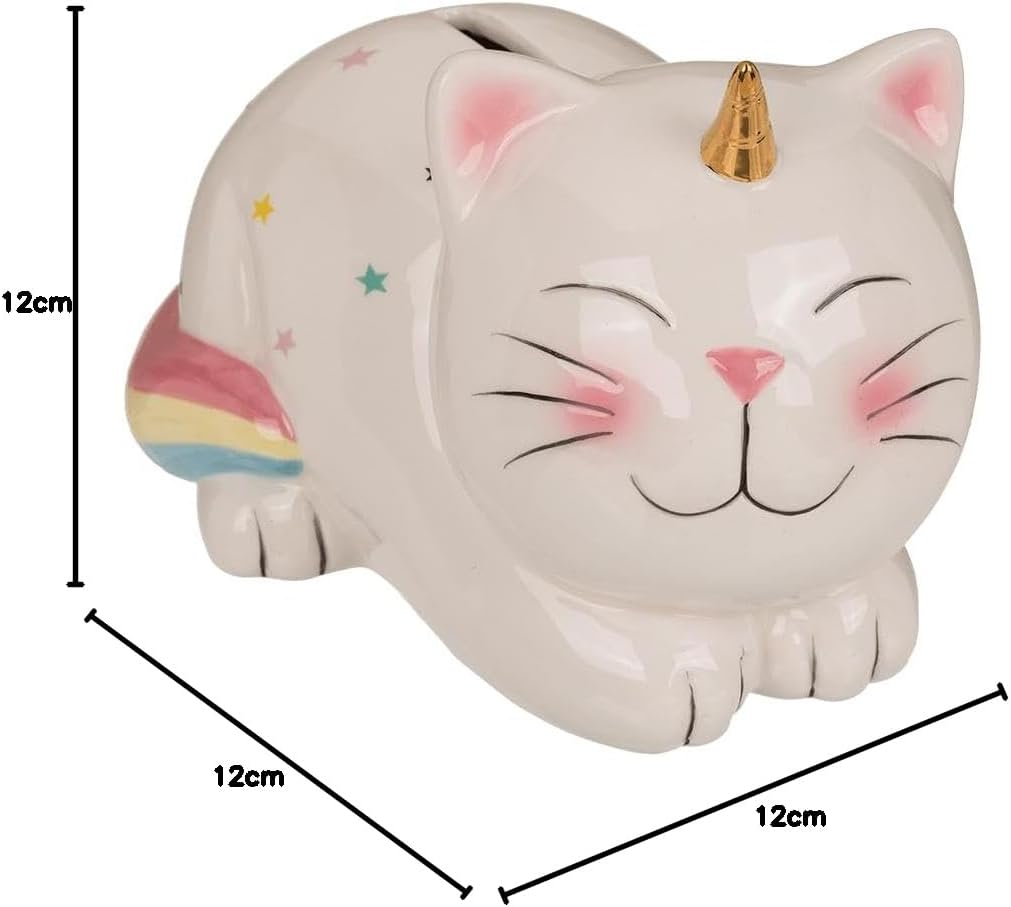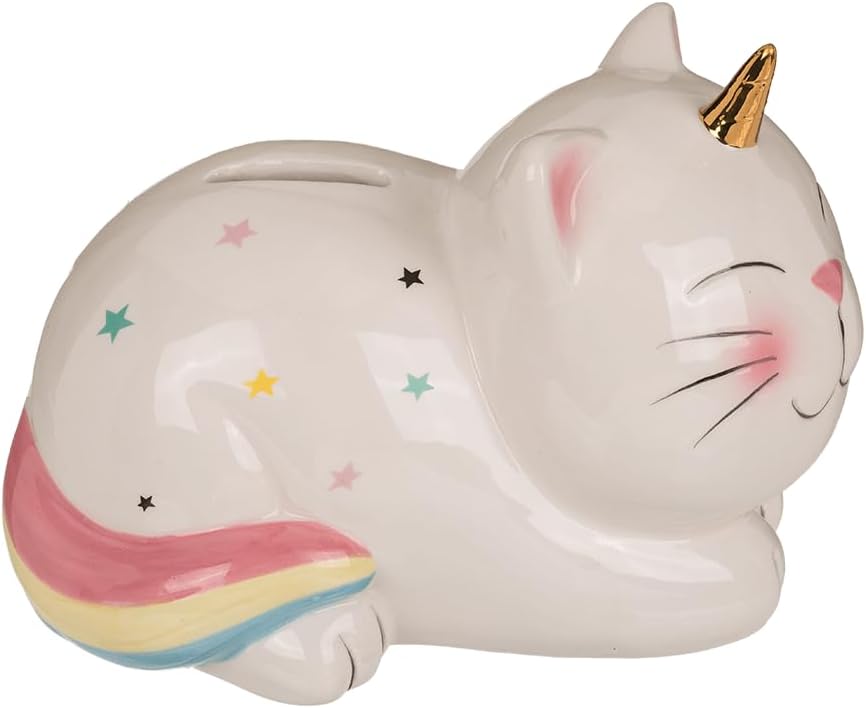 Salvadanaio in ceramica come gatto unicorno - unicorno di risparmio - salvadanaio gatto - salvadanaio Motivo: gatto unicorno Colore: bianco - colorato Taglia L/L/A: ca. 17 x 12 x 12 cm Questo bellissimo salvadanaio grande è un regalo ideale in denaro e funziona proprio come un tradizionale salvadanaio. Perfetto per insegnare ai bambini a salvare o sorprendere una persona cara. La statuetta di risparmio in ceramica ha una chiusura sul fondo, che può essere facilmente aperta e richiusa con la chiave disponibile. Ciò significa che hai accesso ai tuoi risparmi in qualsiasi momento. Il salvadanaio ha una grande fessura nella quale si possono inserire molto bene anche le banconote piegate. Ottima decorazione per la cameretta di ogni bambino o adolescente. Puoi trovare altre fantastiche idee regalo e decorative inserendo "Dekohelden24" nel campo di ricerca di Amazon.