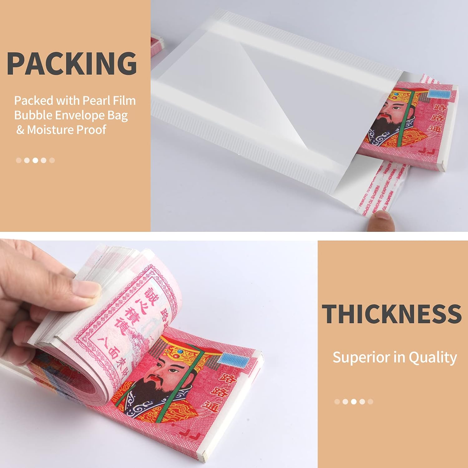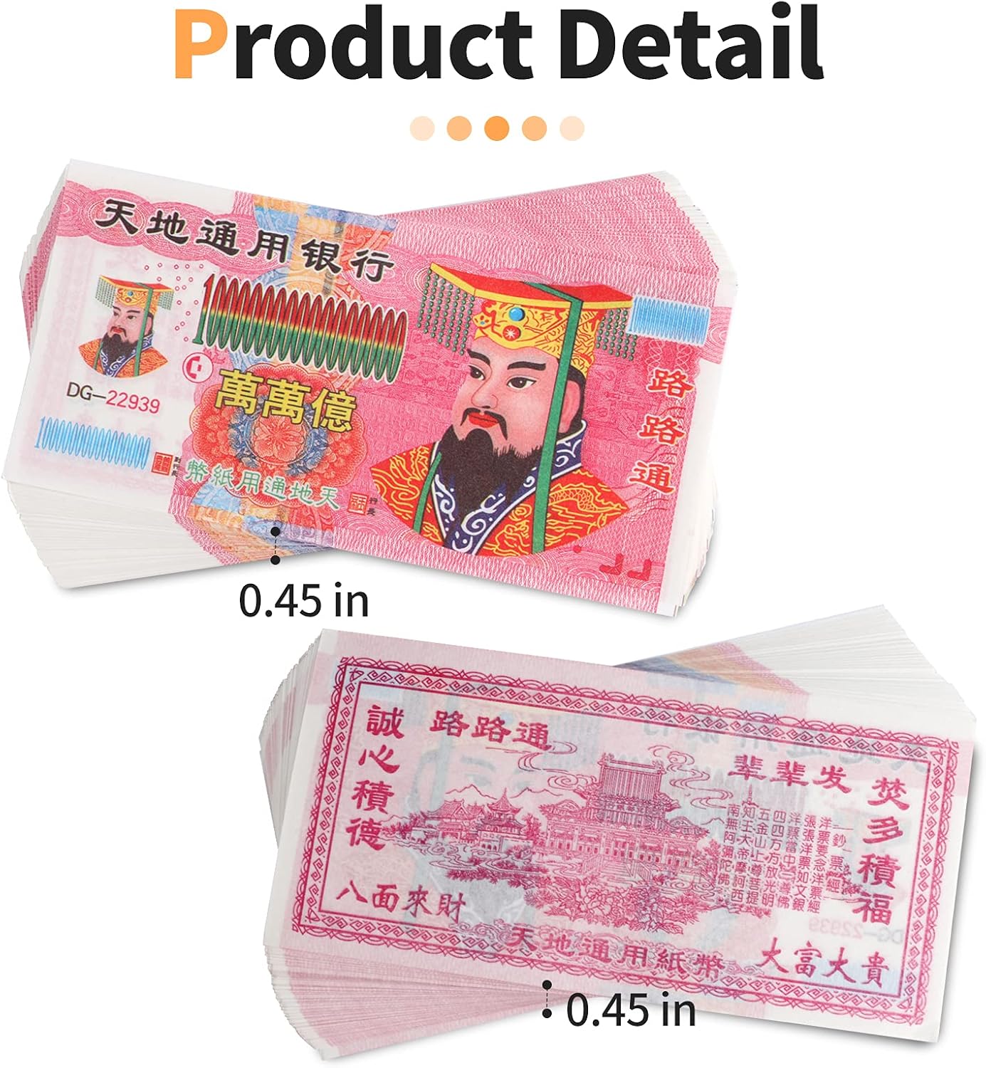 Il denaro ancestrale ha sinonimi conosciuti come denaro fantasma, carta joss, denaro infernale, note paradisiache, ecc. La visione desiderata era che i membri della famiglia più amati deceduti potessero utilizzare questa "banconota" in un altro mondo per guadagnarsi una vita migliore e cercare nuovamente l'amore. Nella cultura globale, bruciamo la carta Joss per gli antenati durante le festività speciali. Dare per scontato il suo utilizzo: funerali, spazzamento di tombe, anniversario della morte ancestrale, Commemorazione dei defunti, festa dell'Obon. Il giorno in cui sei preoccupato, ti manca profondamente e la piangi. Non solo le persone viventi possono percepire e consegnare, ma anche quegli spiriti che sono chiaramente percepiti dai bruciatori di denaro ancestrali. L'intero processo è in realtà uno scambio di informazioni spirituali. Tale comunicazione e donazione agli antenati può essere considerata una benedizione. 【Imballaggio e pesatura】2 pacchi, un pacco da 100 fogli. Ogni foglio misura circa 15,3 x 7,5 cm. Questa valuta è molto colorata e di colore brillante. Molto facile da bruciare completamente. Nota: la carta moneta non è una valuta avente corso legale emessa da una banca o da un istituto governativo e non ha valore in contanti.