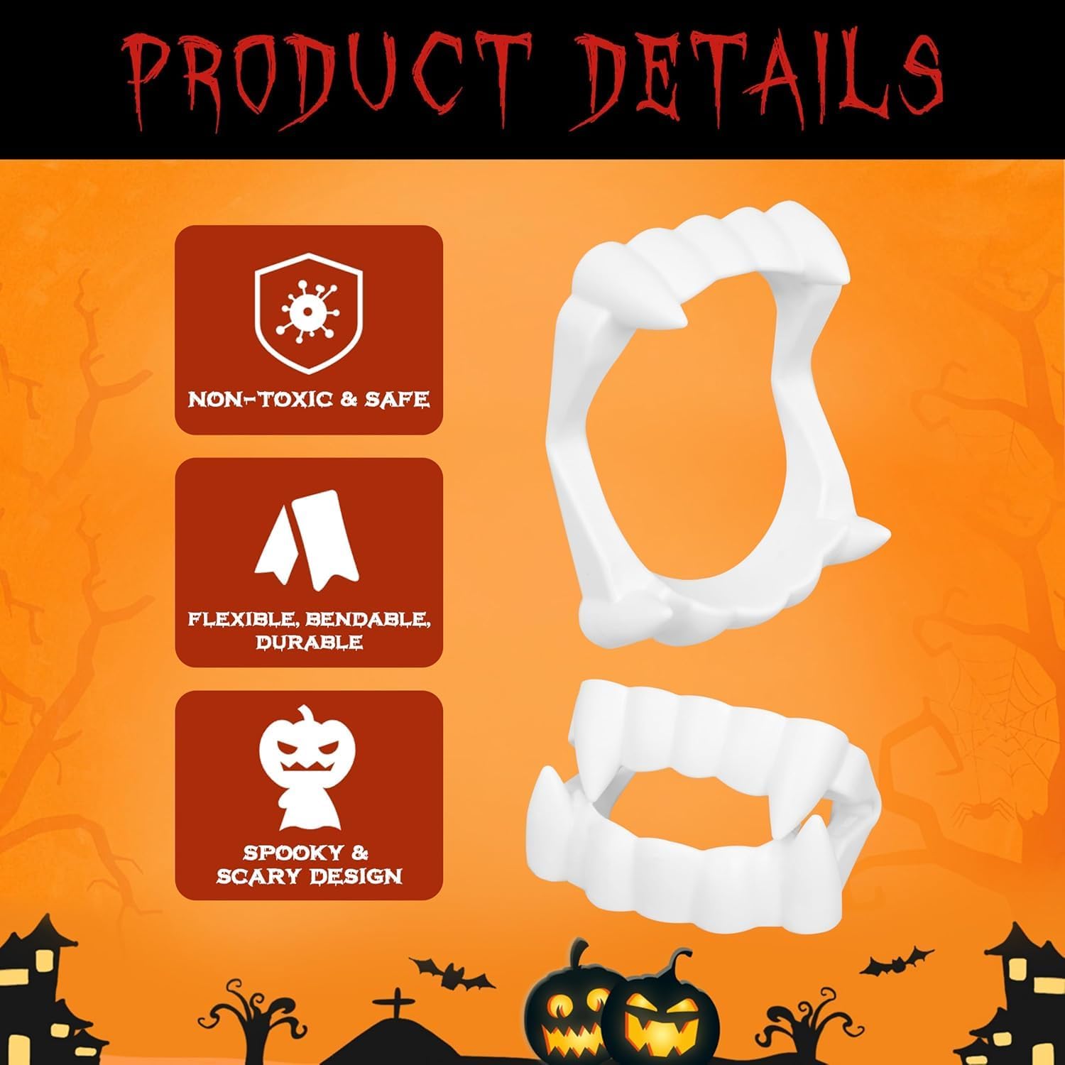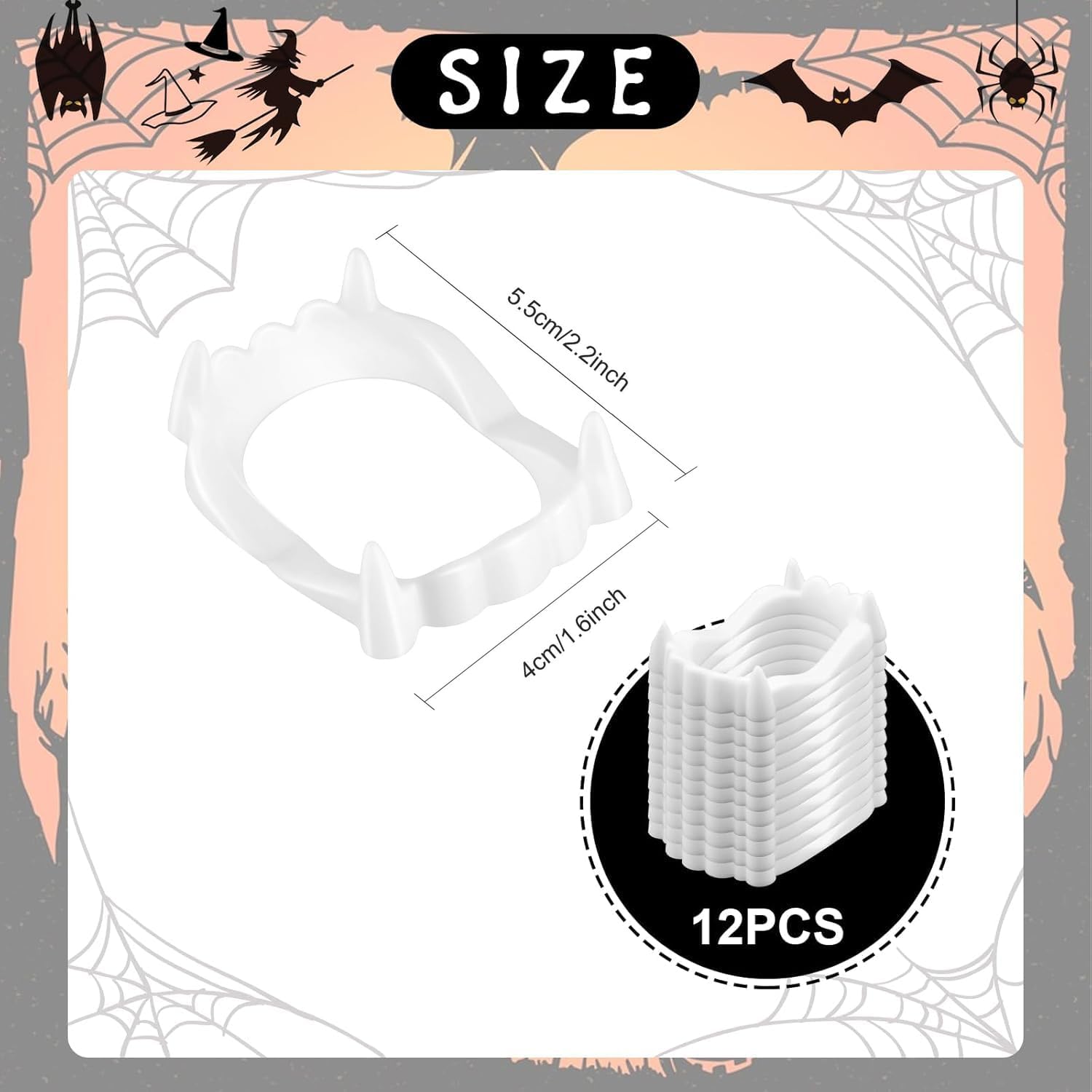Particolarità: i denti di questa protesi hanno una forma regolare e punte arrotondate, quindi non graffiano quando indossati. Il design flessibile non interferisce con la lingua ed è particolarmente pratico. Contenuto della confezione: la confezione contiene 12 set di denti da vampiro classici e facili da usare. Puoi usarlo per completare il tuo look di Halloween e avere abbastanza per la tua famiglia. Denti da vampiro: questi denti artificiali da vampiro in plastica di alta qualità sono progettati per molte applicazioni. La robusta struttura assicura che rimangano intatti anche durante le feste di Halloween e le avventure dolci o scherzose. Vestibilità confortevole: questi denti da vampiro si trovano comodamente in bocca e offrono una vestibilità sicura sia per bambini che per adulti. Grazie al loro peso ridotto, possono essere indossati anche per lunghi periodi di tempo senza alcun disagio. Versatile: i nostri denti da vampiro di Halloween misurano circa 5,5 x 4 cm. I denti da vampiro sono ideali per qualsiasi cosplay, in particolare per maschere da vampiro e feste in costume da vampiro di Halloween per bambini e adulti con bocche piccole.