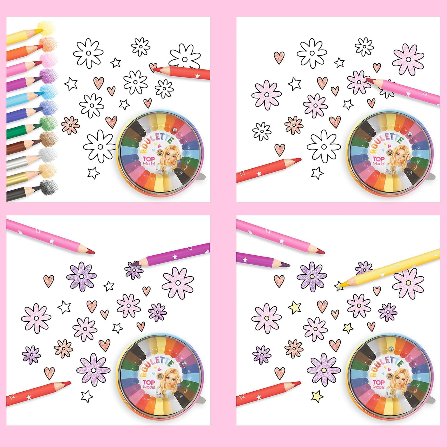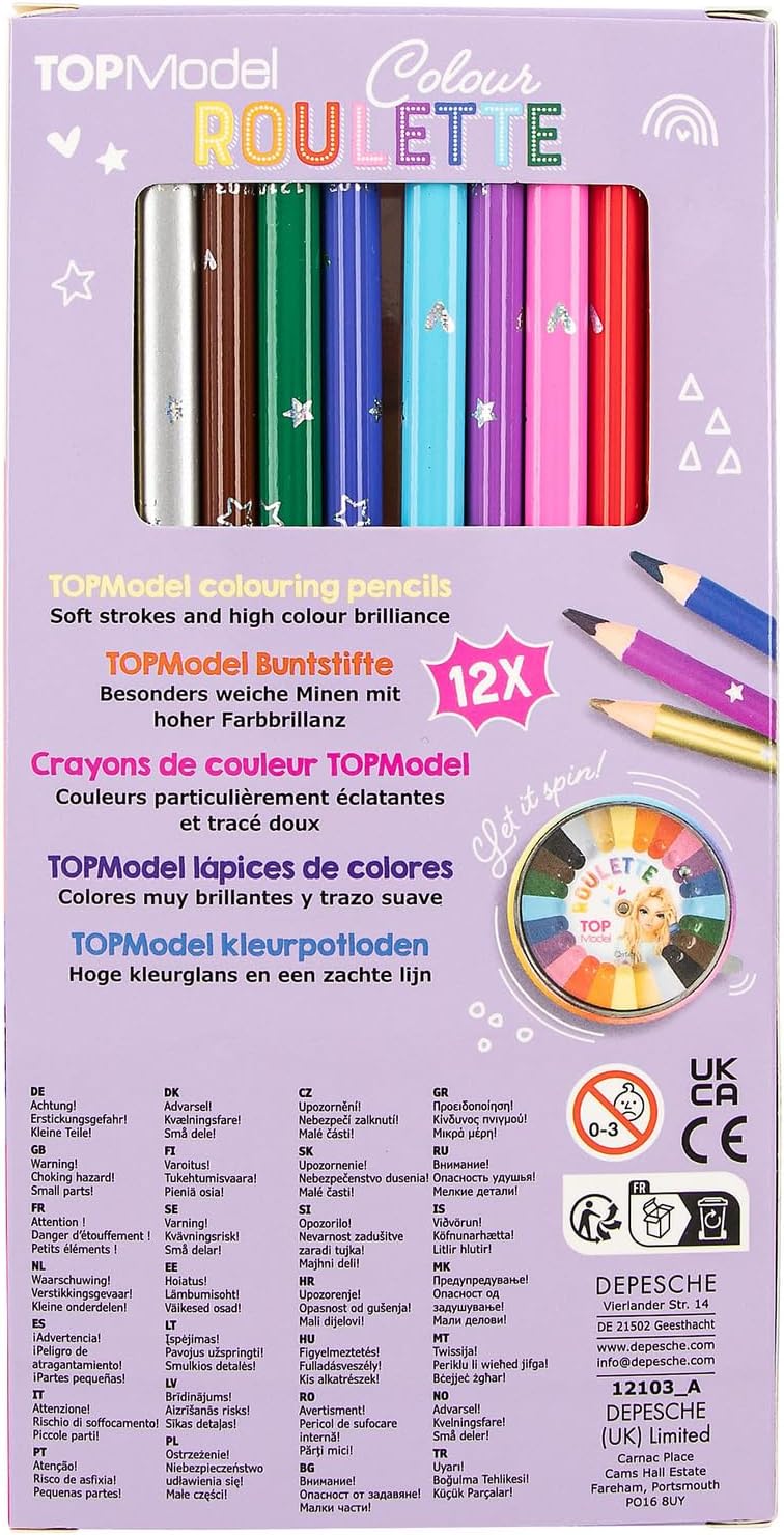 Set da colorare per bambine e menti creative Design: TOPModel di Depesche Include 12 matite colorate sottili in colori vivaci, tra cui oro e argento. La piccola roulette a colori con pallina trasforma la colorazione in un gioco in cui la pallina decide casualmente il colore da utilizzare successivamente. Comprese le istruzioni, dimensioni del set: circa 17,8 x 9 x 2,9 cm