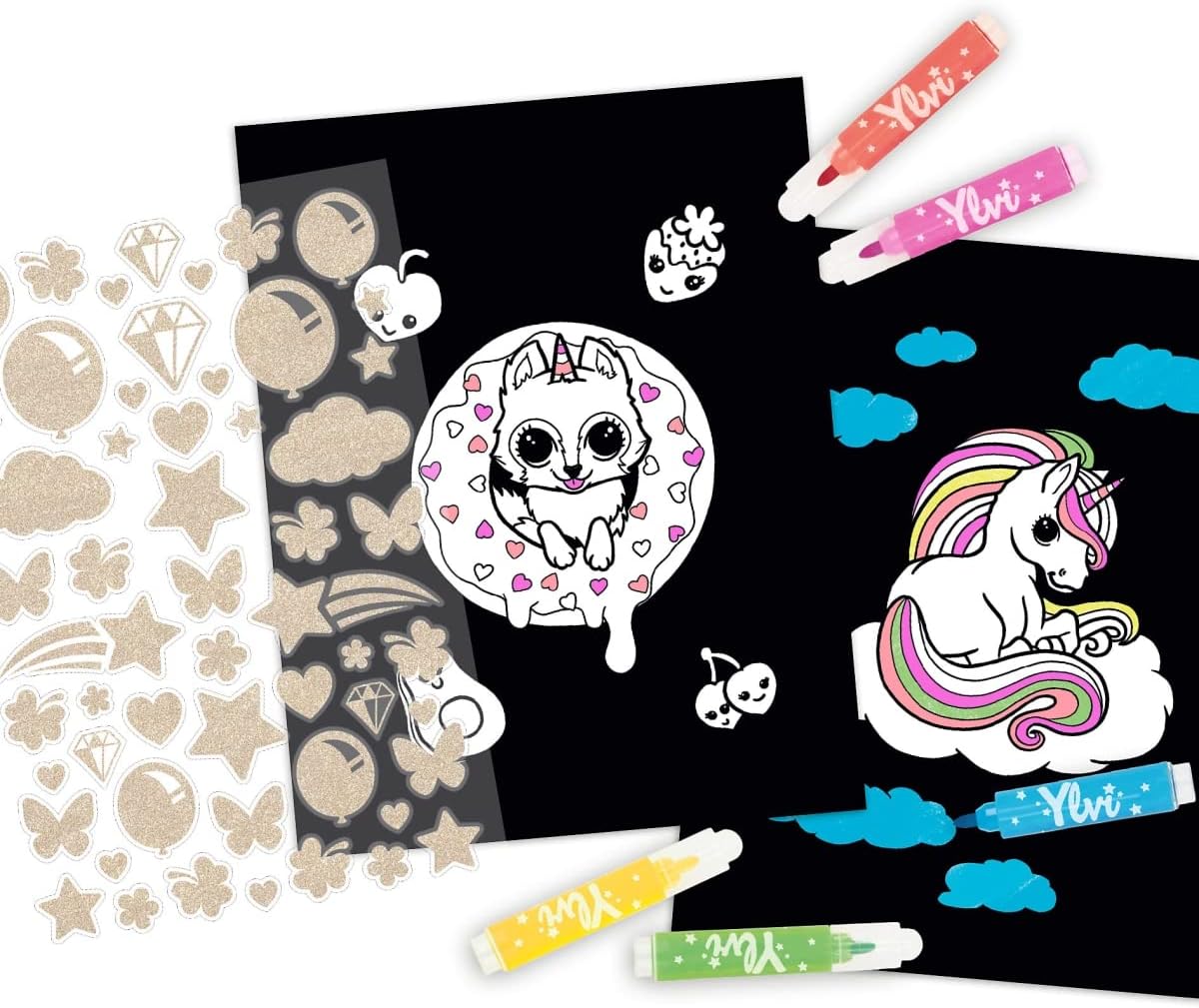 Libro da colorare per ragazze e menti creative Design: Ylvi by Depesche - Pagine prestampate con simpatici motivi su sfondo nero Gli sfondi neri permettono anche ai bambini meno esperti di ottenere ottimi risultati di colorazione e i colori neon vengono ancora meglio. Include 5 pratiche penne a punta di fibra nei colori radiosi rosa, blu, arancione, verde e giallo e un foglio di adesivi con glitter dorati. Dimensioni del set: ca. 20 x 16,4 x 2,7 cm