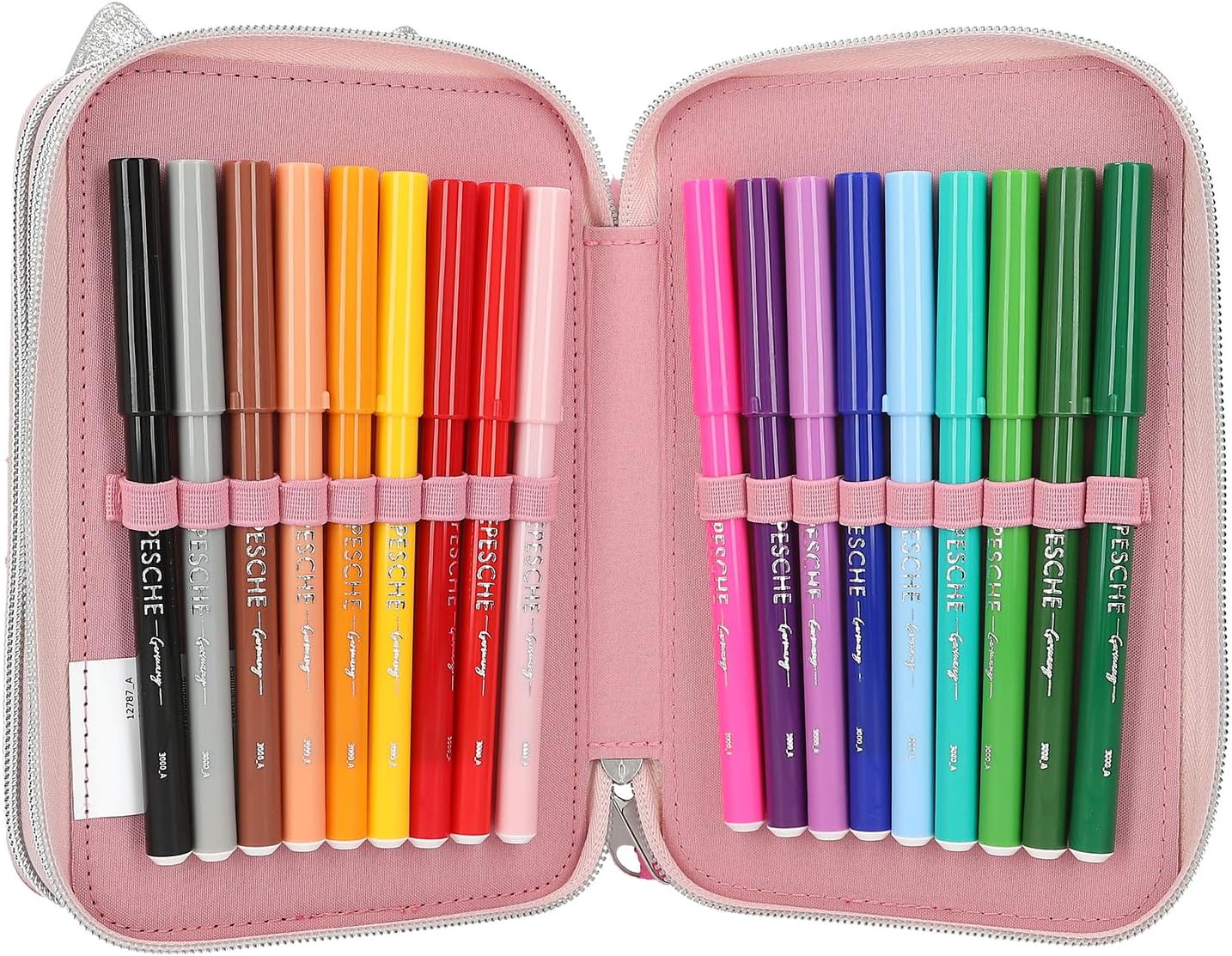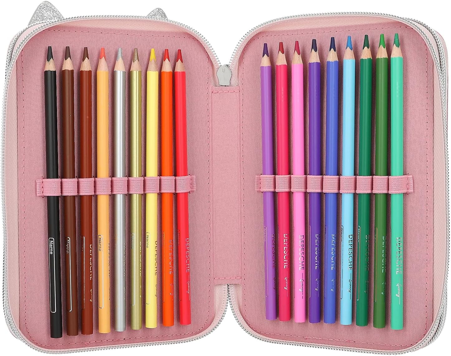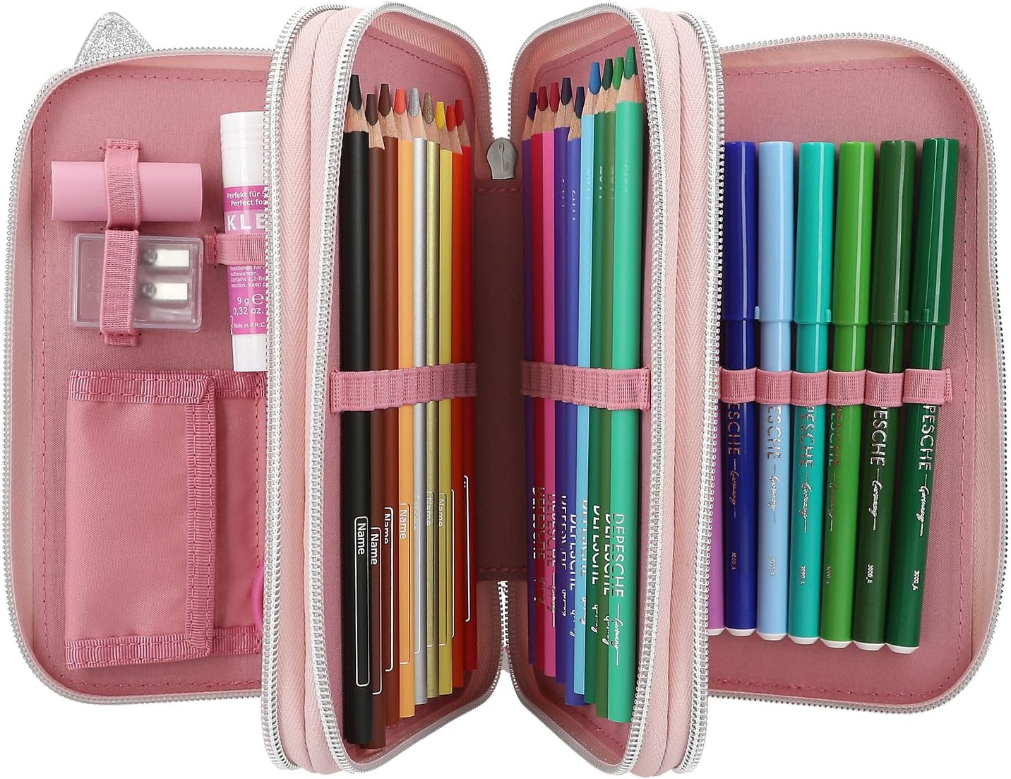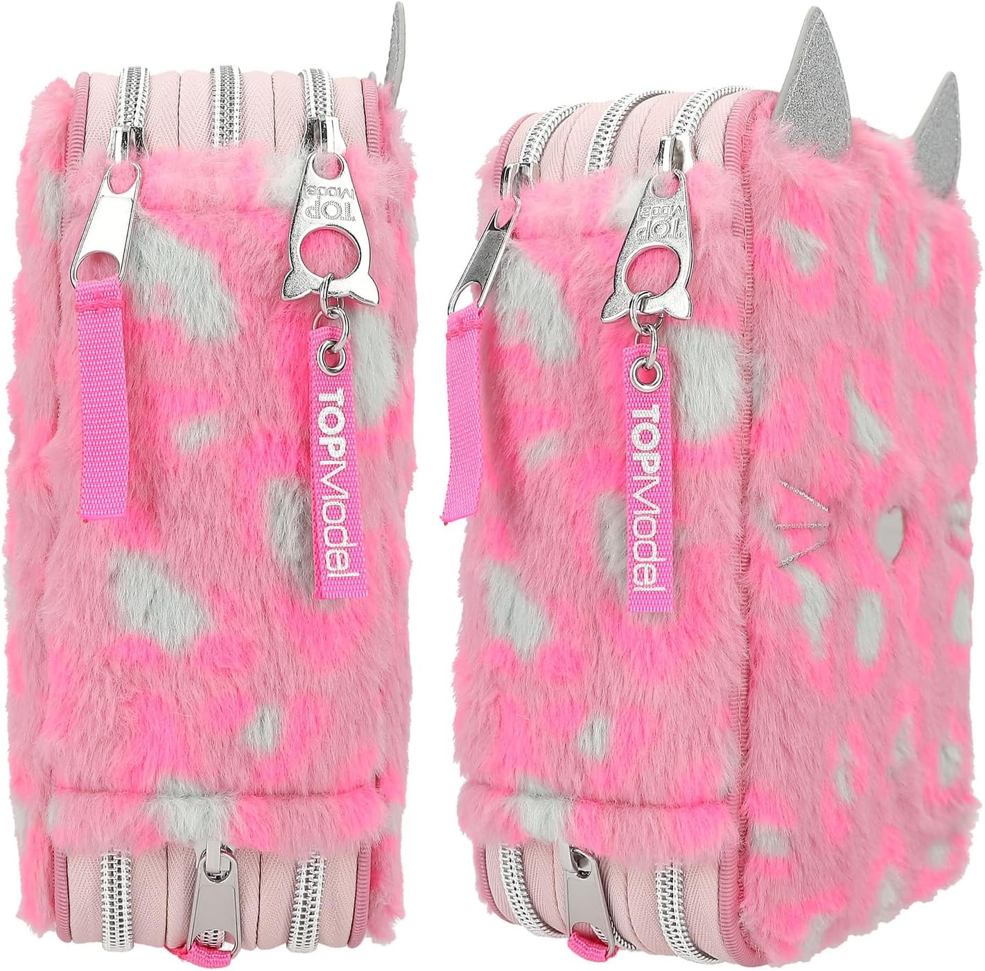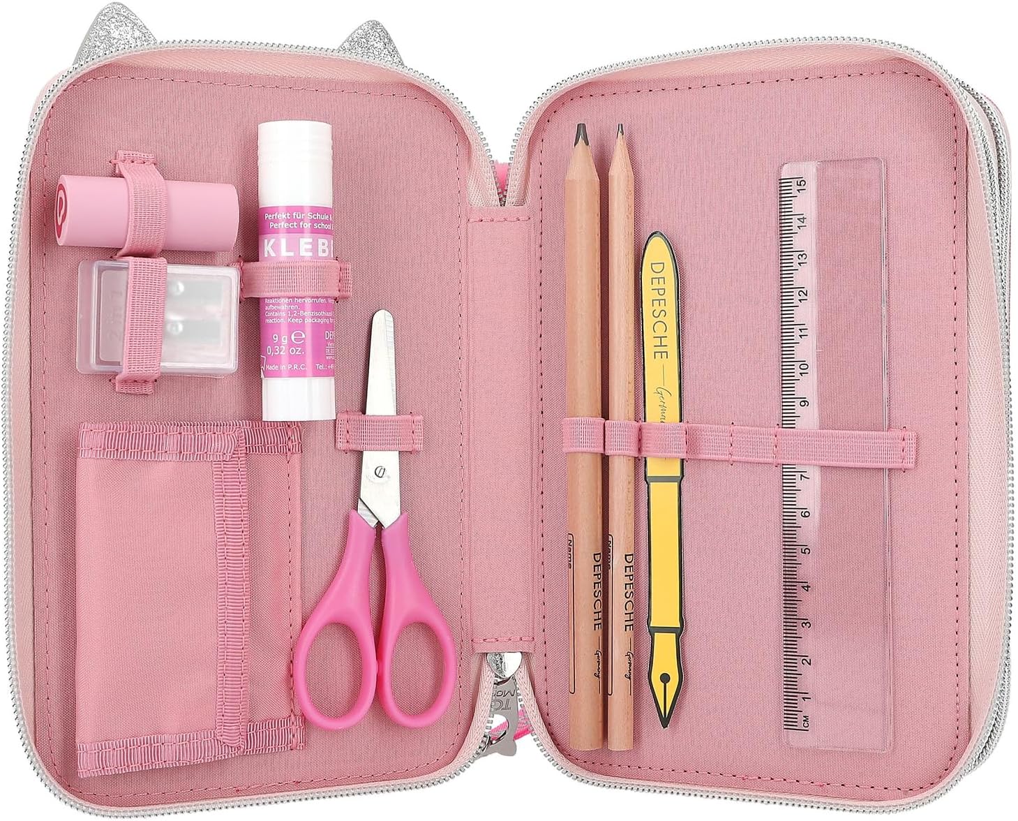 Penna stilografica per ragazze a scuola, all'asilo e nel tempo libero Design: TOPModel Leo di Depesche - In rosa, con baffi, naso a forma di cuore e motivo maculato. Riempita con 18 matite colorate e pennarelli, 2 matite, gomma, temperamatite, righello, forbici, colla stick e piccola borsa in velcro. Extra cool: le scintillanti orecchie di gatto in argento Dimensioni: ca. 20 x 13 x 7,5 cm (L x P x A)