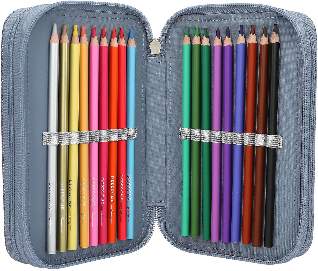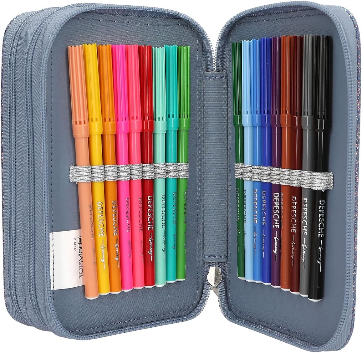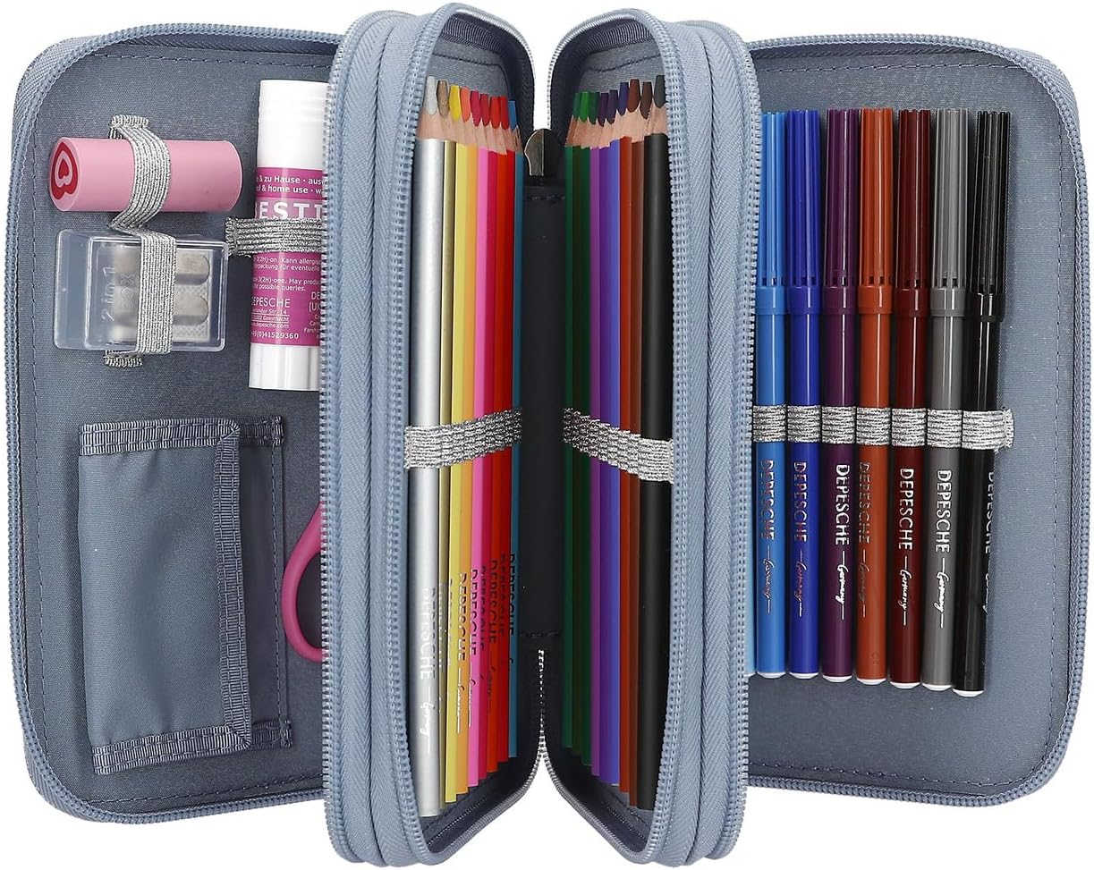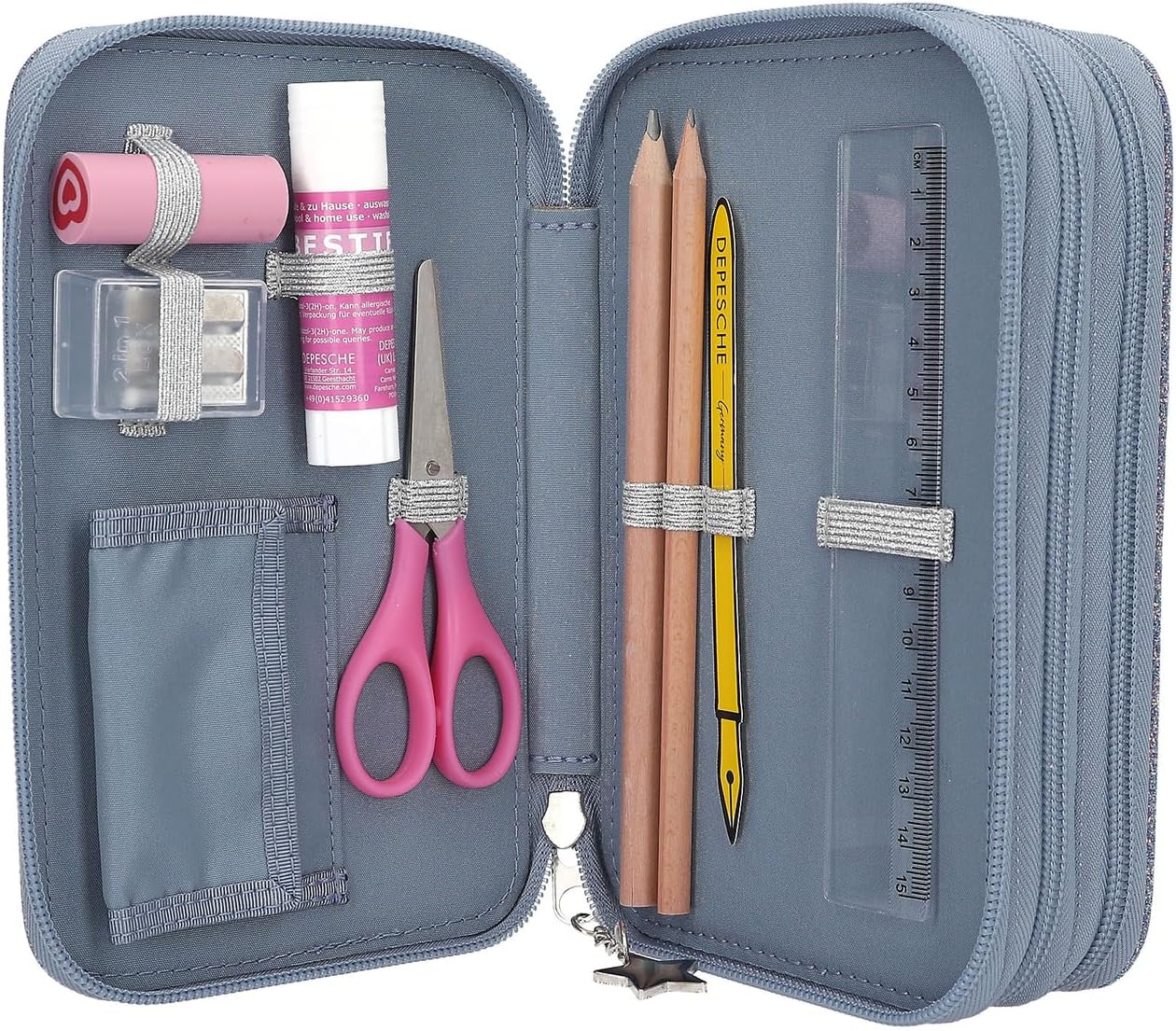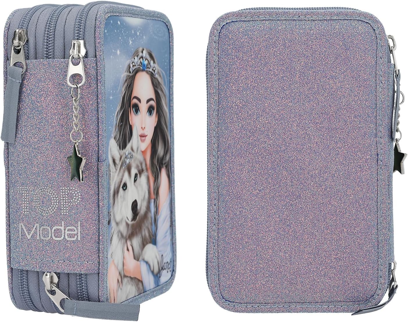 Astuccio per ragazze a scuola, all'asilo e nel tempo libero Design: TOPModel Wolf di Depesche - In blu scuro, con modello e motivo di lupo, cielo stellato e tanti glitter Riempito con 18 matite colorate e pennarelli, 2 matite, gomma, temperamatite, righello, forbici e colla stick Extra interessante: il ciondolo a stella argentato sulla cerniera Dimensioni: ca. 20 x 13 x 7,5 cm