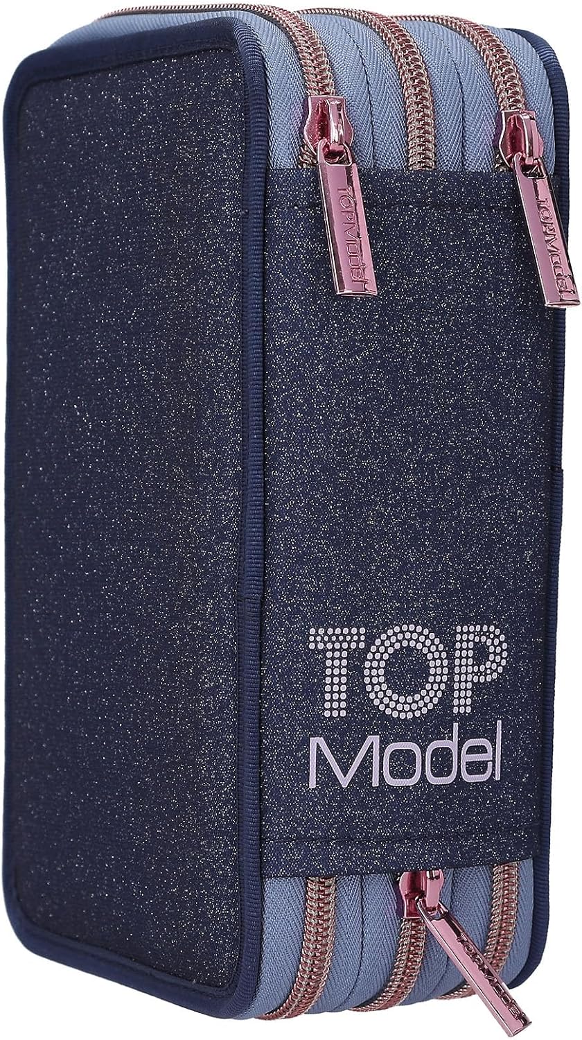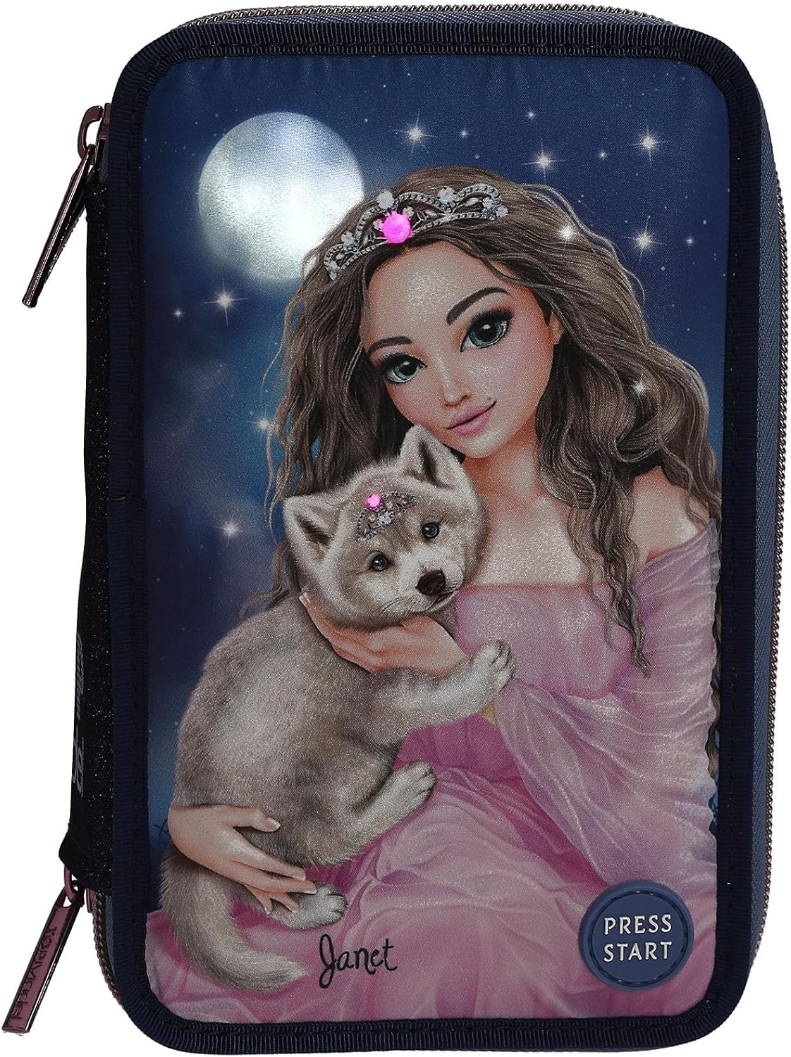Astuccio per matite per ragazze a scuola, all'asilo e nel tempo libero Design: TOPModel LED Wolf by Depesche - In blu scuro, con motivo del modello, cucciolo di lupo e cielo notturno come sfondo Con 18 matite colorate e 18 pennarelli, 2 matite, gomma, temperino, righello, forbici e colla stick. Un extra interessante: le luci LED della luna e delle stelle sul motivo frontale si accendono premendo un pulsante. Dimensioni: circa 20 x 13 x 7,5 cm