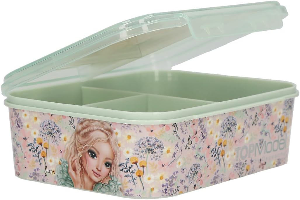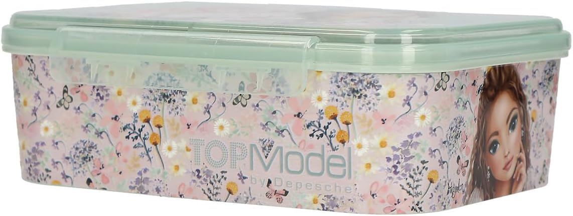 Snack box per le ragazze a scuola, nel tempo libero e in viaggio Design: TOPModel Summer Feeling by Depesche - In rosa e verde salvia, con motivo di modelle, un motivo floreale e farfalle Scatola per il pane con 1 scomparto grande e 2 scomparti più piccoli per una pratica separazione degli spuntini e spazio sufficiente per snack, frutta, verdura ecc. Pratico coperchio con chiusura a clip Dimensioni: circa 17,2 x 14,2 x 5,7 cm, non adatto alla lavastoviglie e al microonde