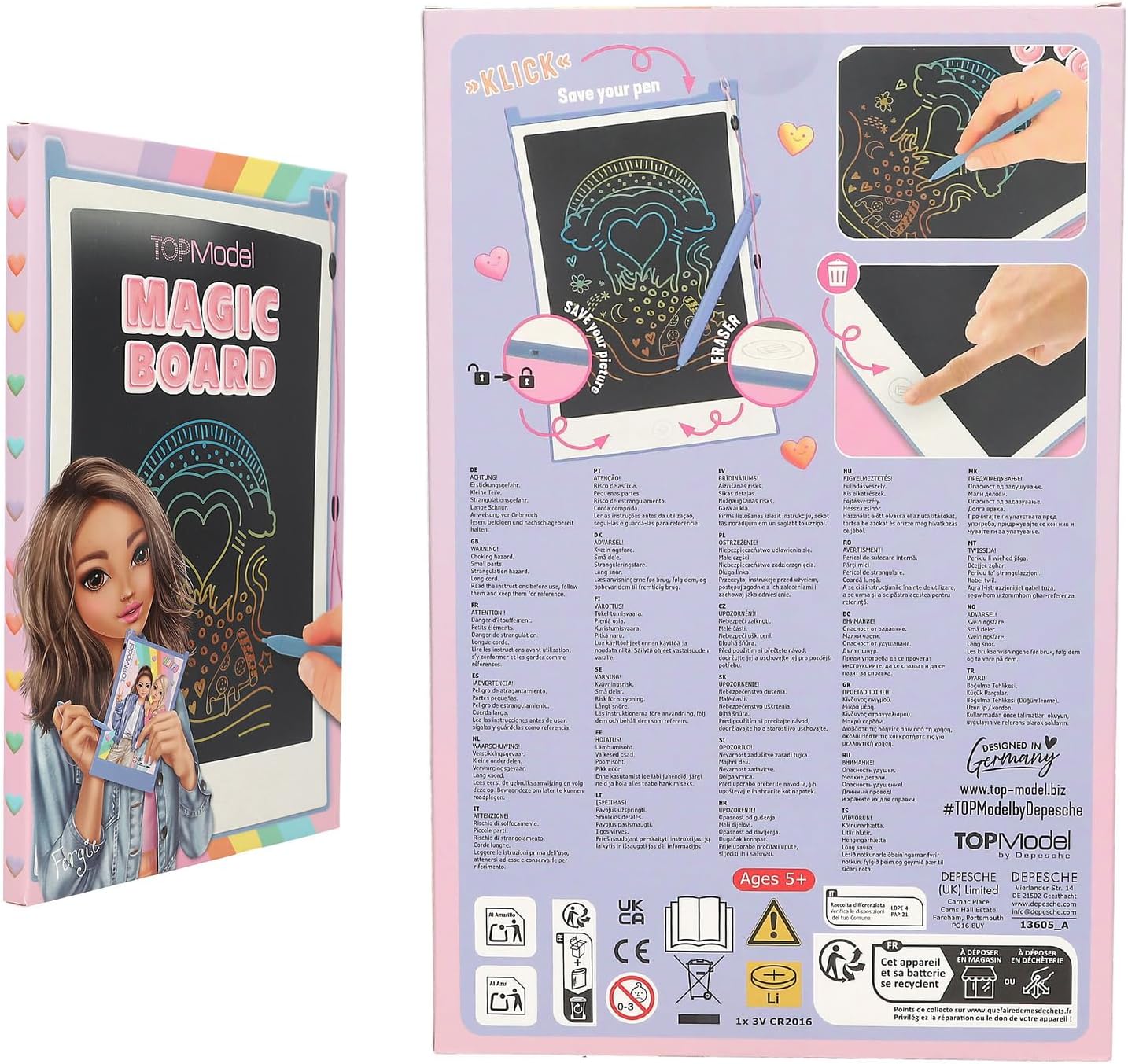 Lavagna per scrivere e colorare per bambine e menti creative Design: TOPModel by Depesche - Con involucro azzurro, motivo del modello e penna allegata Sul display appaiono i colori giallo, arancione, verde e blu. Con i pulsanti di cancellazione e salvataggio, è sempre possibile ricominciare dall'inizio o continuare l'opera d'arte in un secondo momento. Il display nell'alloggiamento blu ha una dimensione di 8,5 pollici