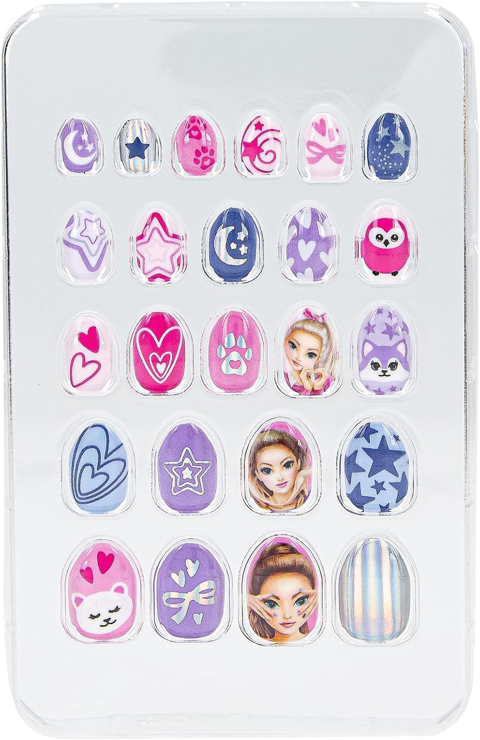 Unghie artificiali da incollare per bambine Design: TOPModel Beauty and Me by Depesche - Leggermente affusolata, con molti motivi colorati, nei toni del rosa e del viola, con molti glitter ed effetti brillanti. Contenuto: 24 unghie colorate di diverse dimensioni Chiodi autoadesivi Chic - non è necessario un adesivo aggiuntivo, facile da applicare e rimuovere di nuovo Splendida idea regalo grazie alla graziosa confezione