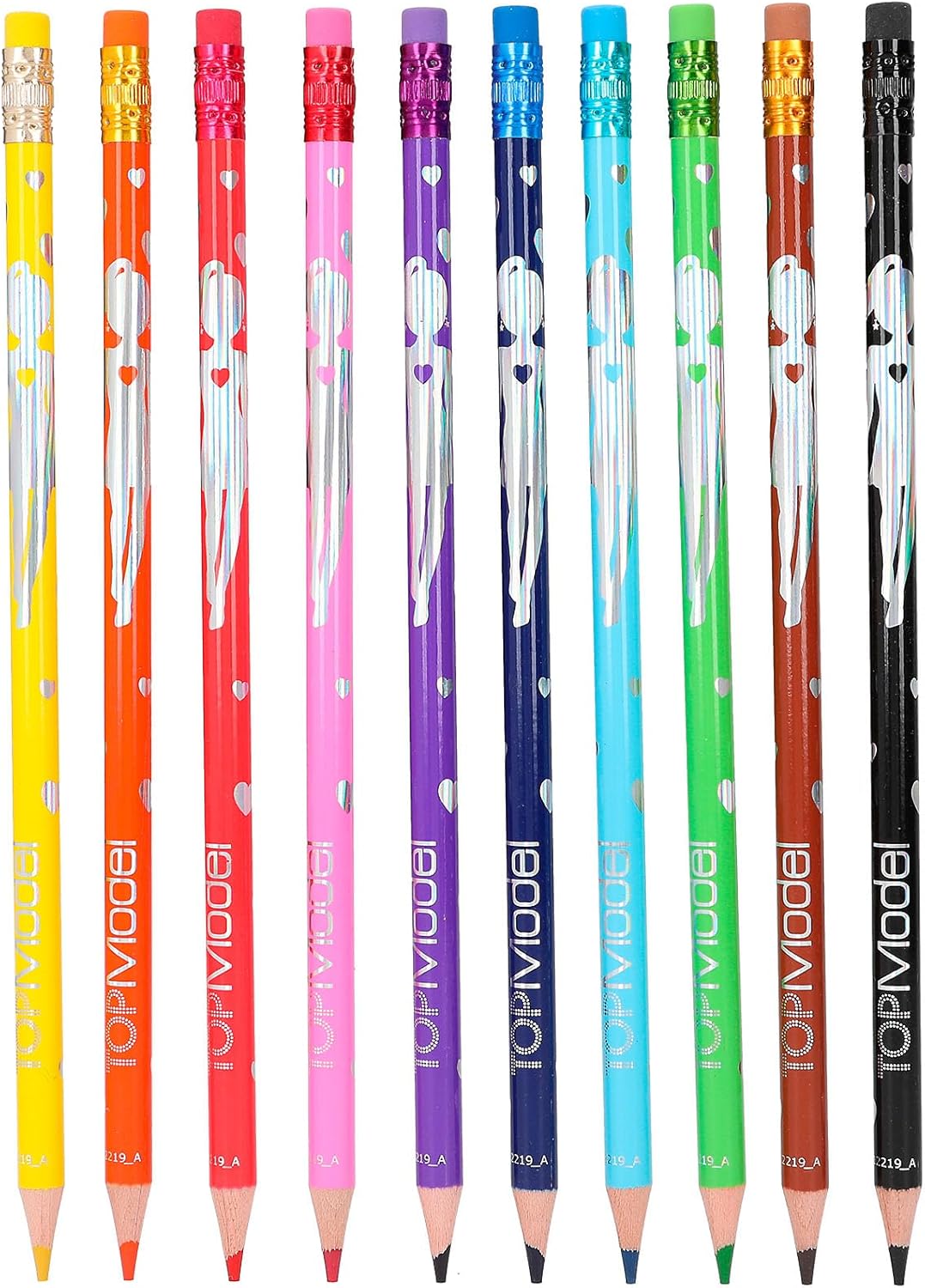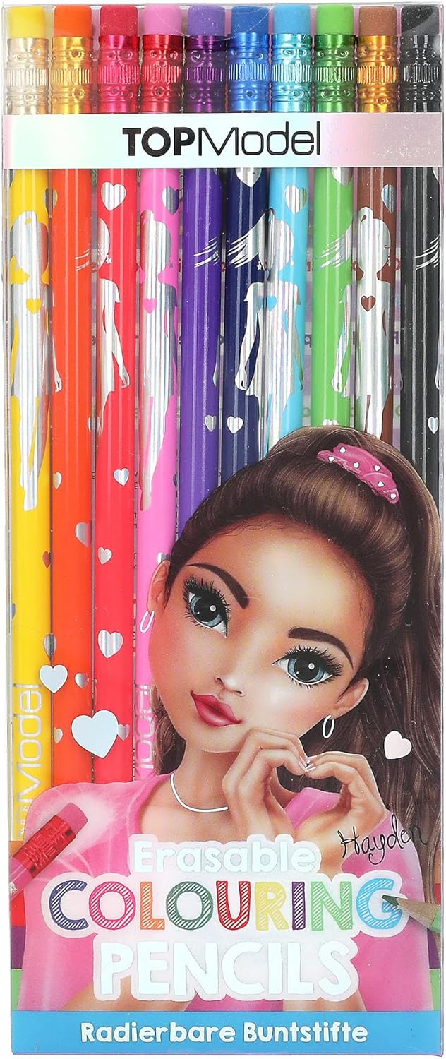 Confezione da 10 matite colorate con inserto in gomma Design: TOPModel by Depesche In pratica custodia in plastica, fusto contrassegnato nel rispettivo colore 10 colori intensi e brillanti (giallo, arancione, rosso, rosa, viola, blu scuro, azzurro, verde, marrone e nero) I dipinti possono essere facilmente cancellati con il topper in gomma