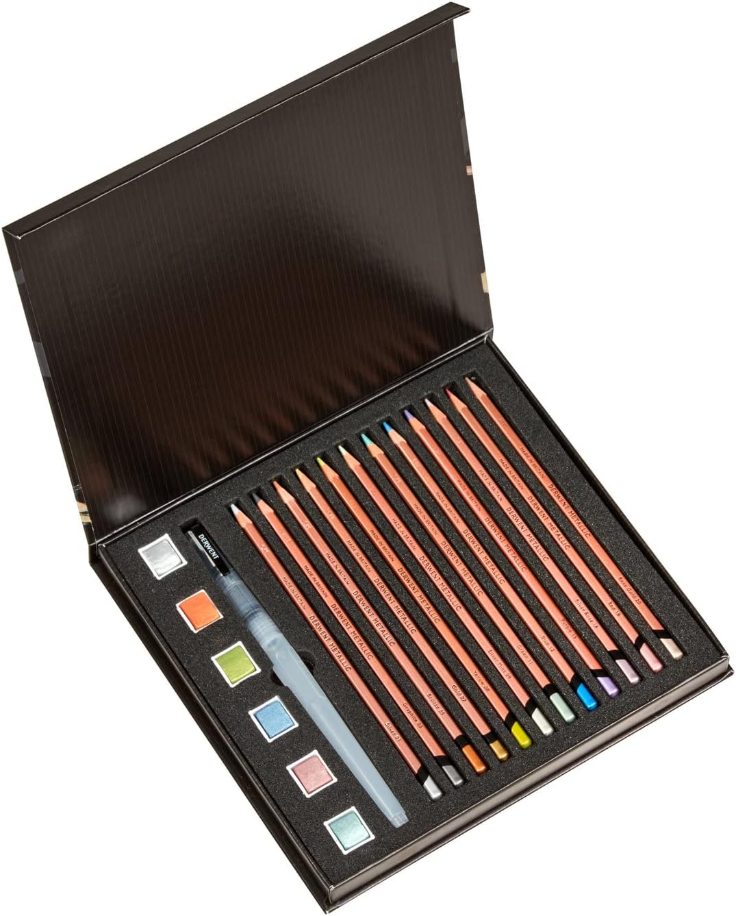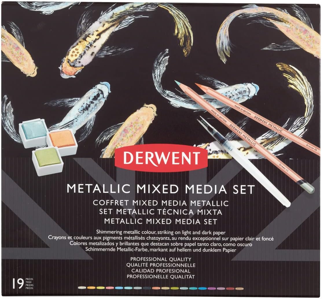 Set Derwent: le vernici e le matite sono formulate con ricchi pigmenti per offrire tonalità metalliche scintillanti, ottime su carta chiara e scura Matite Derwent Metallic: con un nucleo morbido da 3,5 mm che si fonde e si sovrappone facilmente, è indicato per aggiungere i dettagli sulla vernice una volta asciugata Vernici Derwent Metallic: il colore metallico si applica con pennellate opache e cremose, creando strati di tempera scintillante Versatile: il set è adatto agli artisti che realizzano dipinti di arte urbana e paesaggi, oltre che per chi si diletta con lavori da artigianato Contenuto del set Derwent Metallic: confezione regalo da 12 x matite colorate metallizzate, 6 x vernici colorate metallizzate idrosolubili e 1 x waterbrush