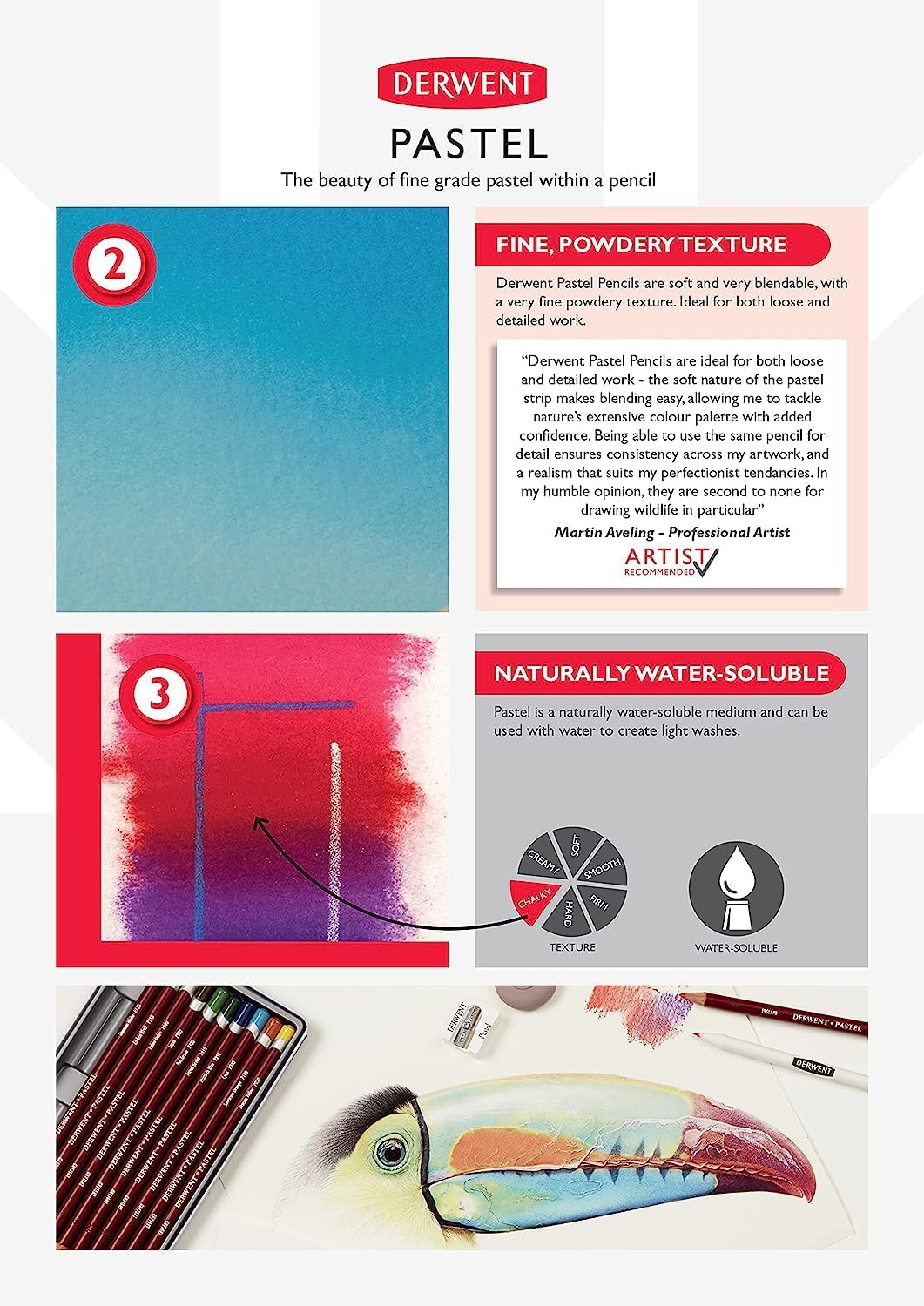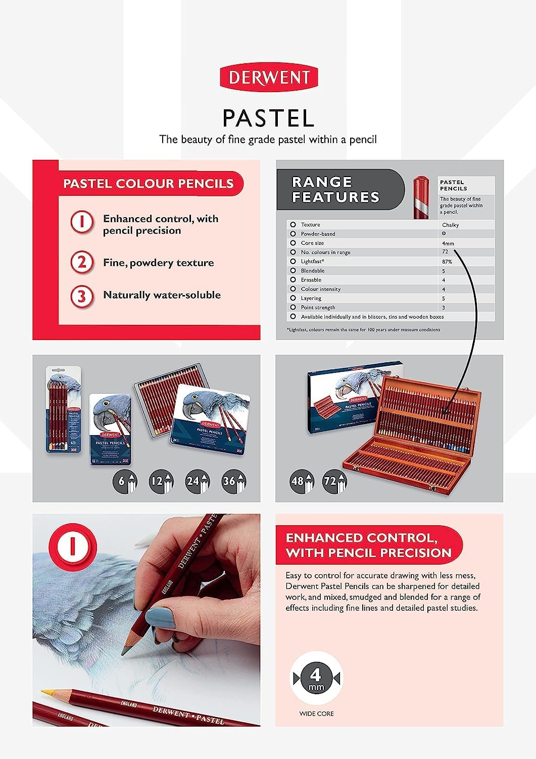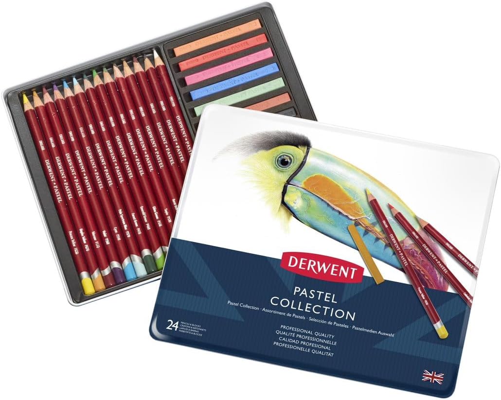 Set Discovery di matite pastello e gessetti di qualità professionale, ideali per testare diverse gamme di prodotti Derwent Pastel Incluso: 14 matite pastello, 8 gessetti pastello, un temperamatite e una gomma per il pane Da utilizzare con carta da disegno Derwent o carta da acquerello; utilizzabile su carta colorata (anche nera) Scatola portaoggetti con coperchio rimovibile per un facile accesso alle matite senza occupare spazio Contiene: 1 set di 24 matite pastello e gessetti Derwent Pastel con accessori