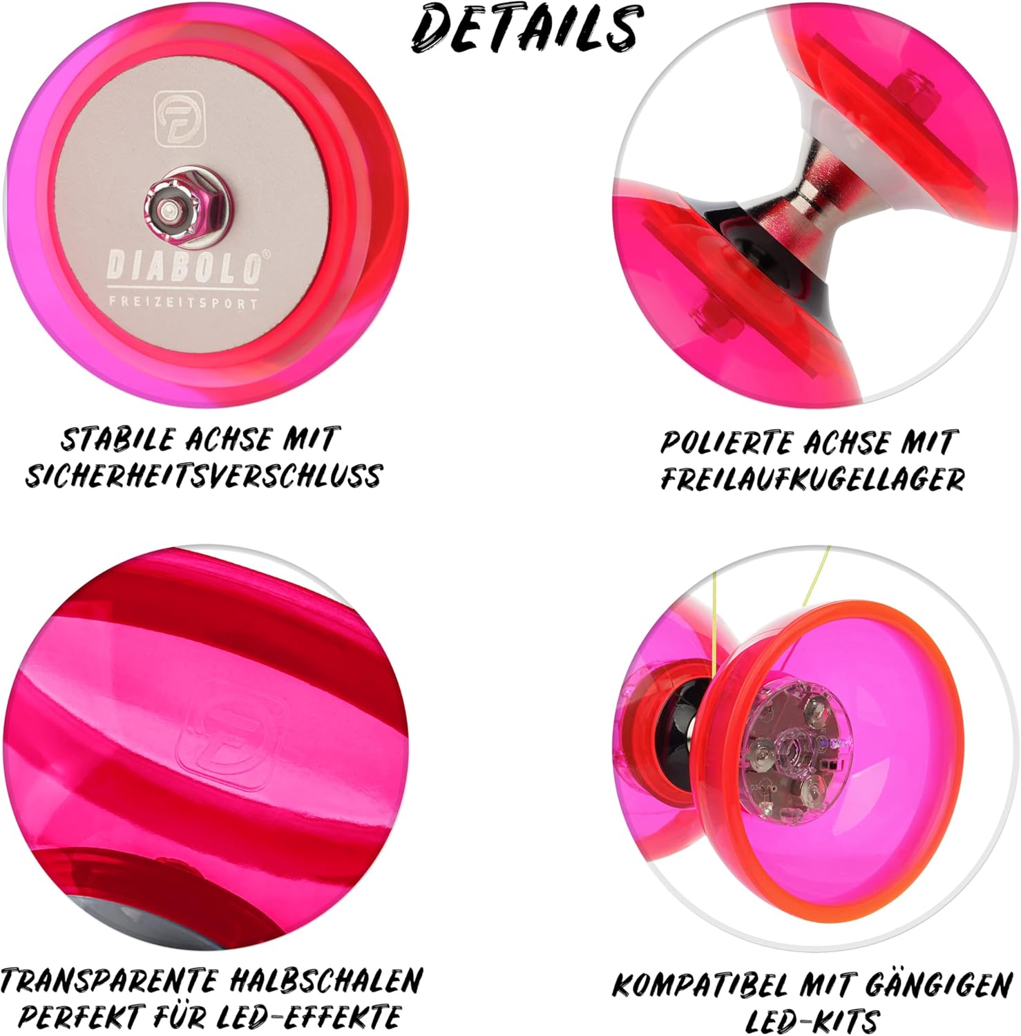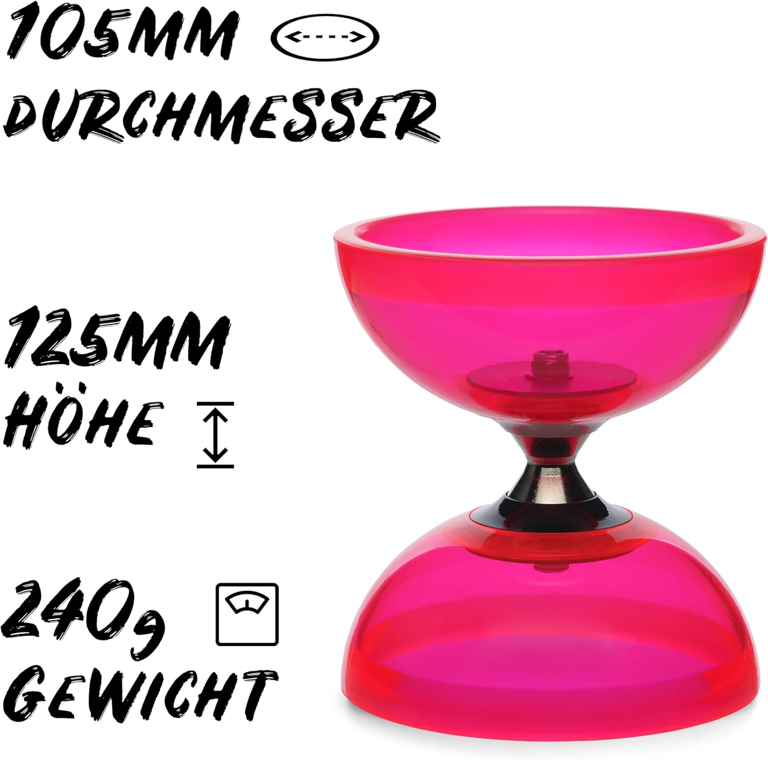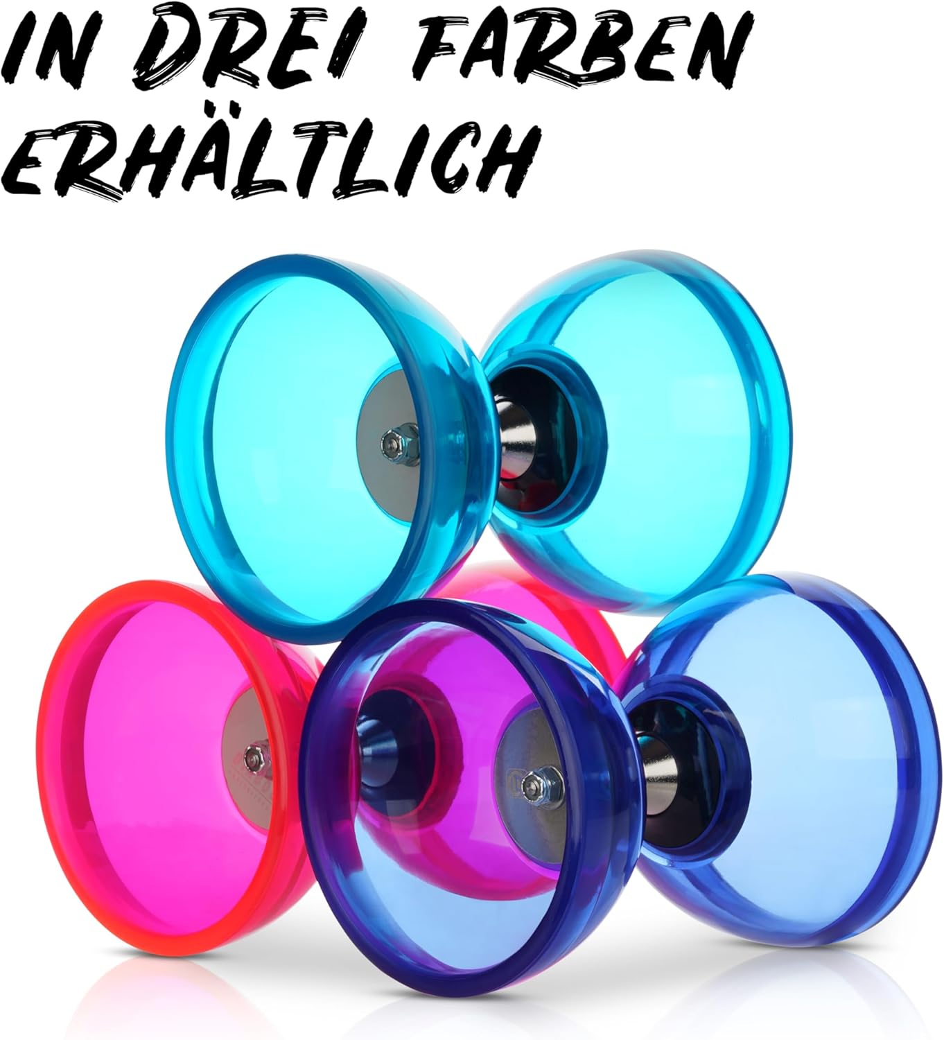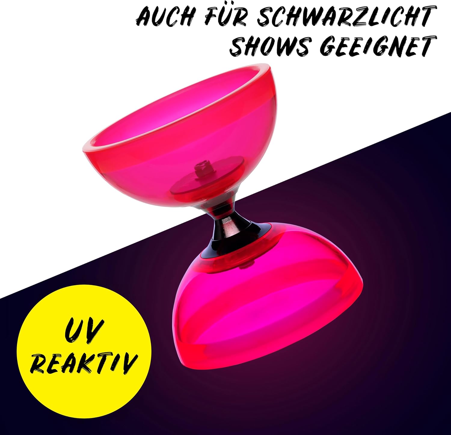 Con ruota libera: grazie all'asse a ruota libera con cuscinetti a sfera, il Diabolo mantiene lo slancio più a lungo, funziona più stabile e la corda non si usura così rapidamente. Reattivo ai raggi UV: le semicusci trasparenti del Diabolo sono realizzate in plastica reattiva UV, cioè nella luce nera il diabolo si illumina. Con aste e cordino di ricambio: le bacchette in alluminio hanno una presa morbida e punte arrotondate in modo che il cavo non si irrigidisca sul bordo. È incluso anche un cavo di ricambio lungo 160 cm. Con istruzioni (lingua italiana non garantita) – il set Diabolo include anche una guida stampata per la giocoleria con l'aiuto di cui puoi imparare rapidamente trucchi emozionanti e spettacolari. Pacchetto arrotondato – Il set nel dettaglio: Diabolo (Ø 105 mm, L: 120 mm, 200 g) con 2 bastoncini in gomma (L: 32,5 cm, 80 gr), 2 lacci (160 cm, 1,3 mm di spessore), istruzioni per la giocoleria e confezione regalo