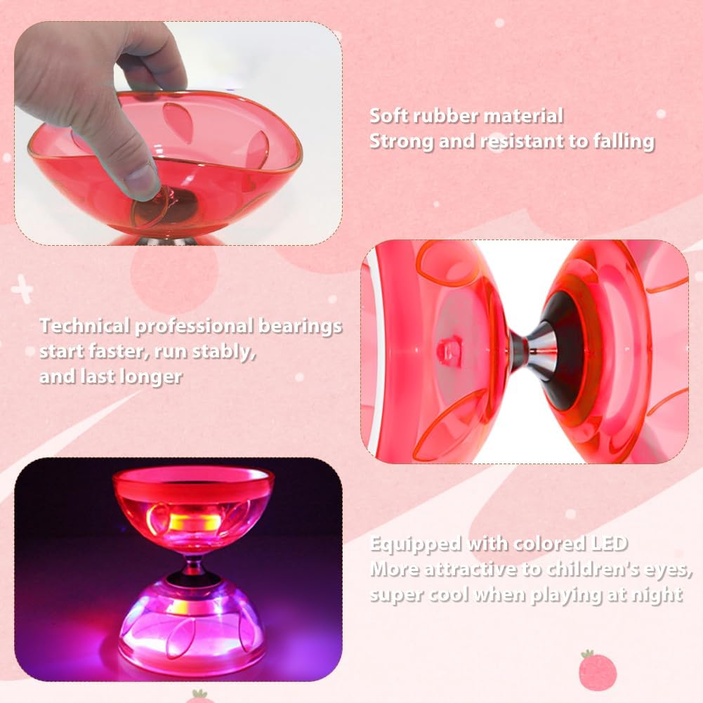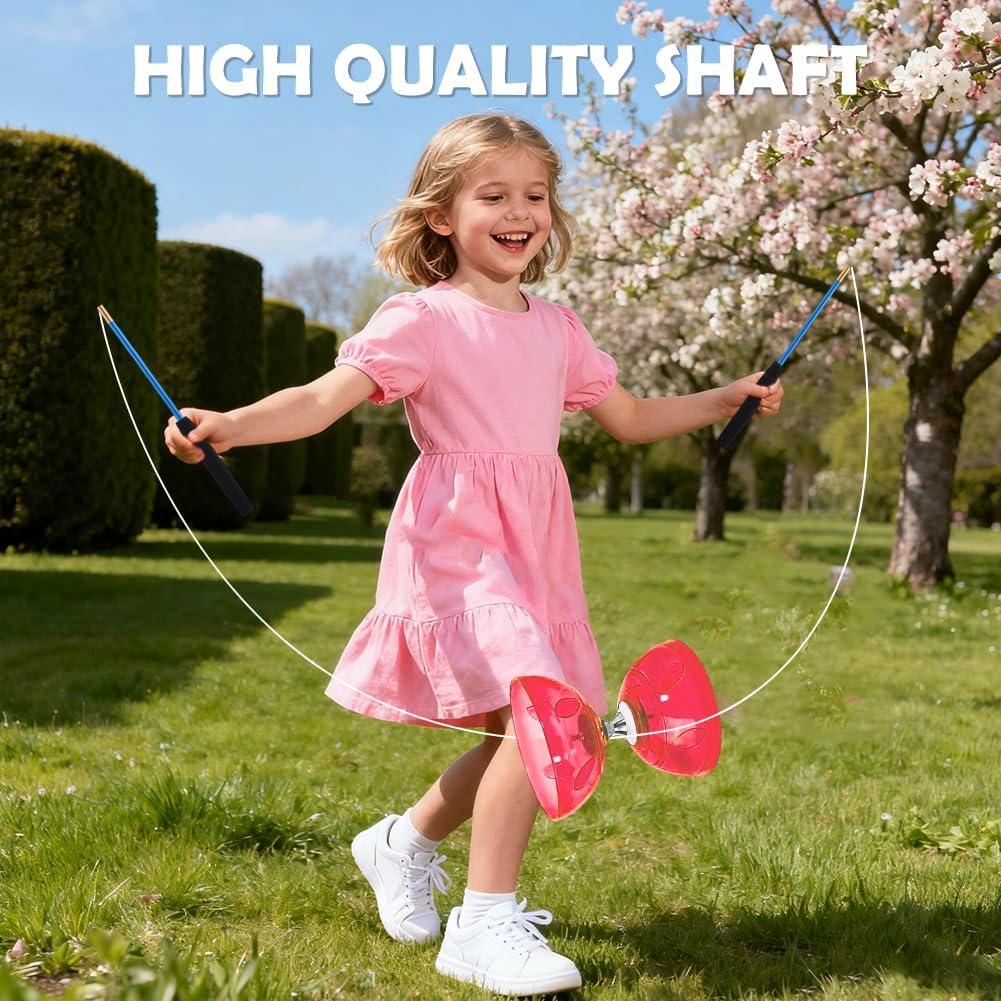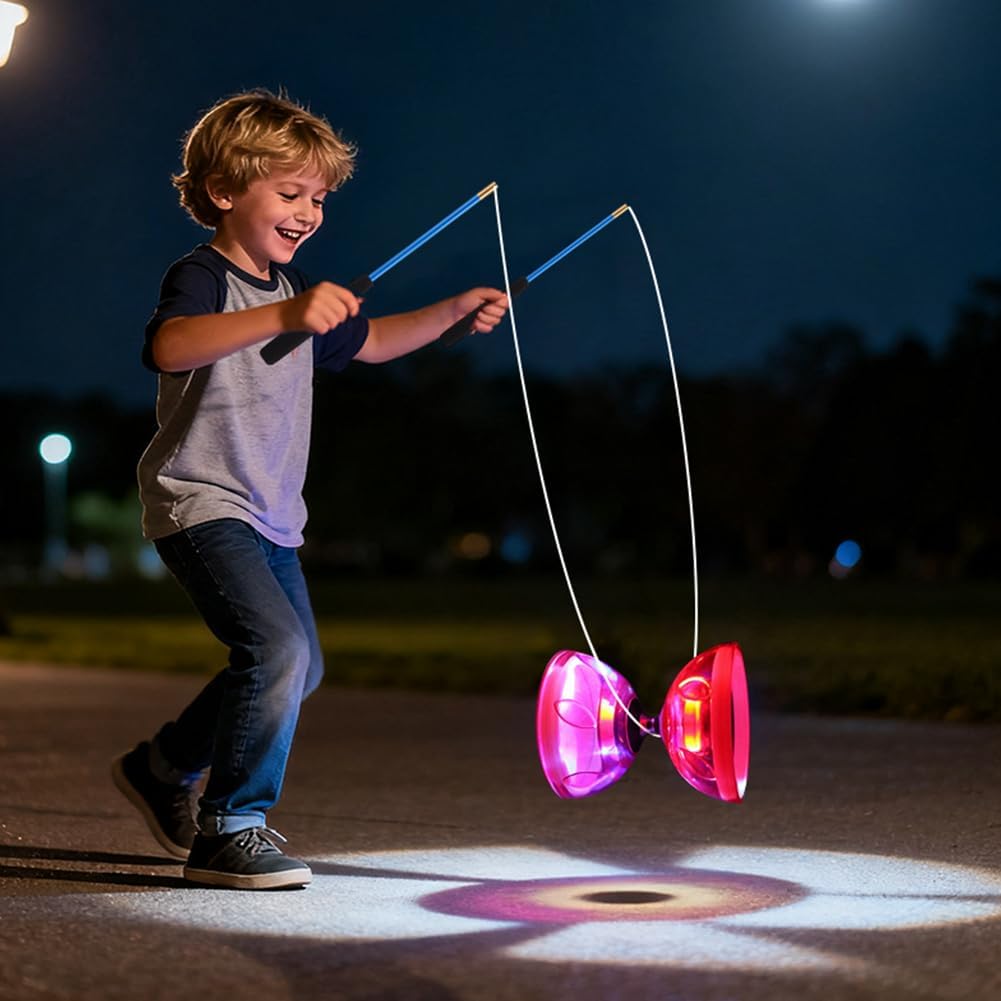 Diabolo di alta qualità con cuscinetti a sfera: questo Diabolo è dotato di un cuscinetto a sfera triplo preciso che garantisce tempi di rotazione più lunghi e un'esperienza professionale. Ideale per professionisti Yoyo e giocatori avanzati che apprezzano le alte prestazioni. Diabolo luminoso per bambini e adulti: il modello Diabolo per bambini si irradia in 4 colori e porta magica atmosfera al buio con luci a LED. Perfetto per principianti di giocoleria e giocatori esperti che vogliono provare trucchi unici. Materiale robusto per giocoleria sicura: il Diabolo da 4,5 mm è realizzato in gomma morbida che assorbe gli urti e previene rotture. Ideale per giocoleria in interni ed esterni, con cordoncino resistente e robusti bastoncini. Set da giocoliere perfetto per tutti i livelli: questo Diavolo per bambini e adulti contiene tutto per iniziare: Diabolo, bastoncini, corda di ricambio e custodia. Anche come alternativa alle palle da giocoleria per diversi allenamenti. Ideale per il tempo libero e le prestazioni, sia al parco, sul palco o a casa, questa esperienza di Juggling Ball è divertente e incoraggia la coordinazione. Un grande regalo per gli appassionati di giochi creativi e sport di tutte le età!