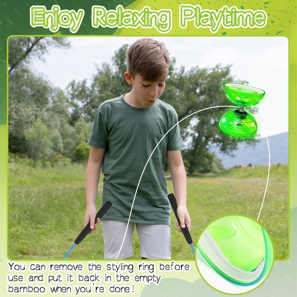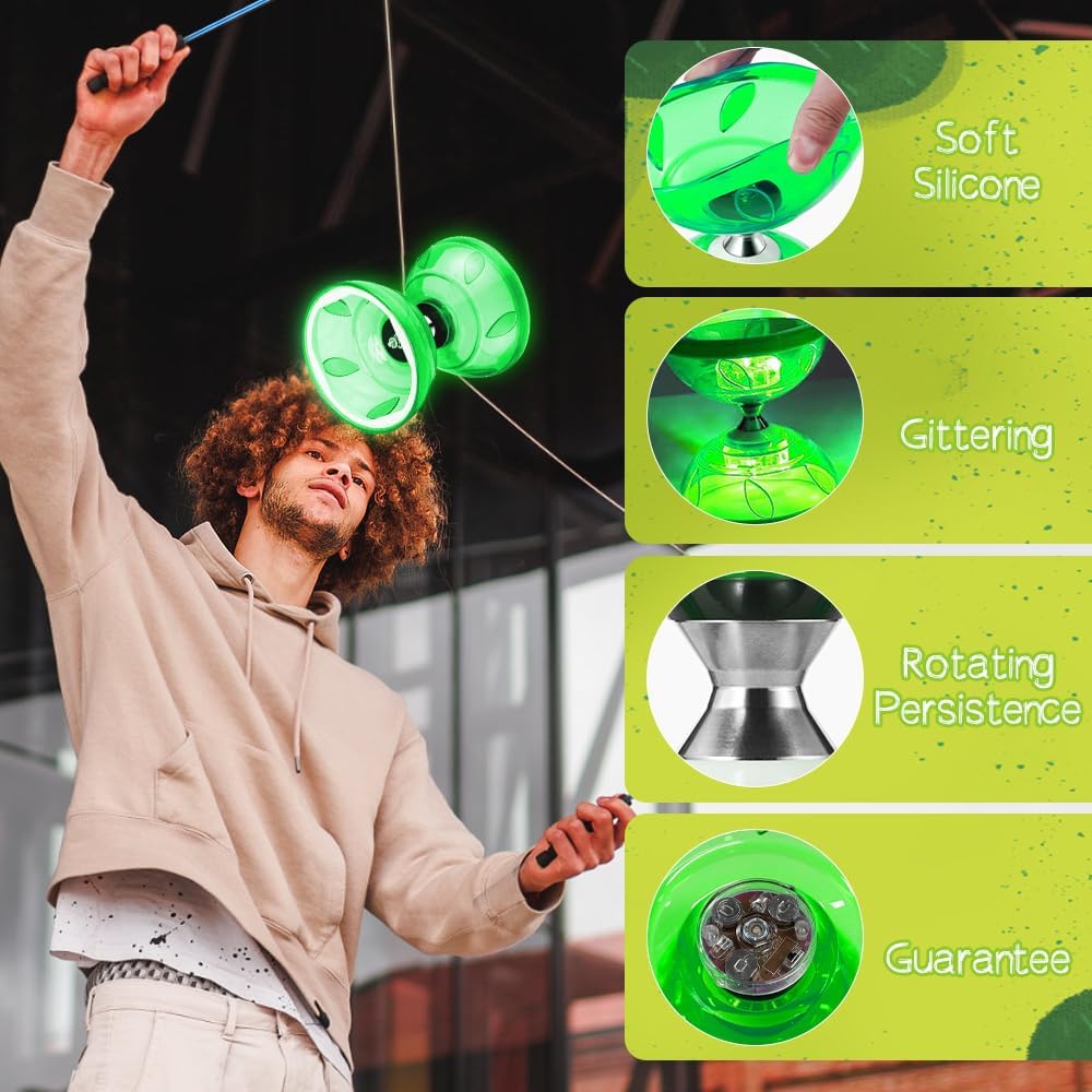Questo diabolo è realizzato in gomma resistente e si distingue per la sua eccellente durata e resistenza. Il materiale in gomma assorbe gli urti, resiste agli urti e previene le rotture. Il cuscinetto triplo monouso non solo prolunga i tempi di ripresa, ma è anche rivolto a giocatori avanzati che cercano un gameplay di livello professionale. Il diabolo traslucido brilla su entrambi i lati con attraenti luci a LED che esaltano il suo fascino visivo. Prova l'emozione di giocare con un diabolo luminoso che si illumina al buio, aggiunge una dimensione emozionante alle tue ore di giocoleria e ti regala un'esperienza fresca. Questo set è progettato per i bambini nel destreggiarsi da Diabolo ed è perfetto per i principianti per imparare ed esplorare il mondo della giocoleria. Il set Diabolo combina intrattenimento e apprendimento e offre un'esperienza divertente ed educativa che innesca l'immaginazione. Diabolo con bastoncini: il design portatile e leggero consente un facile trasporto e consente una comoda attività di fitness sempre e ovunque. Diabolo con corde regolabili.