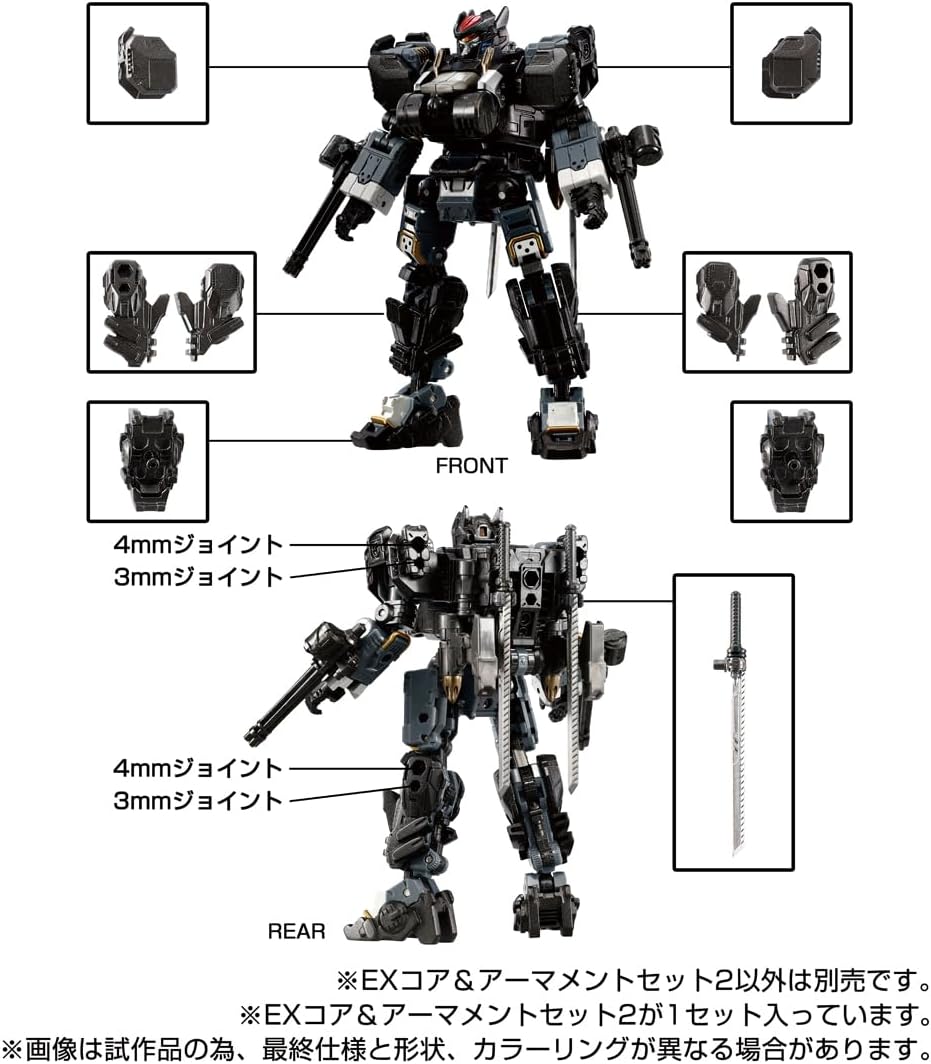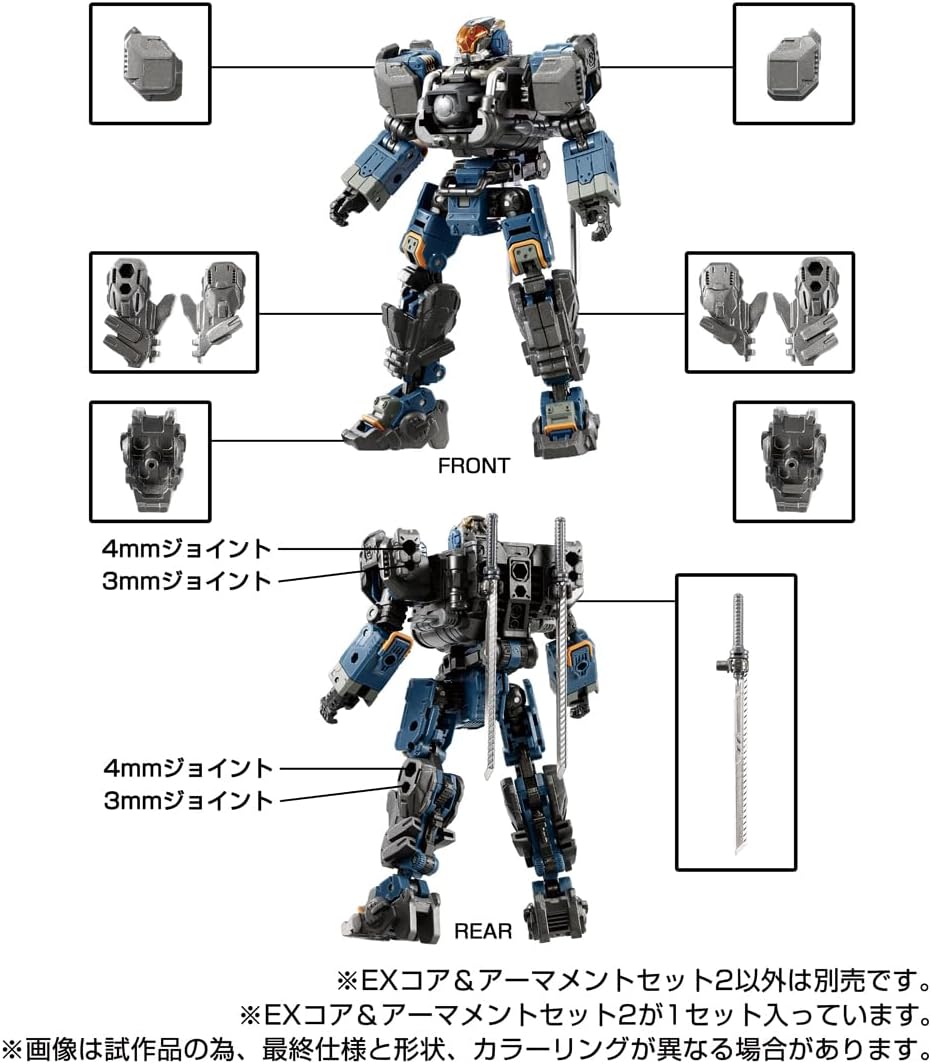 Presentazione della seconda edizione del set EX Core & Armament. Presentazione del nuovo modulo proiettile colorante di Algova Salter e Garda Varsutter, nuove parti di fissaggio per le spalle e parti di montaggio delle gambe. La testa del modulo proiettile è di nuova forma. Include 2 Truppe Diaclone Ver. 2.0 Contenuto del set: modulo Algo Bullet (1), modulo Gardabollet (1), parti di fissaggio spalla (4), parti di montaggio gambe A (4), parti di montaggio gambe B (4), parti di montaggio gambe C (4), armi (4), parti di giunzione (4), Diacron Team Ver. 2.0 (2), parti del corridore (2), guarnizione (1), brochure (1), manuale di istruzioni (1), manuale di istruzioni (1),