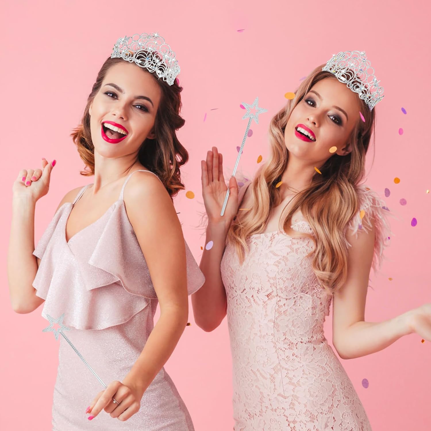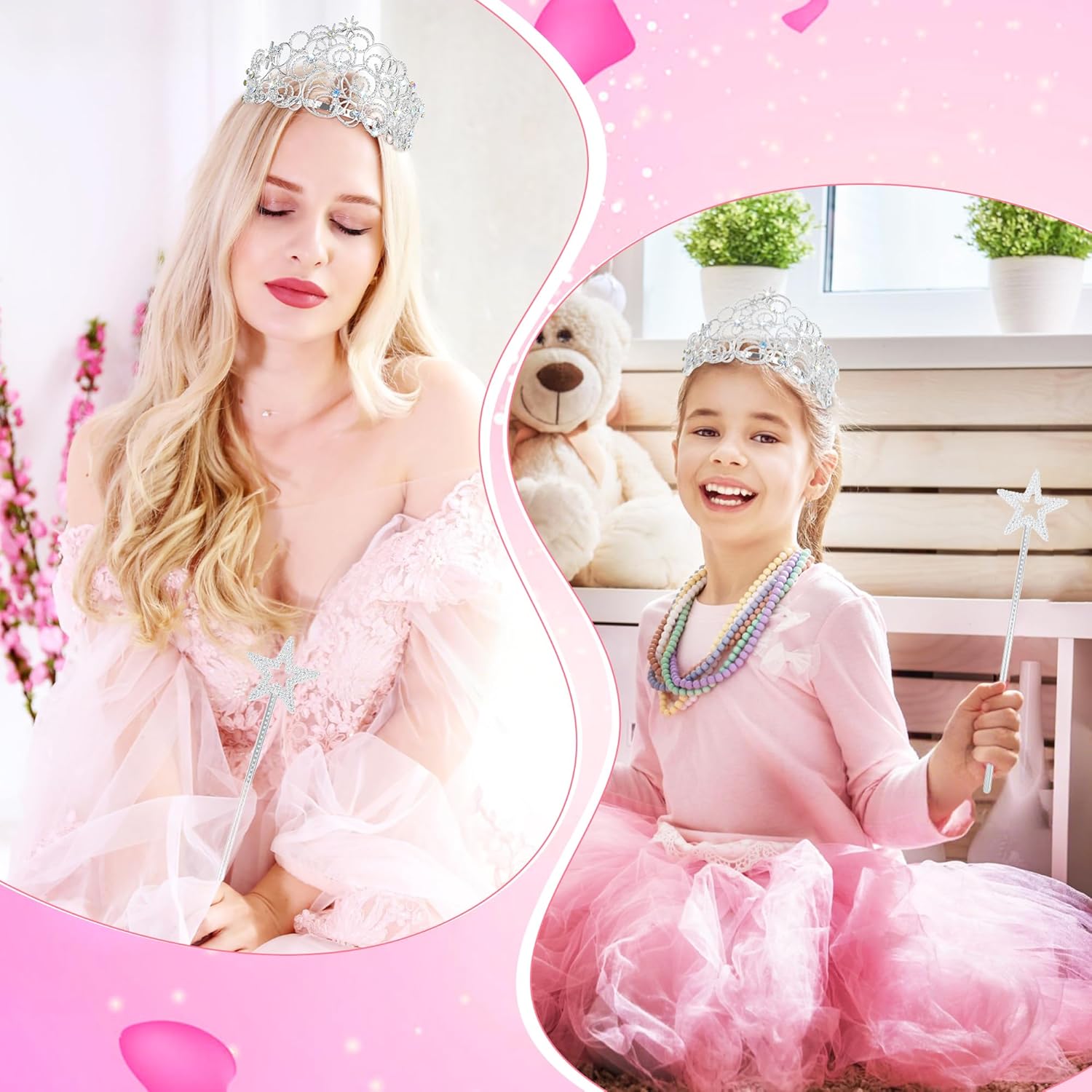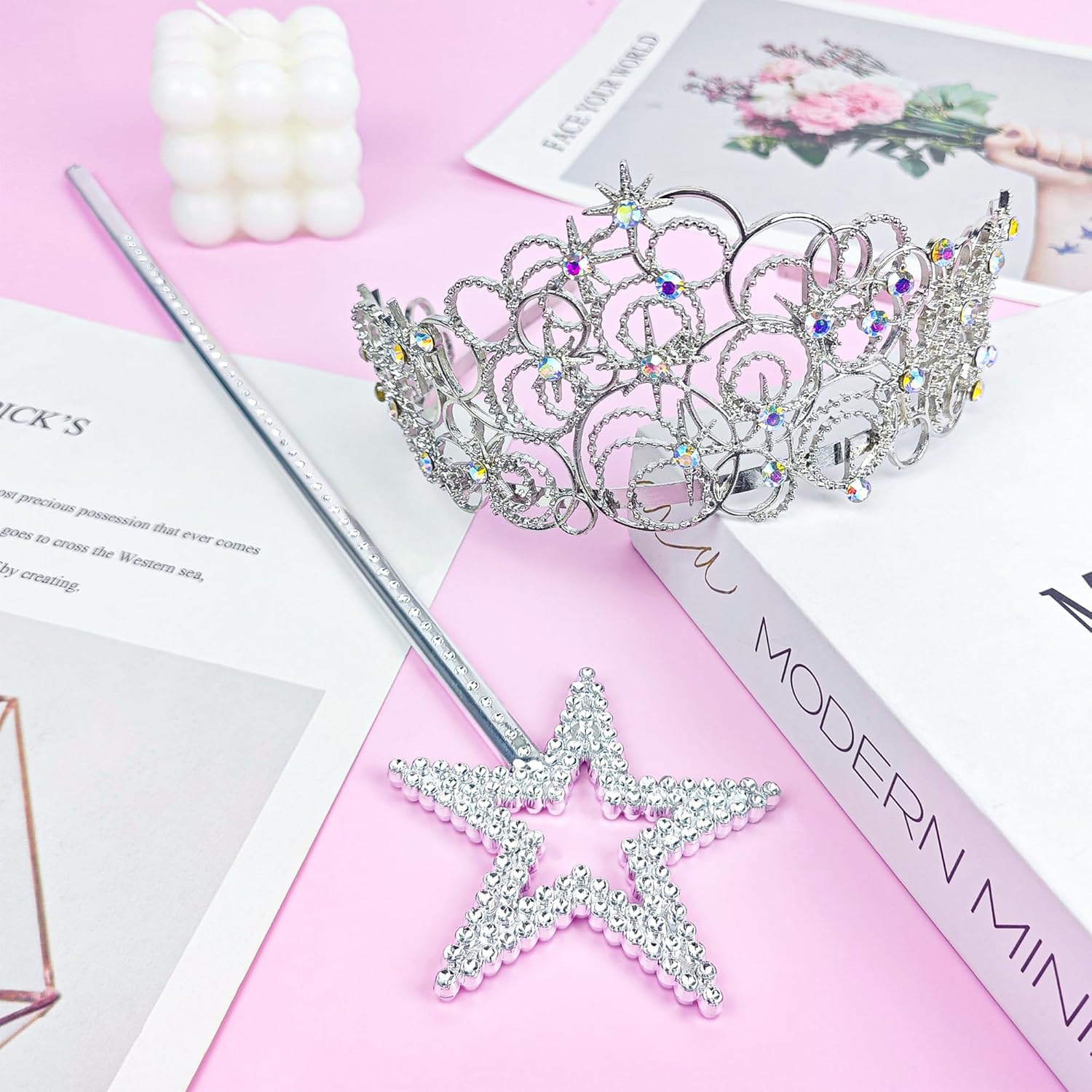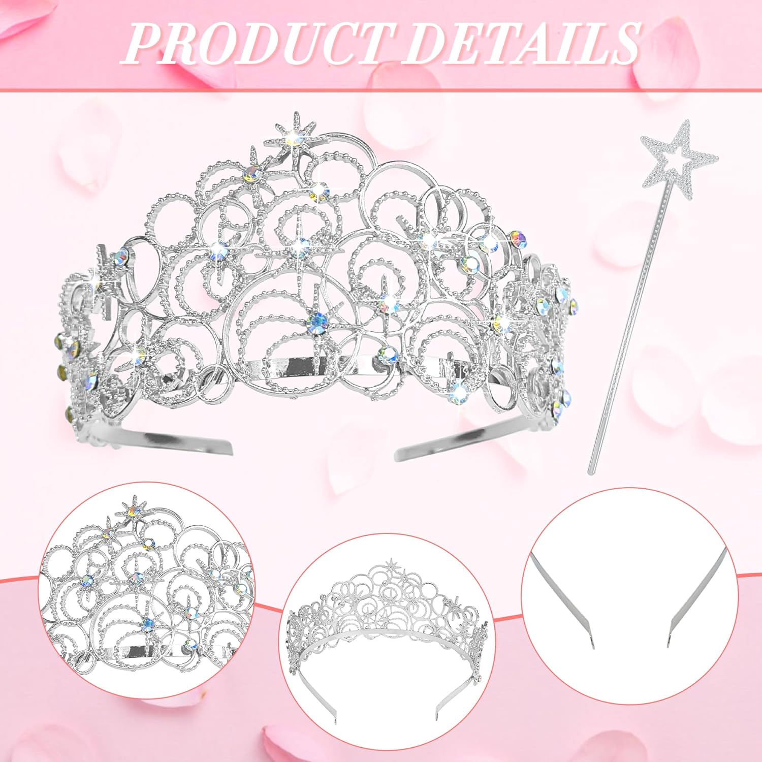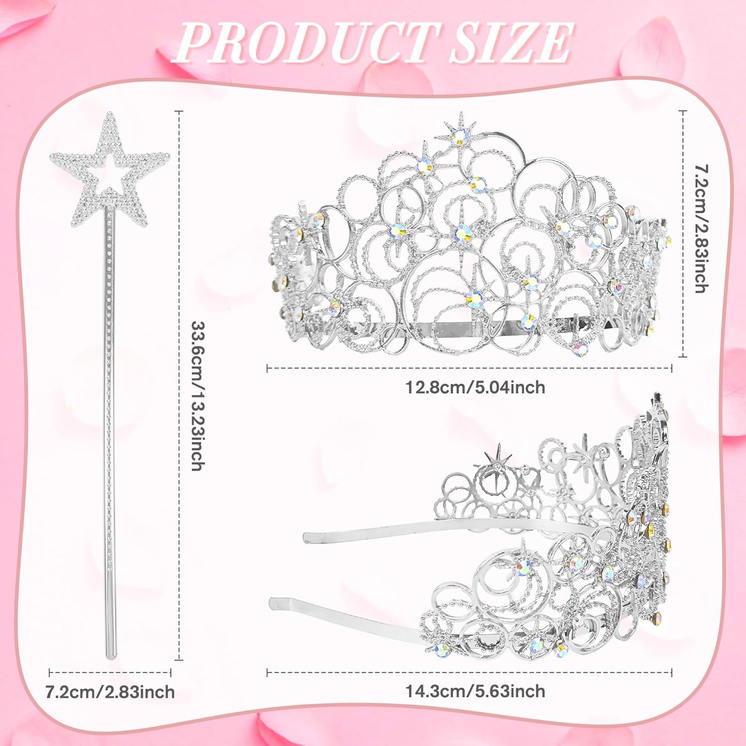 Questo set di corona da principessa viene fornito con una tiara in argento con strass e una bacchetta magica a forma di stella abbinata, ideale per feste di compleanno (indossando la tiara come corona di compleanno), riunioni a tema principessa, eventi cosplay, costumi di Halloween, feste e spettacoli teatrali, aggiungendo magia a ogni momento felice.