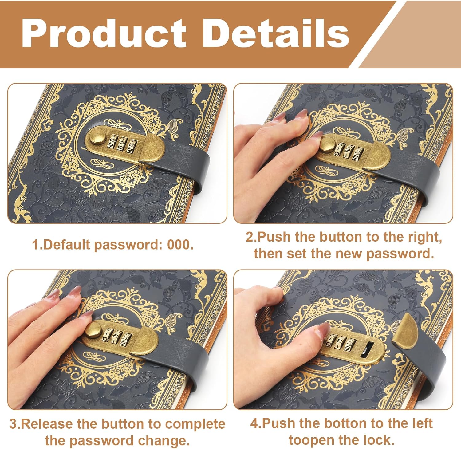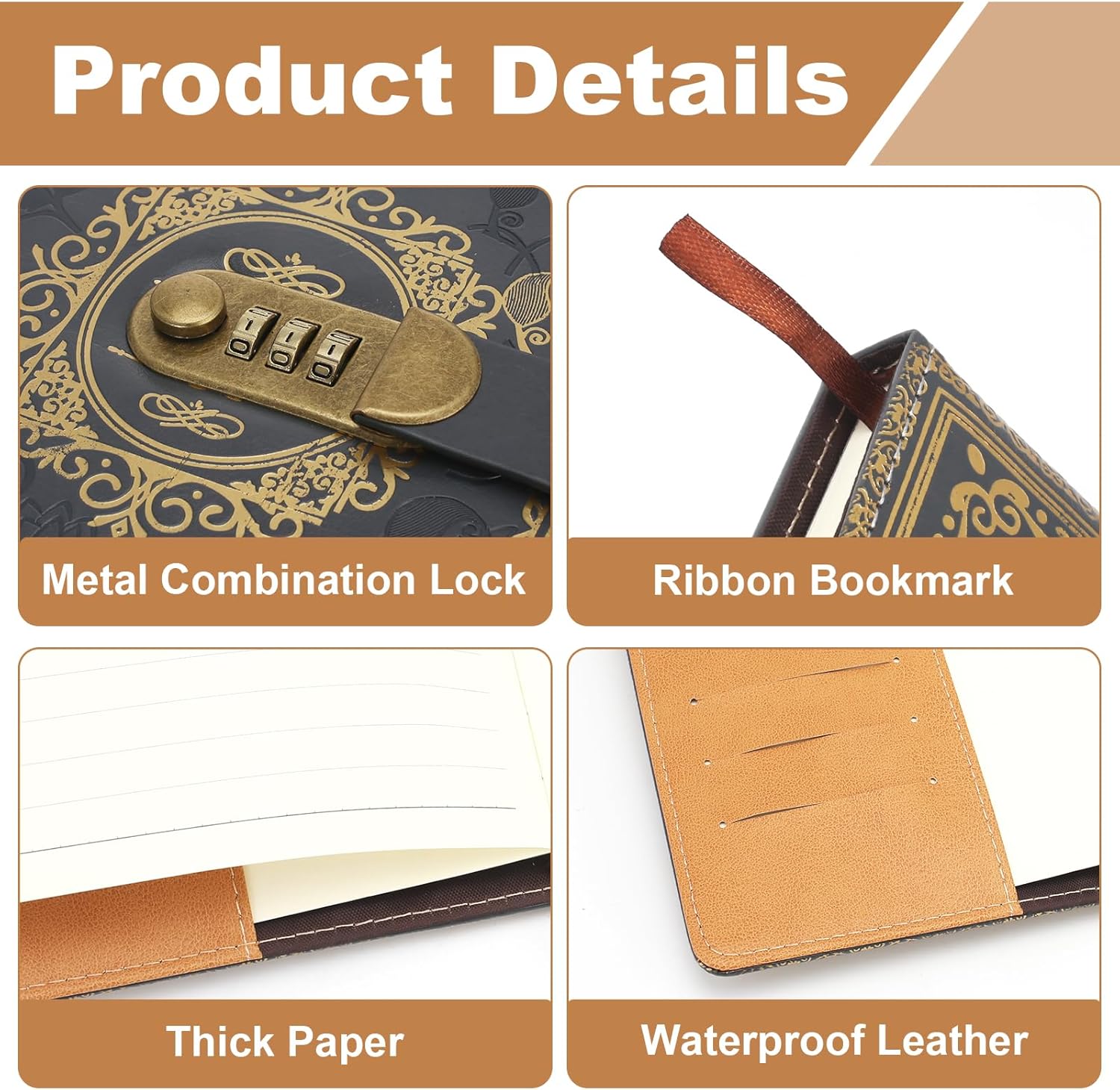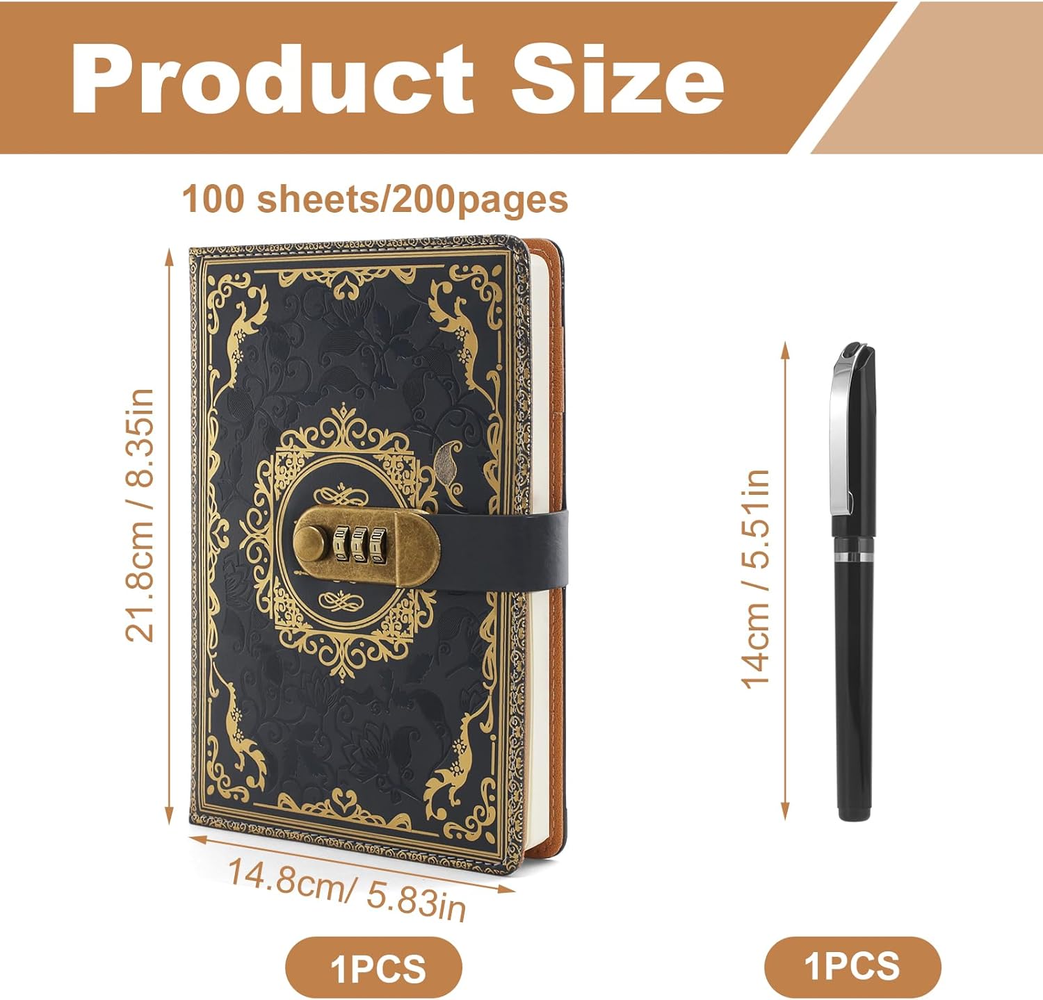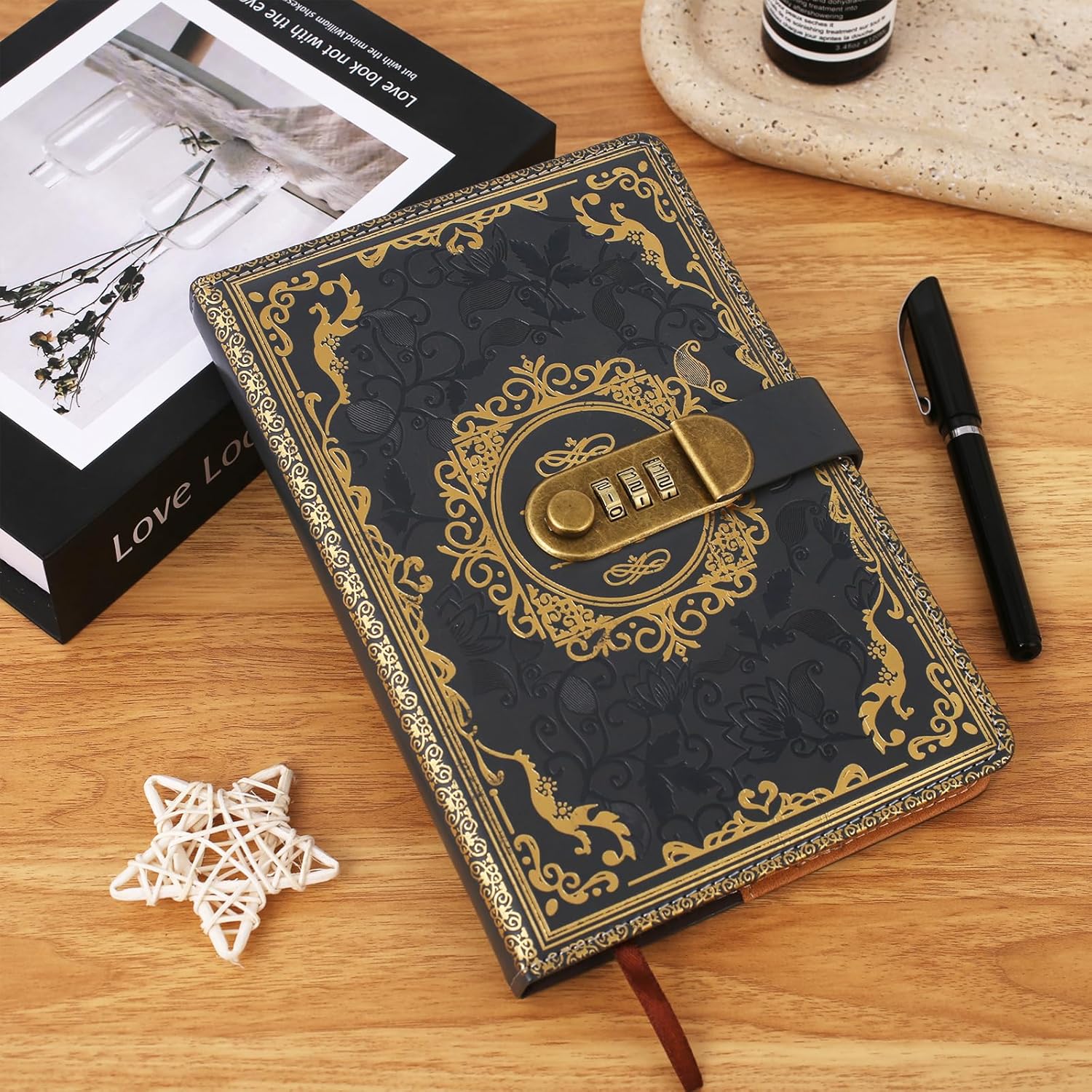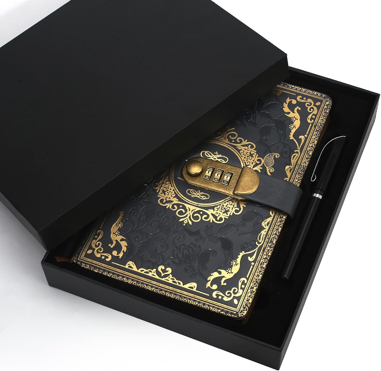 Qualità premium: l'agenda GTNCE convince con la sua copertina in ecopelle di alta qualità, che non è solo elegante, ma anche resistente e piacevole al tatto. Il look vintage con motivo in rilievo lo rende un compagno elegante per la vita di tutti i giorni, a scuola, in ufficio o in viaggio. Viene fornito in un'elegante confezione regalo nera che protegge in modo ottimale il diario e gli conferisce un aspetto ancora più esclusivo. Lucchetto a combinazione sicura: il diario è dotato di un lucchetto a combinazione a tre cifre che impedisce l'accesso non autorizzato e protegge le tue voci personali. Con migliaia di combinazioni possibili, offre la massima sicurezza. Le istruzioni per una facile regolazione della serratura sono incluse nella consegna. Carta premium: il diario contiene 200 pagine (100 fogli) di carta spessa da 100 g/m² che impedisce la circolazione sanguigna dell'inchiostro ed è perfetta per scrivere, disegnare o fare schizzi. La carta liscia color crema offre una piacevole esperienza di scrittura ed è ideale per l'uso quotidiano. Grazie alla sua elegante confezione, è anche un meraviglioso regalo per menti creative. Funzioni pratiche: oltre al diario, il kit contiene una penna in metallo, un segnalibro a nastro e una tasca interna per appunti sciolti. Che si tratti di diario, agenda, quaderno o album da disegno, il design multifunzionale soddisfa le esigenze di studenti, professionisti e menti creative. Regalo perfetto: questo diario è ideale come regalo di compleanno, Natale, festa della mamma o laurea. Viene fornito in una lussuosa confezione regalo nera che presenta il diario con stile e dà un'impressione di qualità. Un regalo perfetto per uomini, donne, adolescenti e bambini che creano ricordi indimenticabili