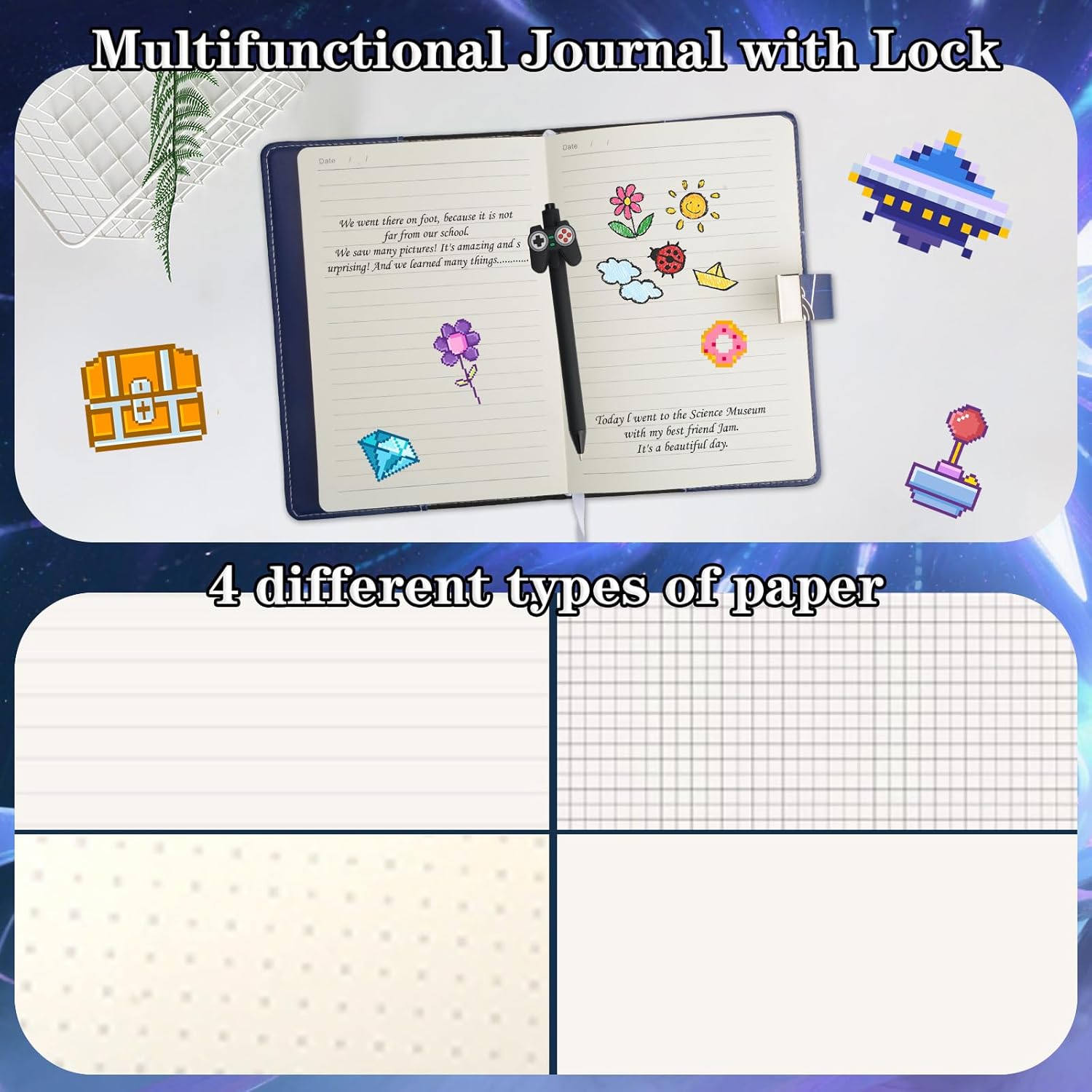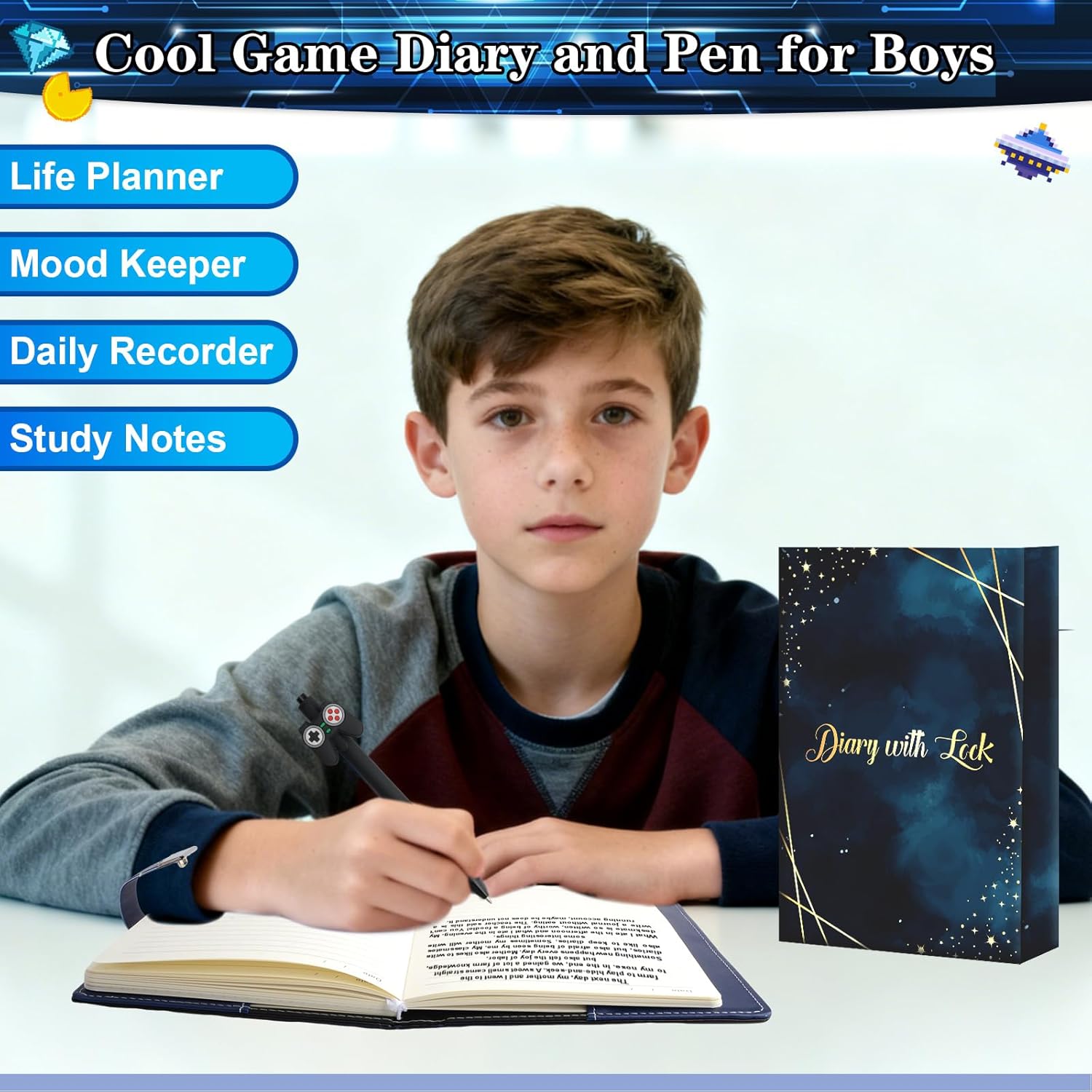 Set diario per bambini. Contenuto della confezione: in questa confezione regalo unica, riceverai 1 diario di gioco con serratura, 1 penna a sfera. Questo diario con serratura è perfetto per ragazzi di 6, 7, 8, 9, 10, 11 e 12 anni. Mantiene i segreti al sicuro, assicura che solo tu abbia accesso alla tua cerchia ristretta e dà ai ragazzi un senso di proprietà e sicurezza sui loro pensieri e sogni personali. Agenda con lucchetto per ragazzi dagli 8 ai 12 anni: l'agenda da 176 pagine ha il formato A5 (21,4 x 14,5 cm). Abbiamo selezionato carta di alta qualità in modo che l'inchiostro non fuoriesca e la penna possa scorrere facilmente sulle pagine. Il motivo alla moda e la copertina morbida e impermeabile in PU proteggono il diario e assicurano che possa essere utilizzato e conservato a lungo. Regalo ideale per ragazzi dai 6 ai 14 anni: stai pensando a cosa potresti regalare ai tuoi ragazzi? Questo set regalo di quaderni e penne è pronto per essere regalato. È ideale come regalo di compleanno, San Valentino, Pasqua, Ringraziamento, Natale, Capodanno, festa dei bambini, rientro a scuola, laurea, premio quotidiano e come altro regalo per i tuoi ragazzi. Tieni il tuo diario con lucchetto per ragazzi e segreti in modo sicuro: il diario con serratura sarà il tuo migliore amico e giardino segreto. E solo tu che conosci la password puoi leggerla. Il regalo perfetto per ragazzi di 8, 9, 10, 11, 12, 13, 14, 15 e 16 anni. Agenda ideale per ragazzi da 8 a 10 anni da 9 a 12 anni, da 10 a 12 anni, da 12 a 14 anni con serratura. Come impostare il blocco codice: riceverai istruzioni chiare che ti aiuteranno a configurare combinazioni di password per proteggere la tua privacy. Impostare la password è molto semplice. Se avete domande circa la serratura, non esitate a contattarci.