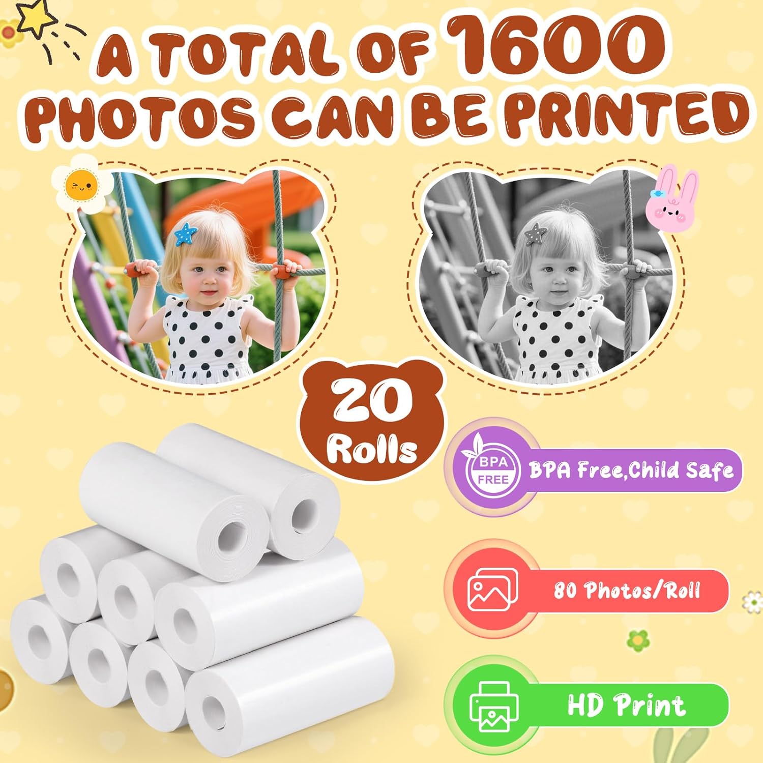 Ricarica di Carta Termica per Macchina Fotografica Istantanea: Questa carta termica per fotocamere è appositamente progettata per le macchina fotografica bambini istantanea. La confezione contiene 20 rotoli di carta termica bianca, facilmente ricaricabili quando la carta termica esistente si esaurisce. Ogni rotolo misura 5,7 x 2,5 cm, la dimensione ideale per una macchina fotografica istantanea. Scatta Foto Vivide e Nitide Ogni Volta! Questa carta termica per fotocamere è moderatamente spessa, non si danneggia facilmente ed è molto resistente. La carta liscia e bianca brillante consente di stampare le carta fotografica in modo più nitido e di conservare le immagini per ricordi indelebili. Può Stampare Circa 1600 Foto: La confezione contiene 20 rotoli di carta termica per macchina fotografica bambini, ogni rotolo può stampare circa 80 foto (circa 1600 foto in totale), sufficienti per l'uso quotidiano e ideali per feste, viaggi e creatività quotidiana. Sicura e Inodore: La nostra carta termica per macchina fotografica bambini è realizzata con materiali di alta qualità, sicura e inodore, ideale per bambini e adulti, ideale per le riunioni di famiglia e per i bambini creativi. Facile da Sostituire: È semplice da installare, basta fare attenzione al verso della carta termica della fotocamera. (Nota: una direzione di installazione errata causerà errori di stampa)