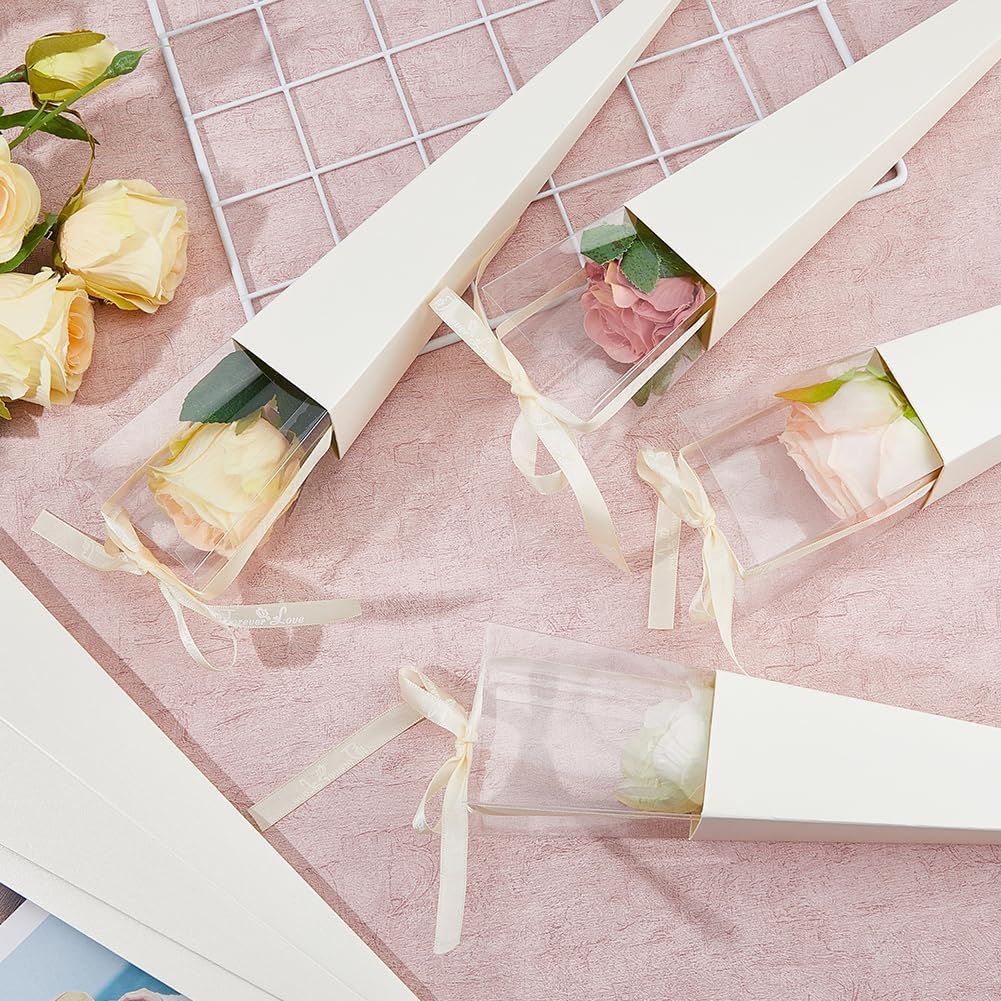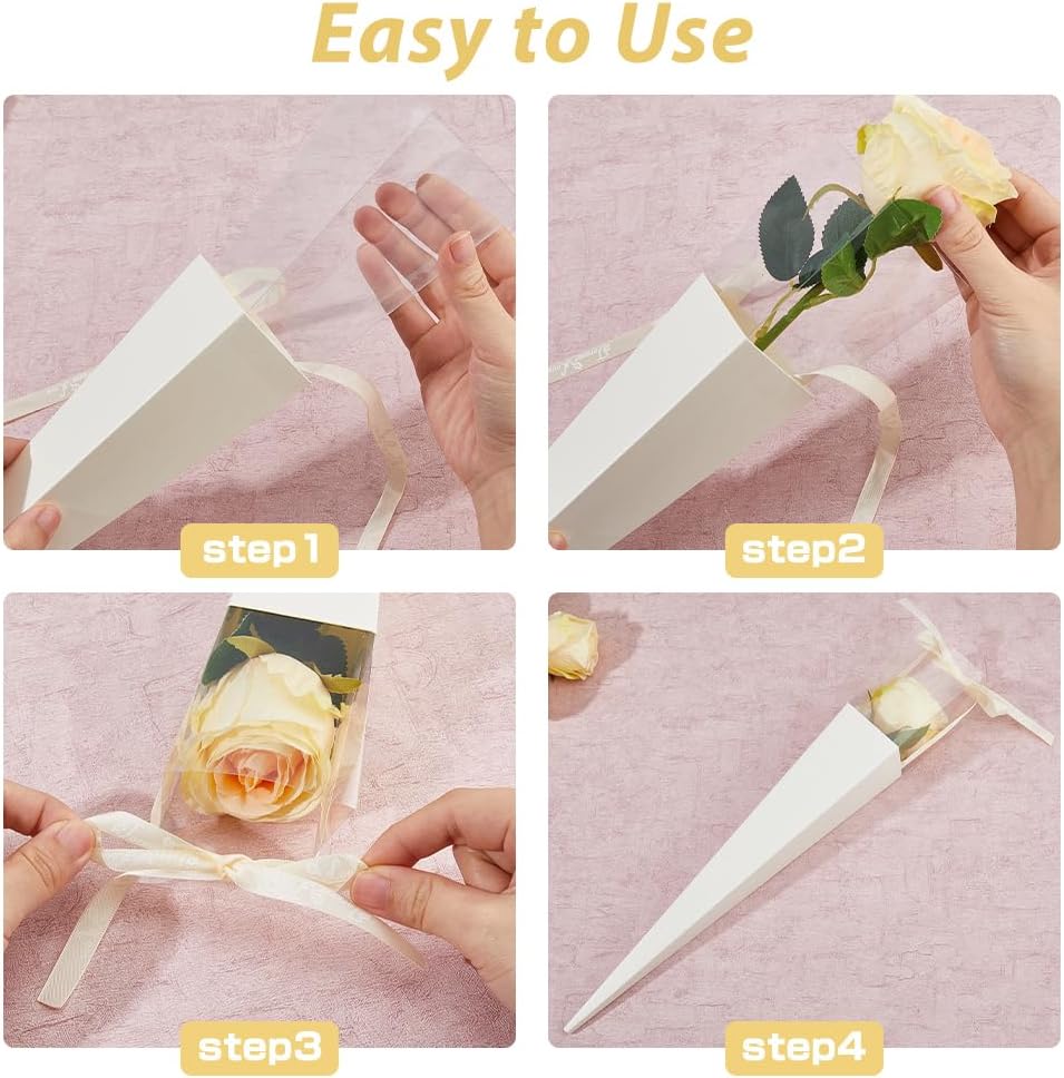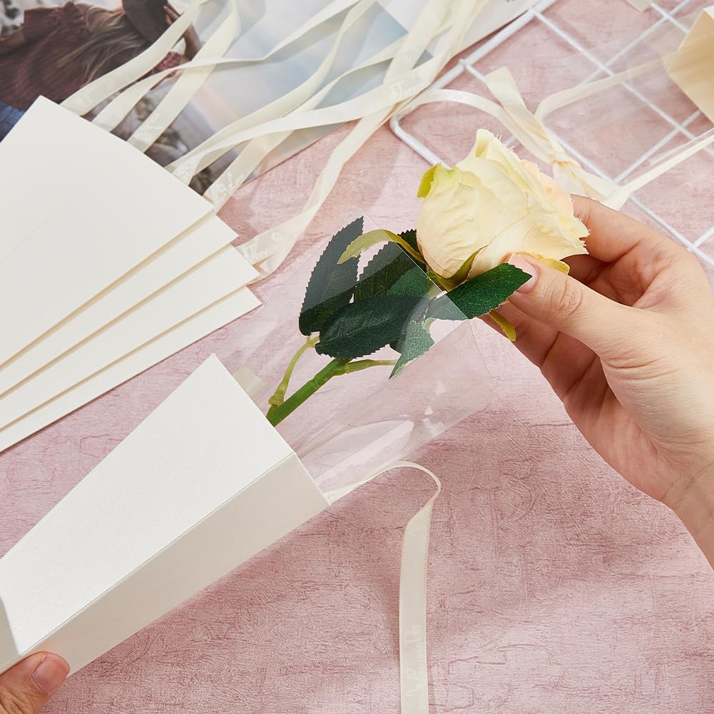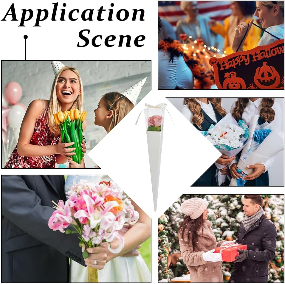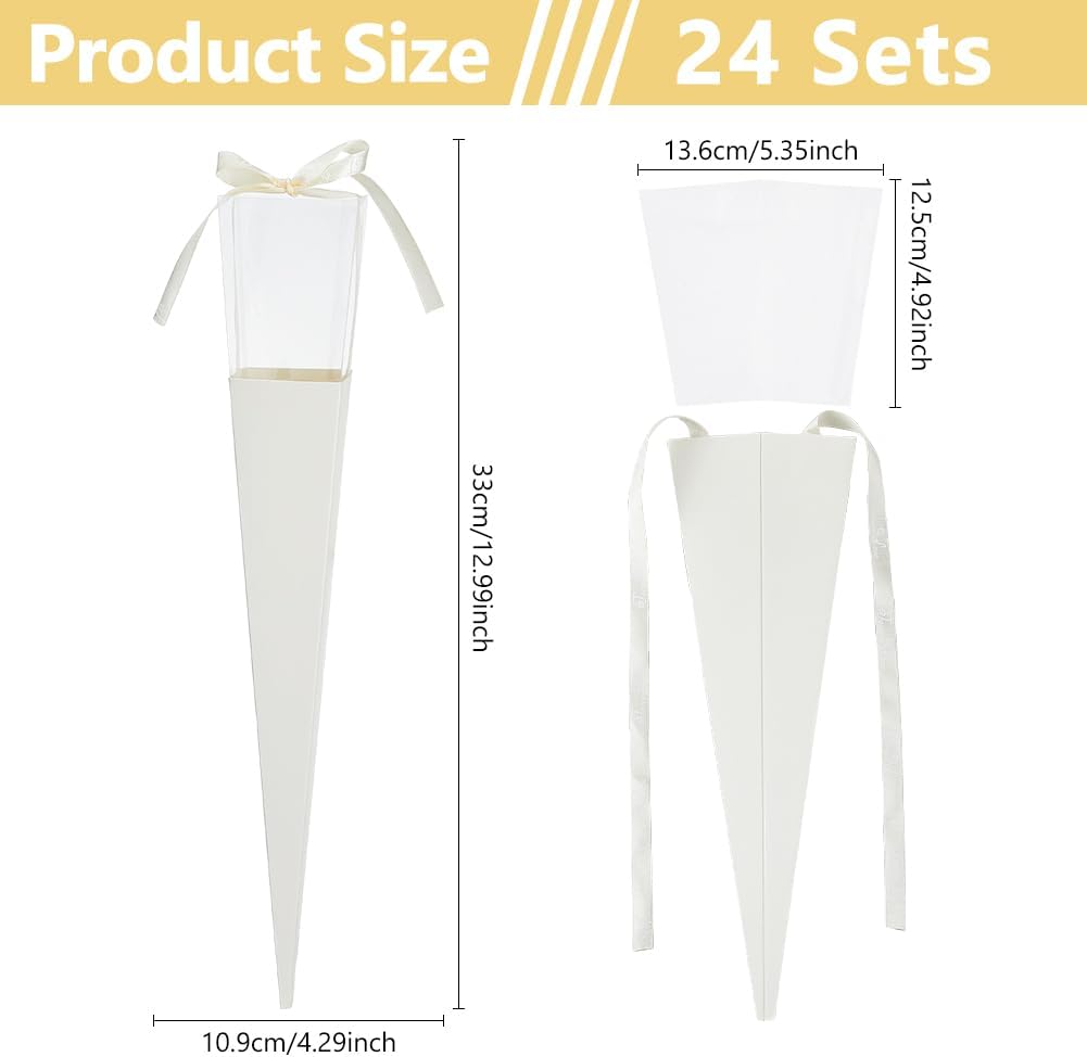 Set conveniente: include sacchetti di carta triangolari da 24 pezzi (con fiocco sulla scatola) e buste di plastica da 24 pezzi, quantità sufficiente per soddisfare le diverse esigenze di produzione. Dimensioni adatte: la dimensione della borsa è di circa 4,29 pollici (10,9 cm) di larghezza, 12,99 cm di lunghezza, 0,08 pollici (0,2 cm) di spessore e la dimensione della pellicola di plastica è 4,92x5,35x0,02 pollici (12,5x13,6x0,05 cm). I fiori possono essere confezionati singolarmente. Materiale robusto: i sacchetti per rose sono realizzati in carta e materiale plastico, che può proteggere i fiori dai danni e allo stesso tempo mostrare bene i bellissimi fiori. Facile da usare: design vintage della borsa per fiori triangolare, adatta ai principianti in floristica, basta aprire la pellicola di plastica nella borsa del bouquet, quindi mettere il bouquet nella borsa e allacciare il nastro., La confezione del fiore è pronta.! Consente di movimentare rapidamente grandi quantità di mazzi di fiori per il confezionamento. Sacchetti regalo multiuso: i sacchetti di carta sono perfetti per confezionare mazzi di fiori, regali e decorazioni. Ideale per negozi di fiori, fioristi per allestimenti floreali, Utilizzabile per ogni occasione come compleanni, matrimoni, lauree e feste varie