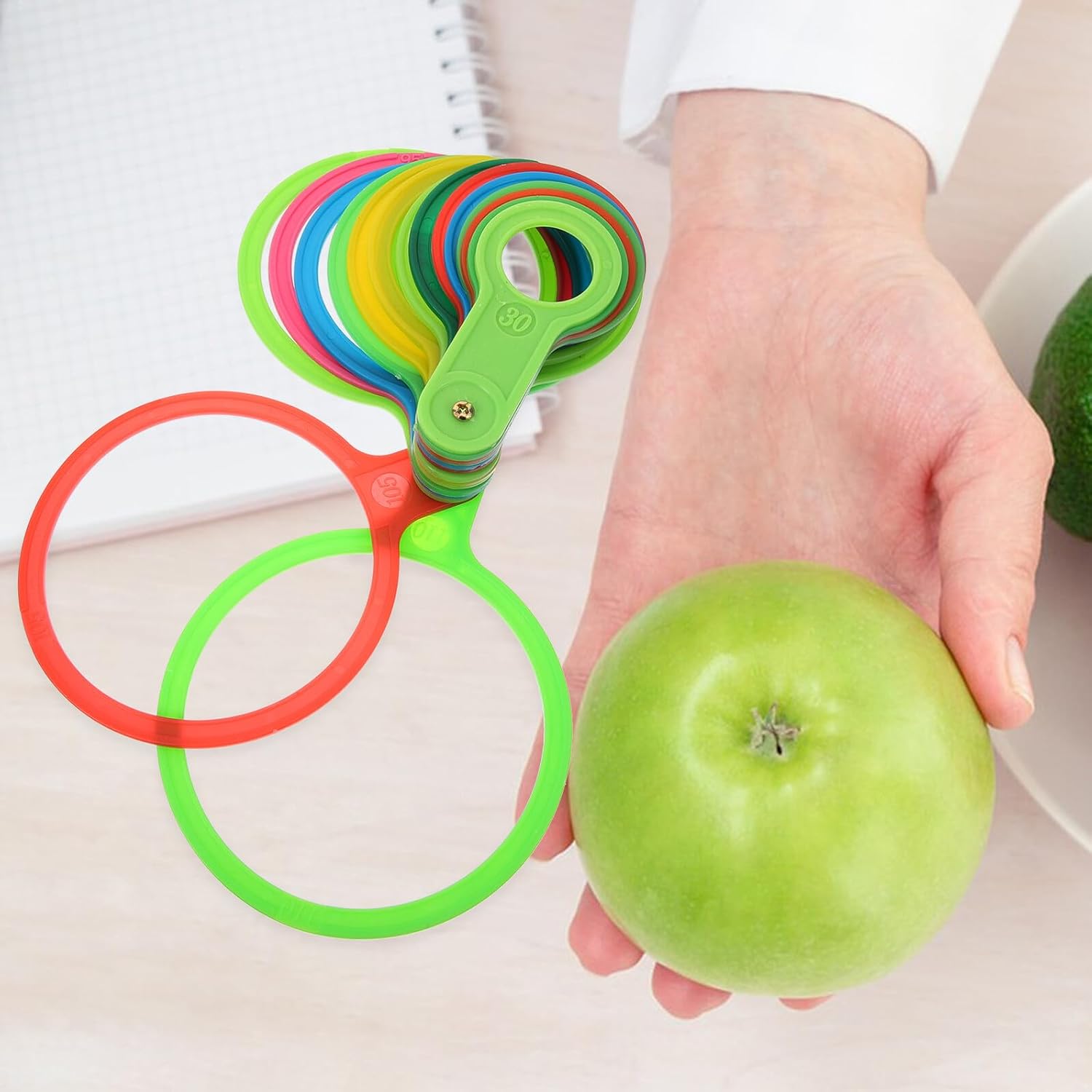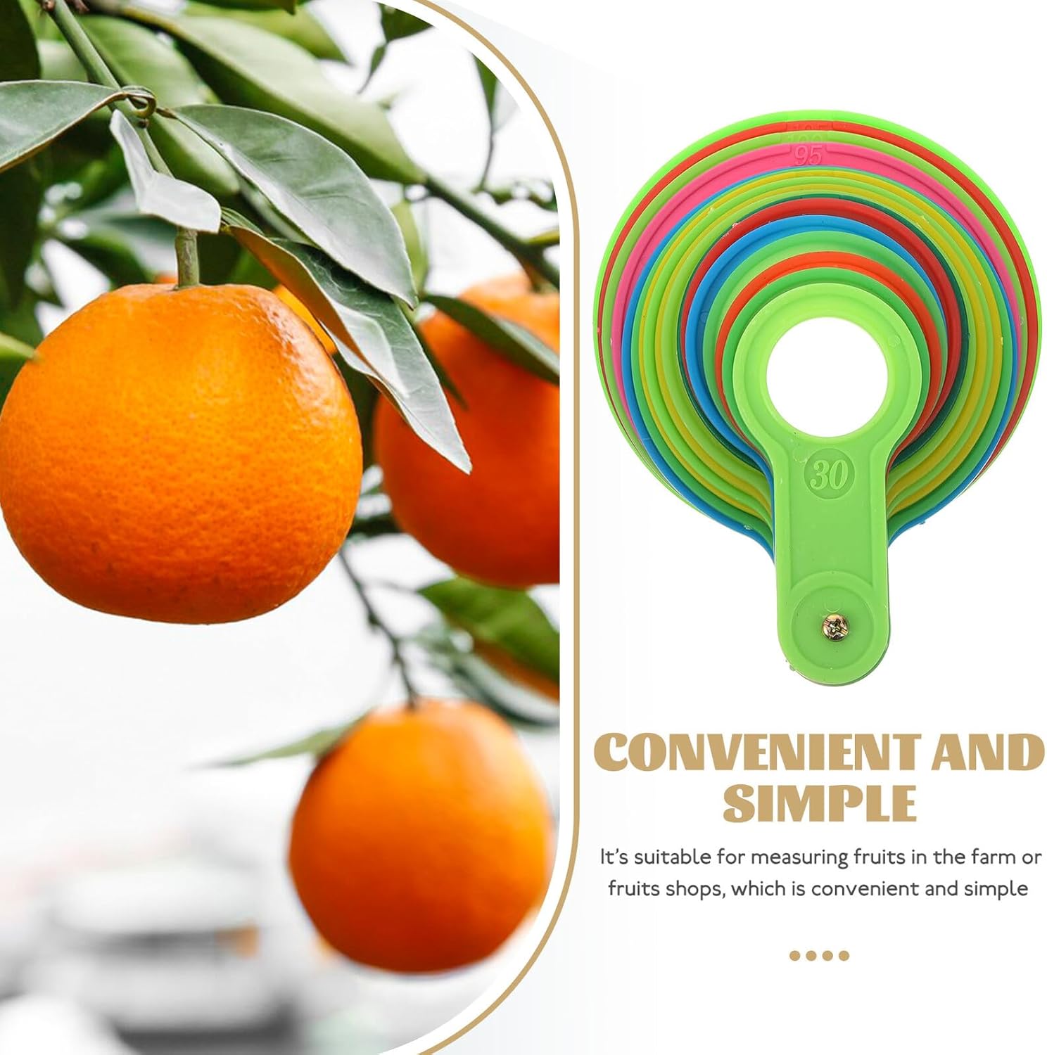 Strumenti per la decorazione della frutta: realizzati in materiale , il di misurazione del diametro è molto resistente, non facile da rompere o deformare, giri di misurazione del diametro della frutta Cerchio di misurazione del diametro della frutta: è adatto per misurare la frutta in fattoria o nei negozi di frutta, il che è comodo e semplice, strumento di misurazione del per la frutta Giri di misurazione del diametro della frutta in plastica: per i coltivatori di frutta, un pratico set di giri di misurazione del diametro può aiutarli a classificare facilmente la frutta in base al suo diametro, strumento per la frutta Strumento di misurazione del diametro: con il di misurazione del diametro, sarà molto più facile e più comodo per te classificare i tuoi frutti, strumento ad anello di misurazione della frutta Misuratore di frutta in plastica: può essere utilizzato per misurare la dimensione del diametro della frutta, per classificare la frutta in diversi gradi, strumenti per la frutta