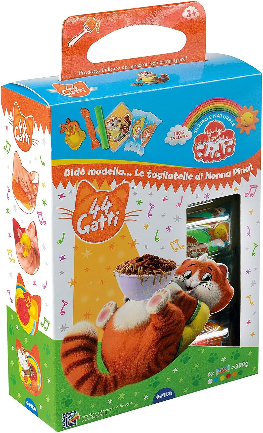 Il tormento del panetto d'oro: le tagliatelle di Nonna Pina e il gatto gourmet dei 44 ravioli di gatti, insieme nel box Jouacrea le mie ricette Didò è la plastilina 100% italiana, a base di farina di frumento, amata da generazioni di mamme e bambini, è morbida, sicura e pulita, pensata per sviluppare le capacità psicomotorie e la fantasia dei più piccoli Confezione da 6 salsicce Didò, 1 set tagliatelle per bambini, 1 forma gatto - gnocco, 1 cartoncino con elementi pretagliati con piattino, ricettario e nonna Pina, 1 mattarello, 1 coltello, 1 busta protettiva Didò, 1 foglietto illustrativo Didò 44 gatti racconta le avventure quotidiane di Lampo, Milady, Pilou e Boulette, meglio conosciuti come i Buffycats, dal nome del loro gruppo; trasmesso quotidianamente su Rai YoYo