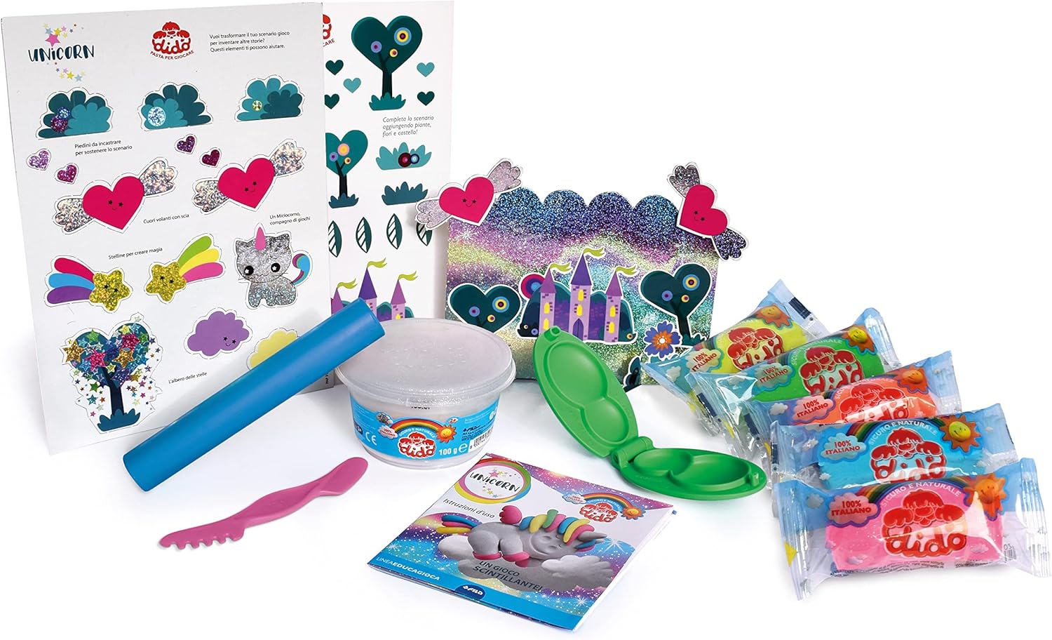 Salsicotti Didò glitter Fa parte del gioco la scatola olografica con lo scenario da personalizzare con adesivi ed elementi aggiuntivi da ritagliare Il codice QR sul fronte della confezione, mentre quella interna offre un tutorial esclusivo