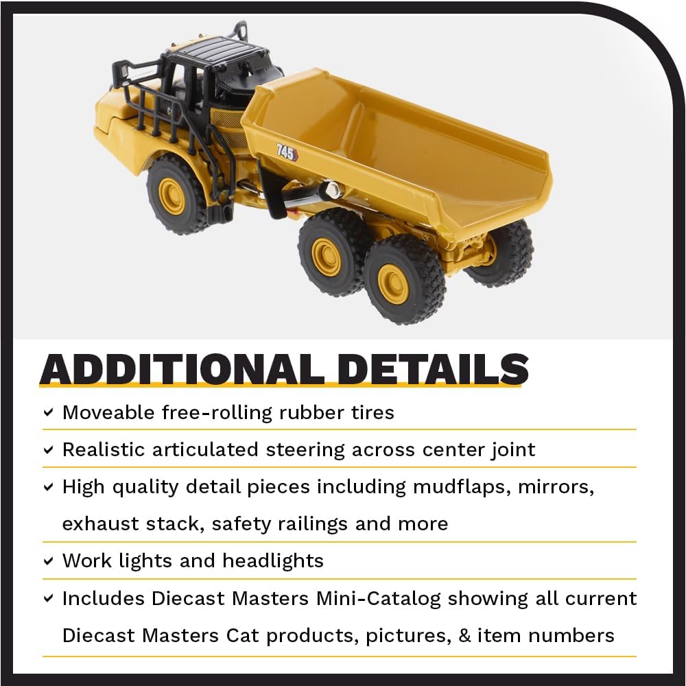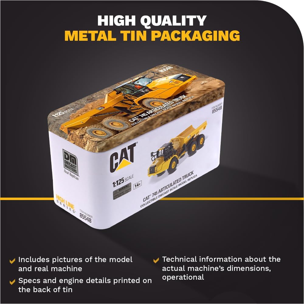Prodotto con licenza ufficiale: Autoarticolato CAT 745 dettagliato, scala 1:125 Replica in metallo originale e in scala reale in qualità da collezione, inclusa scatola in metallo di alta qualità Dimensioni: circa 18,7 x 8,5 x 11,1 cm Design giallo e molte parti aggiuntive per un aspetto realistico A partire da 14 anni e non adatto come giocattolo