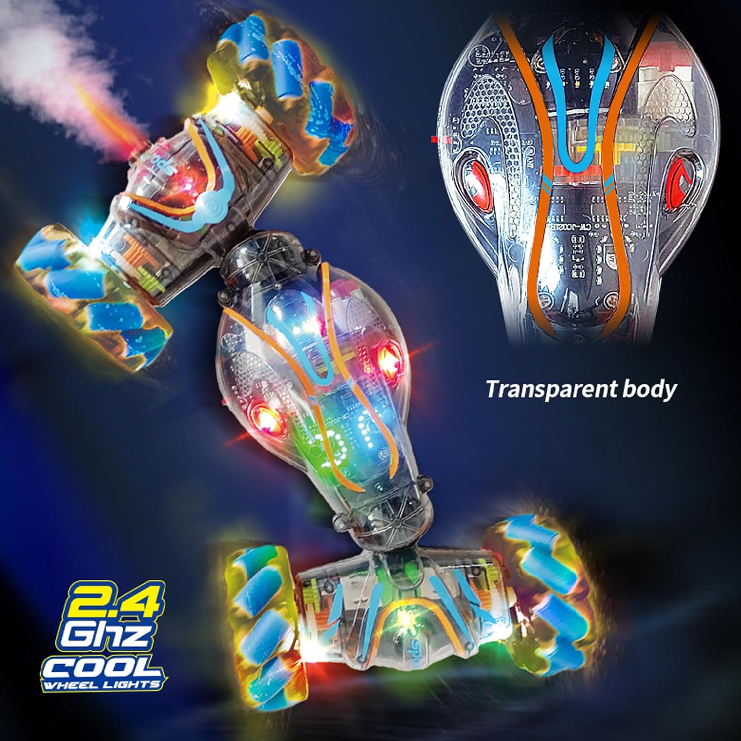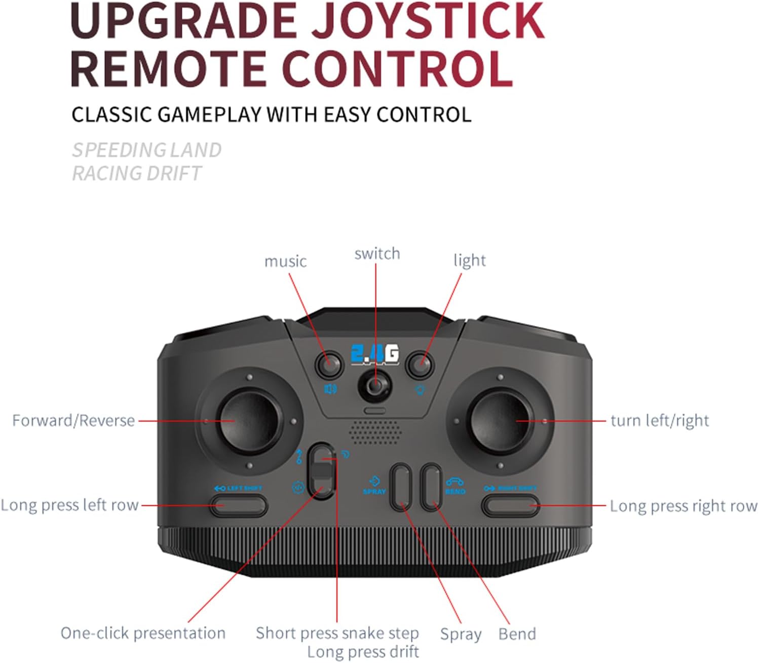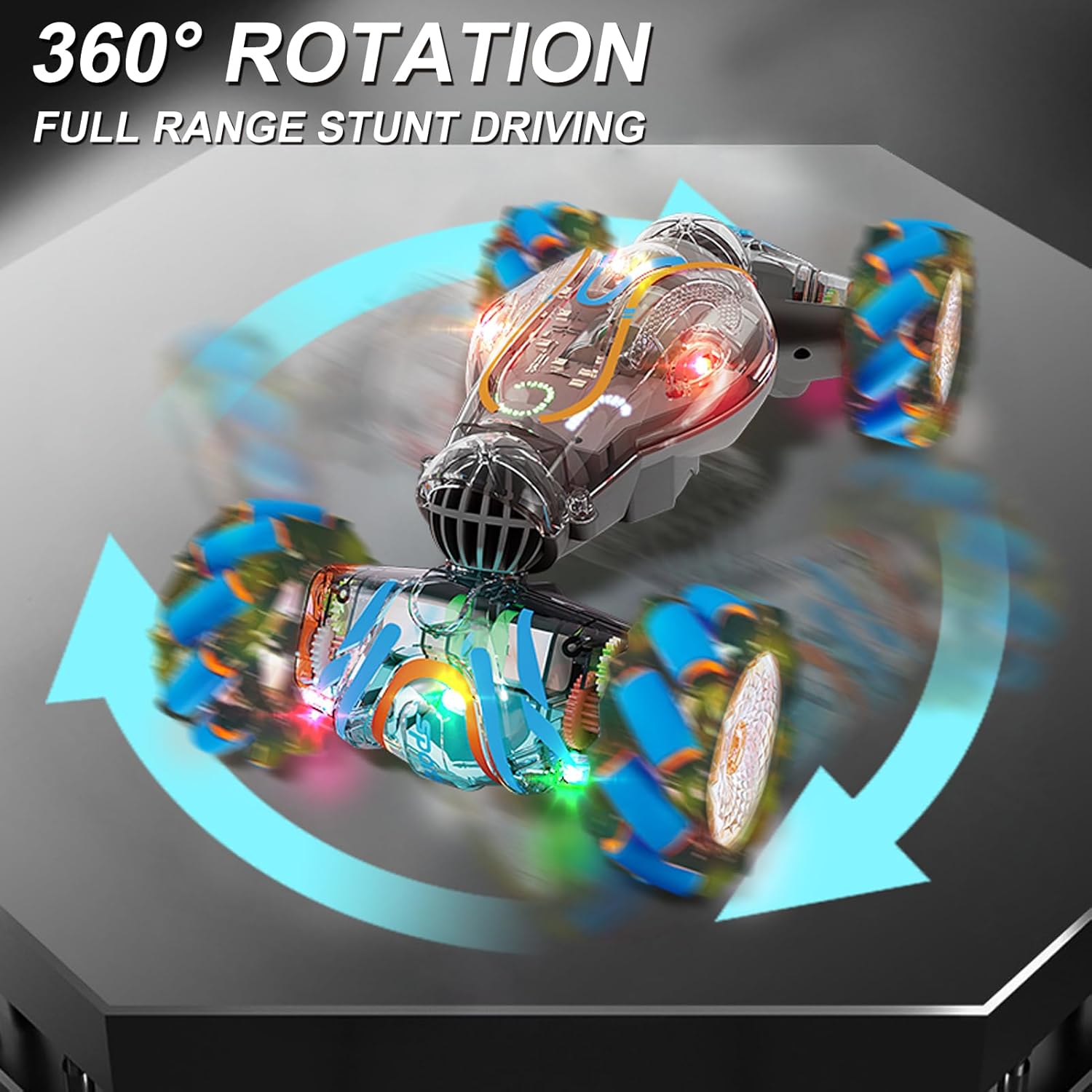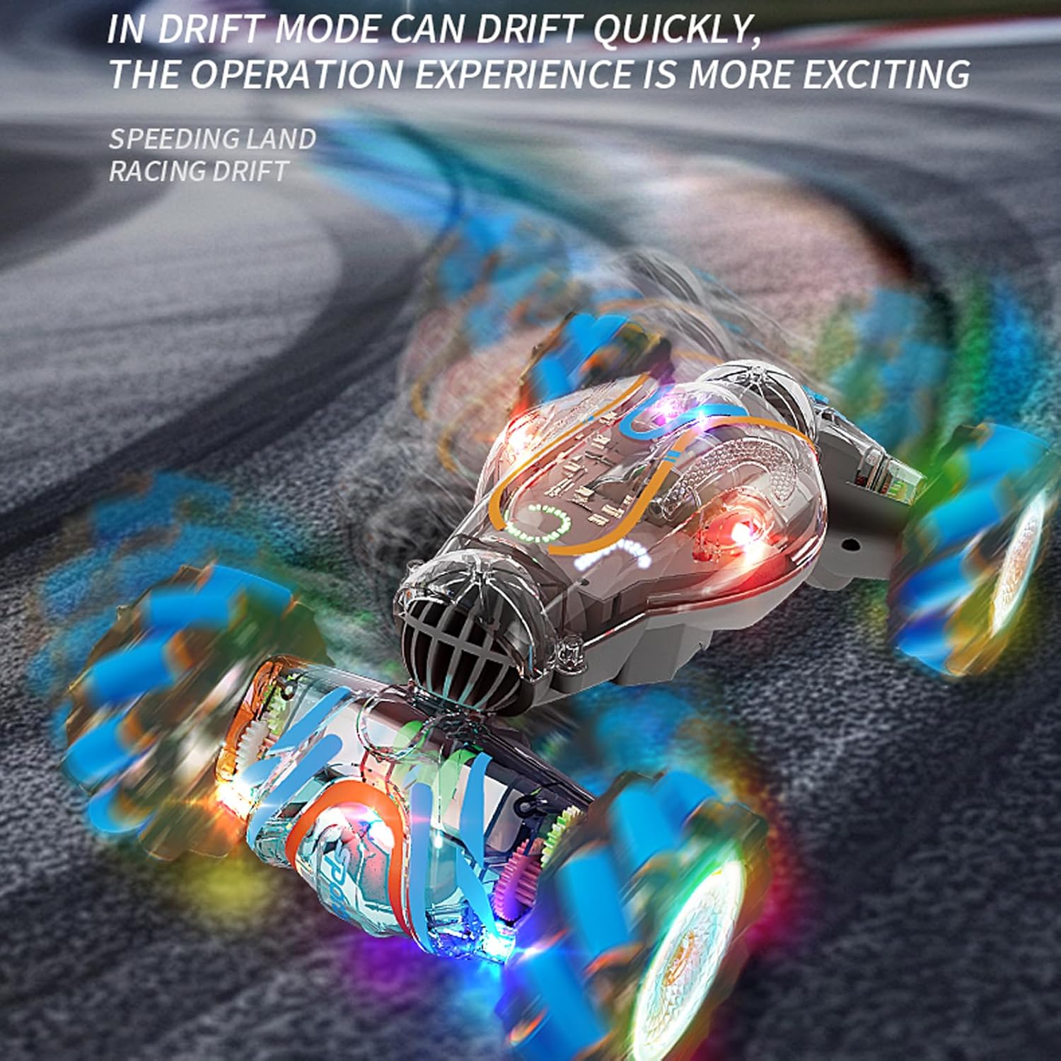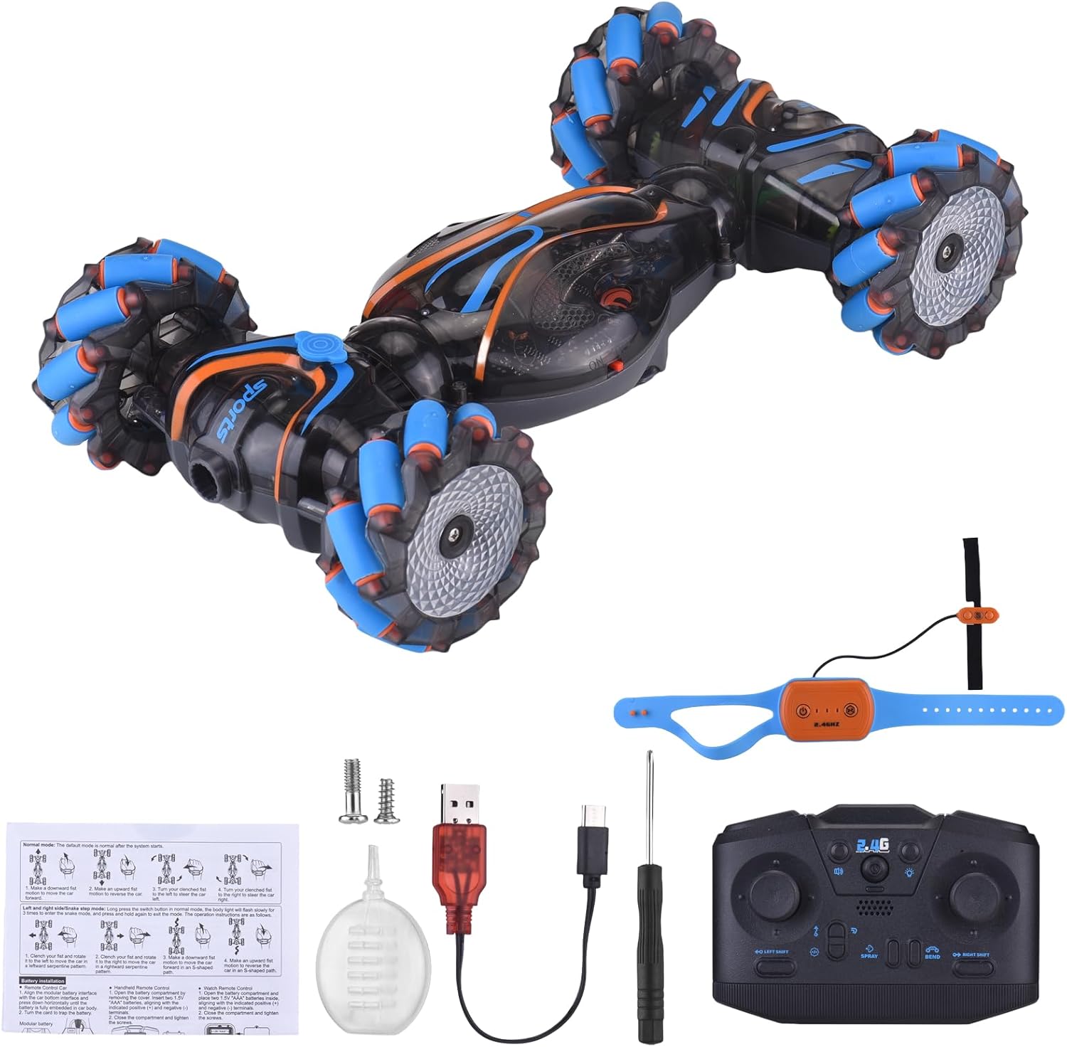 Doppi opzioni di controllo remoto: goditi il gioco versatile sia con un telecomando a manico che un telecomando innovativo in stile orologio. La maniglia ergonomica offre sterzo preciso mentre il telecomando orologio da polso consente il controllo dei gesti per il funzionamento intuitivo. Entrambi i controller forniscono una gamma reattiva di 50-60 m per divertimento ininterrotto di gioco. Funzione di spruzzo innovativa: aggiungi un ulteriore livello di divertimento a Playtime con la funzione di spruzzo unica attivata da un singolo pulsante Premere. L'elemento a sorpresa crea un intrattenimento infinito mentre la modalità di presentazione automatica dimostra le spettacolari capacità dell'auto con spettacoli abbaglianti. Potenti prestazioni 4WD: conquistare qualsiasi terreno con tecnologia avanzata a 4 ruote motrici che offre una trazione eccezionale e un movimento regolare. La costruzione durevole gestisce con facilità l'erba, la pavimentazione e le superfici interne mentre la batteria duratura garantisce sessioni di gioco estese di eccitazione piena di acrobazie. Luce e suono immersivo: affascinare tutti con vibranti luci a LED che illuminano ogni acrobazia e musica dinamica incorporata che migliora l'eccitazione. La luce sincronizzata e gli effetti sonori creano un'elettrificazione per elettrizzanti avventure da corsa e impressionanti esibizioni di acrobazie. Emozionanti acrobazie a 360 ° e alla deriva: sperimentare giri a 360 ° che hanno colpito il cuore e una deriva multidirezionale con questa acrobazia telecomandata ad alte prestazioni. Il suo potente 4WD e la maneggevolezza di precisione consentono trucchi strabilianti che stupiranno bambini e adulti. Ottimo per sessioni dinamiche di gioco che alimentano l'immaginazione ed eccitazione.