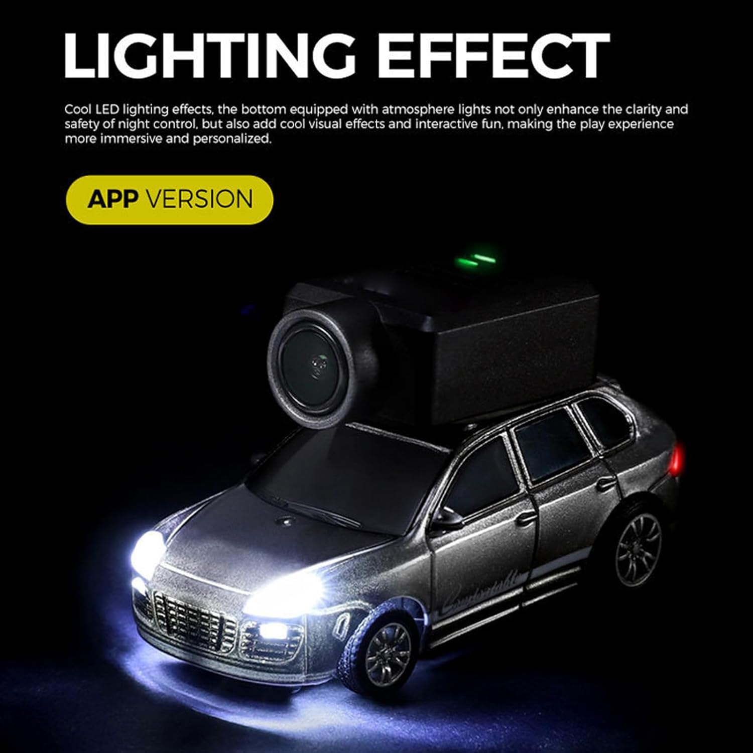 Trasmissione in tempo reale HD: il veicolo a telecomando presenta una fotocamera ad alta definizione integrata, offrendo un'esperienza di vista in prima coinvolgente. Attraverso l'app mobile, consente la trasmissione video non-LAG in tempo reale con elementi visivi chiari e fluidi. Adattabilità a terra-terreno: dotato di pneumatici ad alte prestazioni e un Mecanismo di sospensione rinforzato, la Mini Drift Auto a tre velocità offre una forte trazione e una maneggevolezza stabile. Si comporta in modo eccezionale su pavimenti duri, tappeti e varie superfici interne. Modalità a doppio controllo: l'auto di controllo del telecomando in plastica supporta sia il controllo remoto a 2,4 GHz sia il funzionamento dell'app per smartphone. Il telecomando ha la priorità per un funzionamento più affidabile e una comoda commutazione. Luce ambientale sottoscocca: le luci ambientali installate sotto il corpo del veicolo non migliorano la visibilità e la sicurezza durante la guida notturna, ma creano anche un sentimento visivo abbagliante, aumentando l'immersione e esperienze interattive personalizzate. Geat a tre velocità: la Mini Mini RC Dual Control offre velocità regolabili-Fast, Medium e Lent-che ti consente di selezionare liberamente in base allo scenario. Adatto a diversi livelli di abilità e esigenze ambientali.