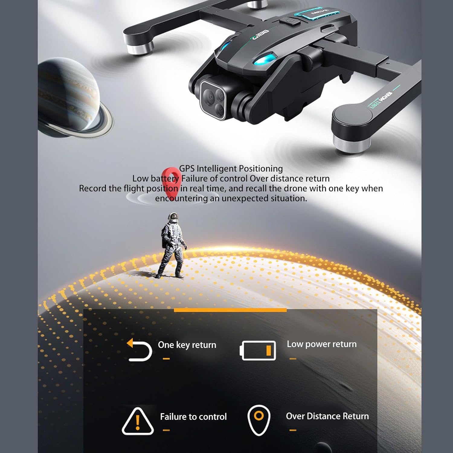FUNZIONI MULTIPLE: Dispone della funzione di localizzazione GPS e della funzione di ritorno con un solo tasto, che può tornare automaticamente in caso di bassa potenza e fuori controllo. Nel frattempo, è dotato di una modalità di regolazione dell'altitudine del flusso ottico e di una funzione di evitamento degli ostacoli su quattro lati, che rende il volo più stabile e sicuro. PIÙ DESIGN: il braccio può essere piegato e la pala eolica può essere piegata per un facile trasporto. Il telecomando è ricaricabile e ha un display retroilluminato, più comodo da usare. La fusoliera è dotata di 8 luci a LED per migliorare la sicurezza e la visibilità del volo. Il cambio di velocità è liberamente commutabile e supporta anche senza testa. FUNZIONE SISTEMA WIFI: può scattare foto, video e trasmettere in tempo reale, con molte funzioni come arresto di emergenza, volo di fondo, surround con un solo tasto, follow intelligente, aggiunta di musica, rotazione dello schermo, visualizzazione della posizione dell'aereo, ecc. FOTOCAMERA HD: Il drone RC è dotato di doppia fotocamera HD integrata. La fotocamera frontale può essere regolata tramite telecomando. Supporta una cornice a 180° per fornire una visione più completa. 6 CANALI CON GIROSCOPIO: è in grado di salire, scendere, avanti, indietro, girare a sinistra, girare a destra, volare a sinistra, volare a destra ecc., il volo è stabile e facile da usare.