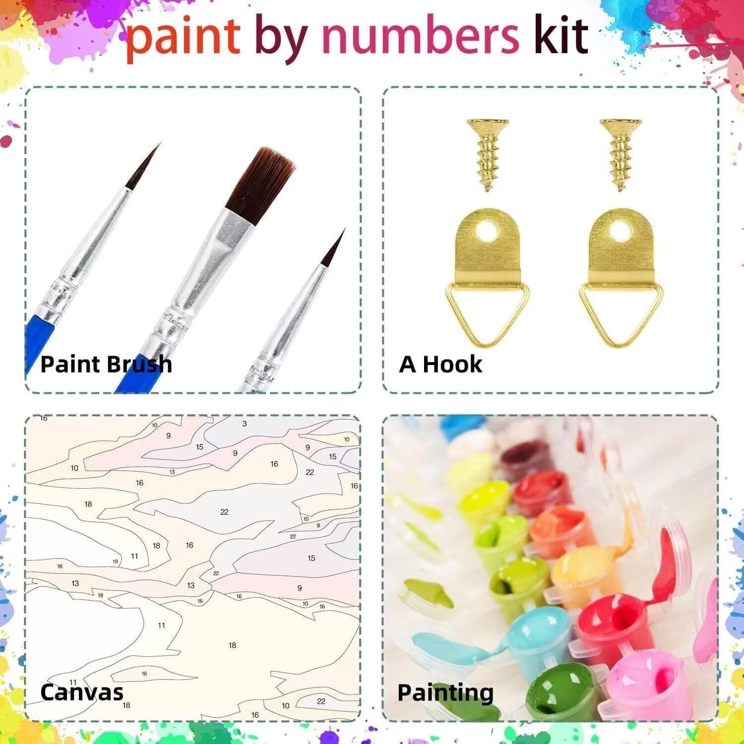【KIT PITTURA ADULTI】: Ogni KIT PITTURA ADULTI con numeri include una tela pre-strutturata e numerata e due ganci per appendere, un set di pittura acrilica, tre tipi di pennelli (senza cornice). Dai pieno gioco alla tua creatività. Se la vernice non è sufficiente, non esitare a contattarci e te li rispediremo 【DIPINGERE CON I NUMERI ADULTI】: Dipingere con i numeri offre molto più di un semplice sbocco creativo. Aiuta a ridurre lo stress concentrando la mente sull'atto rilassante della pittura, migliorando la concentrazione e la consapevolezza. Completare un pezzo aumenta la fiducia e fornisce un senso di realizzazione. migliora le capacità motorie e la coordinazione occhio-mano 【DIPINGERE CON I NUMERI BAMBINI】: Dipingere con i numeri è per i bambini. Nutre la creatività e l'espressione artistica migliorando la concentrazione e la pazienza, aiuta a sviluppare le capacità motorie e la coordinazione occhio-mano, essenziali per la loro crescita complessiva, Completare un dipinto aumenta la loro fiducia e il senso di realizzazione, Stare lontano dai prodotti elettronici 【APPLICAZIONE DELLA Dipingere Con I Numeri】: Non vedo l'ora di vedere le espressioni dei tuoi amici, familiari e persone care quando riceveranno un regalo premuroso che hai disegnato con cura. Può anche essere usato come opera d'arte per abbellire la tua camera da letto, soggiorno, ufficio 【POST-VENDITA】: Credo che il nostro servizio sincero ti offrirà sicuramente un'esperienza diversa e spero che tu possa diventare nostro cliente. Se riscontri un problema, non preoccuparti, contattaci, risponderemo rapidamente e risolveremo il tuo problema