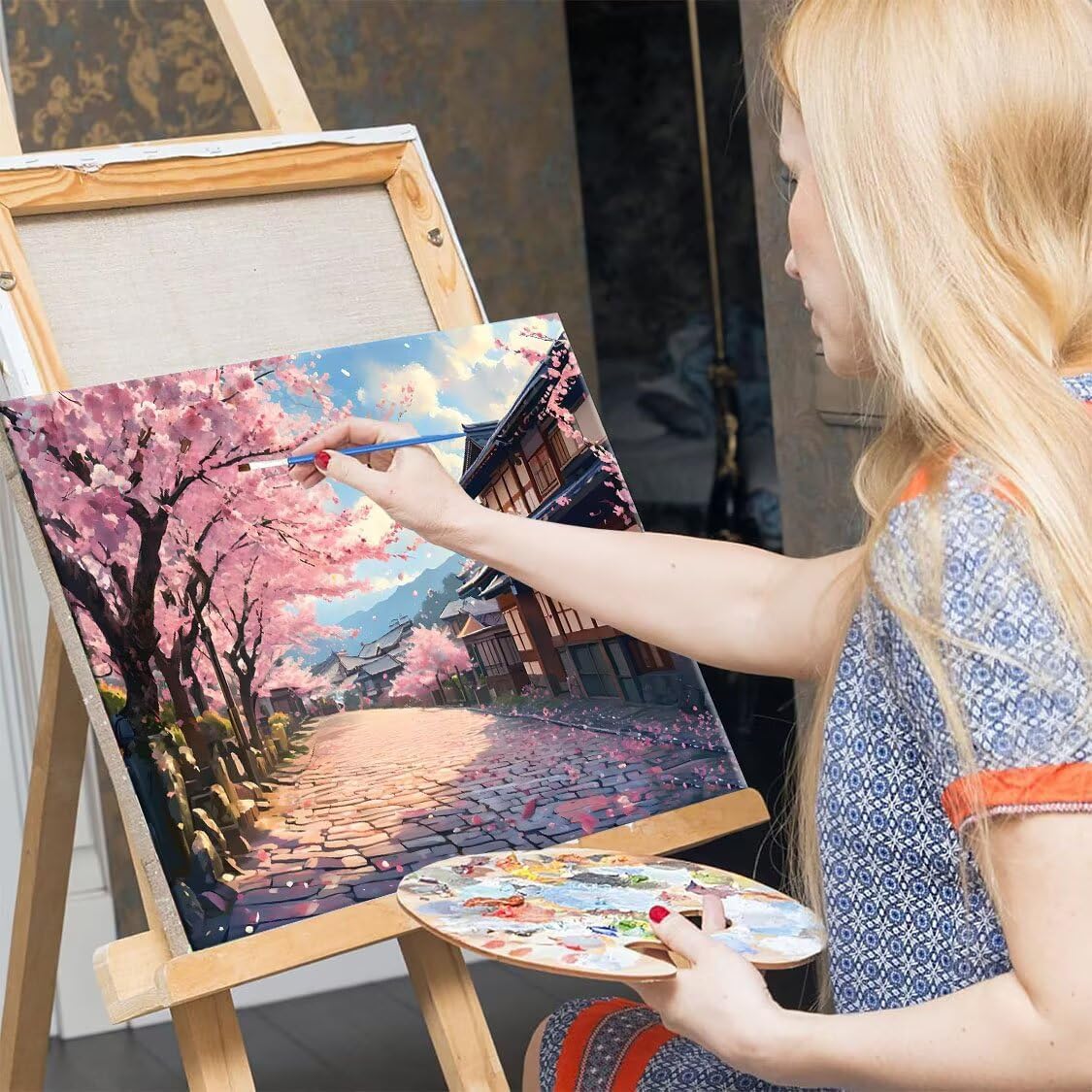 Dipingere Con i Numeri Bambini e Adulti, Cherry Blossoms Street Colorare Con i Numeri Con Pennelli e Colori Acrilici, Kit Fai da te Olio La pittura di Numeri Kit Decorare la casa 50x70cm W-841